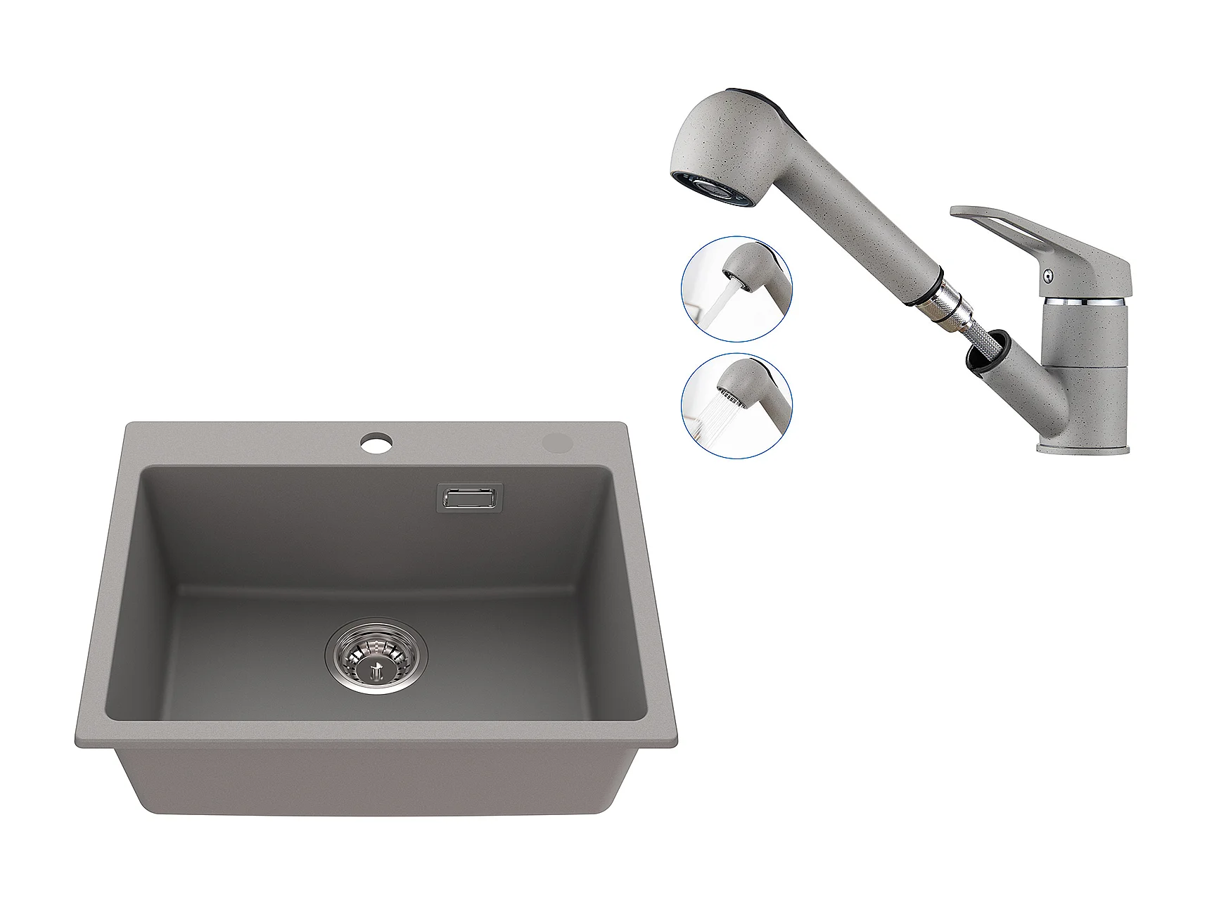 1 Bac Évier Cuisine en Granit,55*45*20cm,Kit de Vidage,Gris+Robinet Cuisine avec Douchette Extractible 2 Jets,Eau Froide/Chaude,Gris