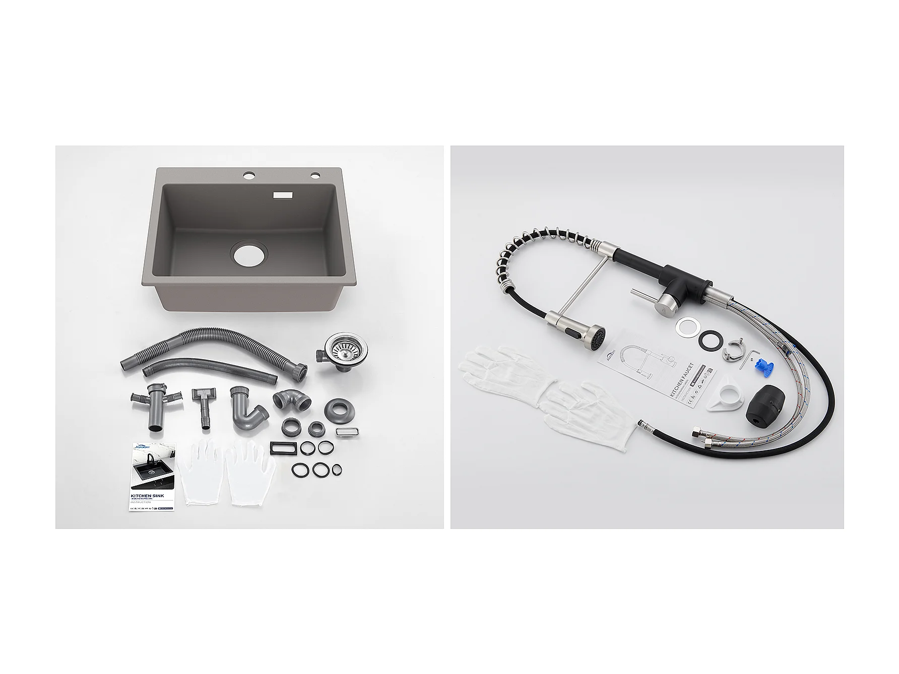 1 Bac Évier Cuisine en Granit,55*45*20cm,Kit de Vidage,Gris+Robinet Cuisine Ressort avec Douchette Extensible,2 Modes,Noir