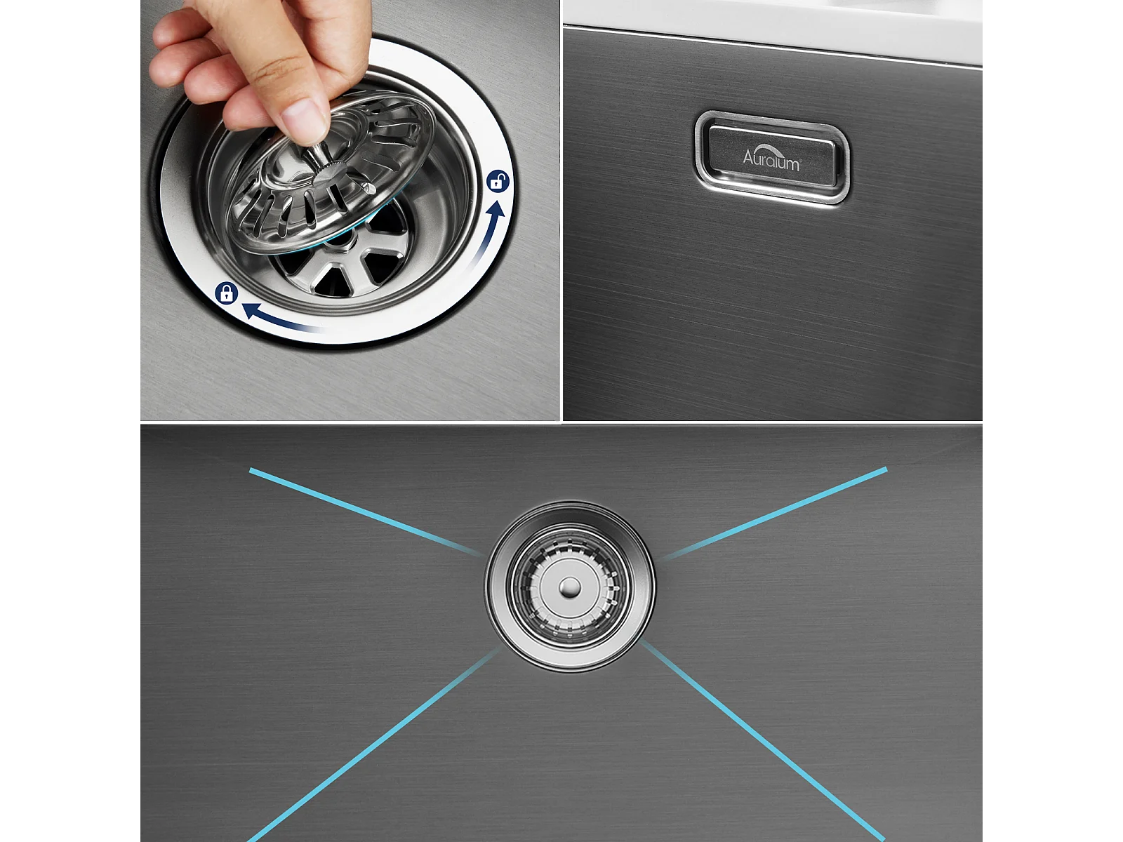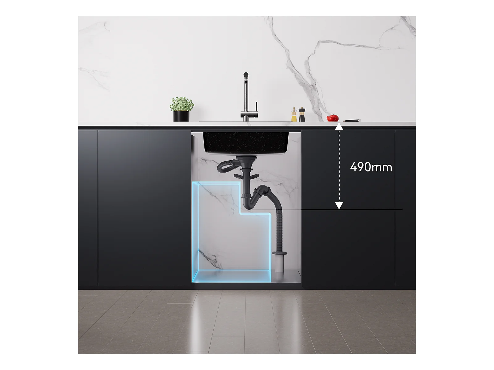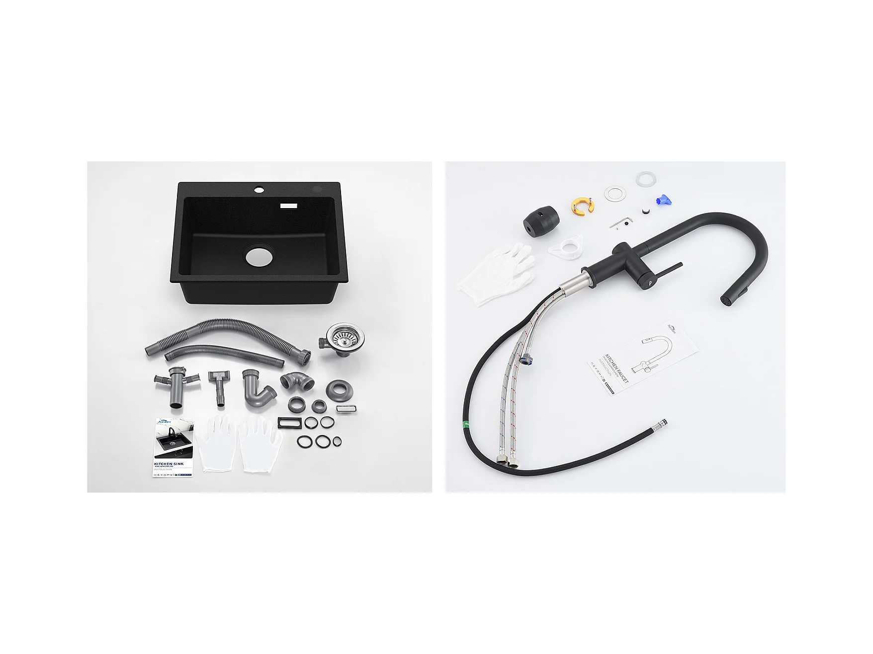 1 Bac Évier Cuisine en Granit,55*45*20cm,Kit de Vidage,Noir  +robinet de cuisine rétractable à deux fonctions, Noir