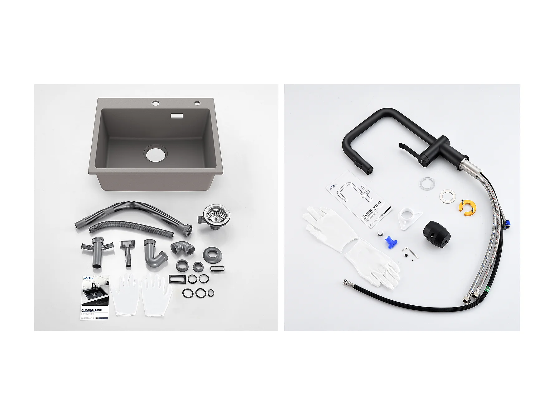 1 Bac Évier Cuisine en Granit,55*45*20cm,Kit Vidage,Gris +Robinet Cuisine avec Douchette Extractible,2 Fonctions, Barboteur démontable,Noir