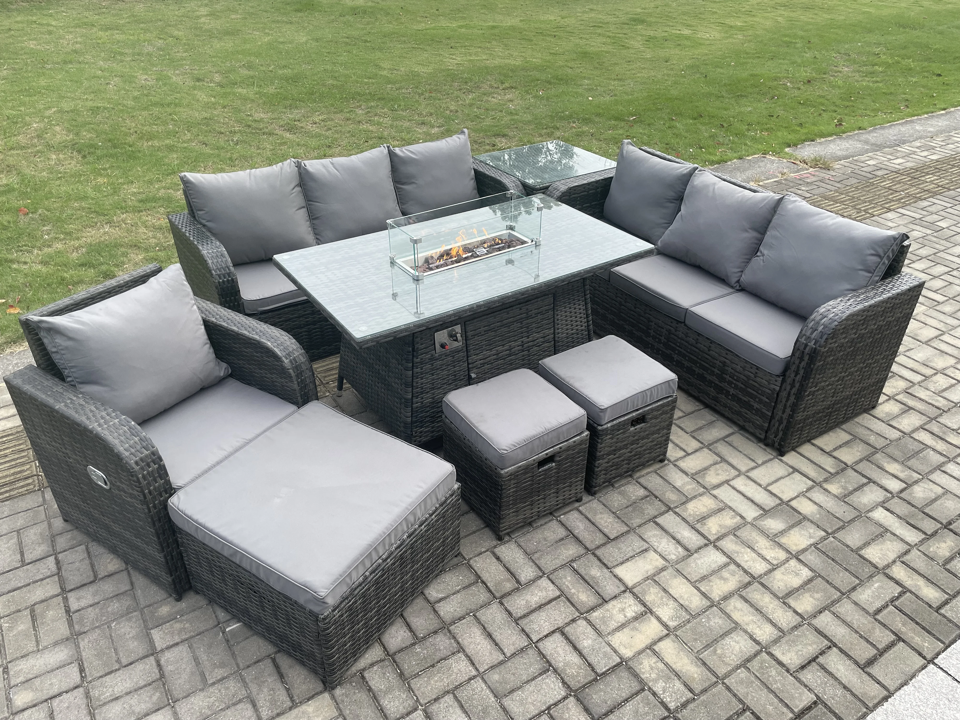 10 places Salon de jardin Table de foyer à gaz Chaise inclinable Canapé 3 places Intérieur Extérieur avec Table d'appoint 3 Tabourets
