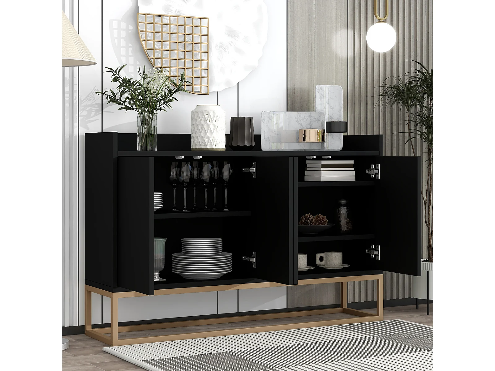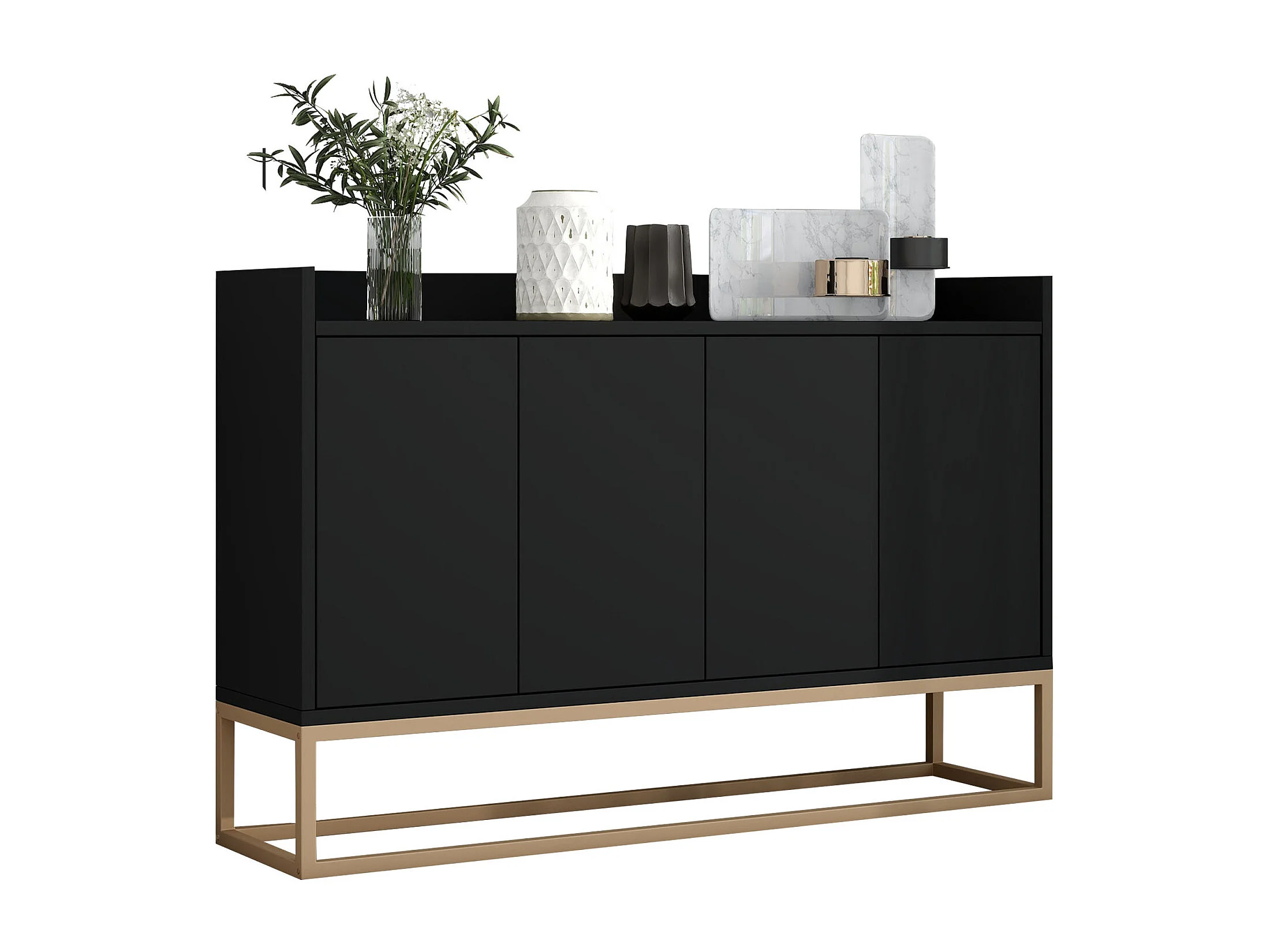 120 × 30 × 80 cm, Cabinet de rangement multifonctionnel - 4 portes Sideboard - sans poignée et base métallique - noir