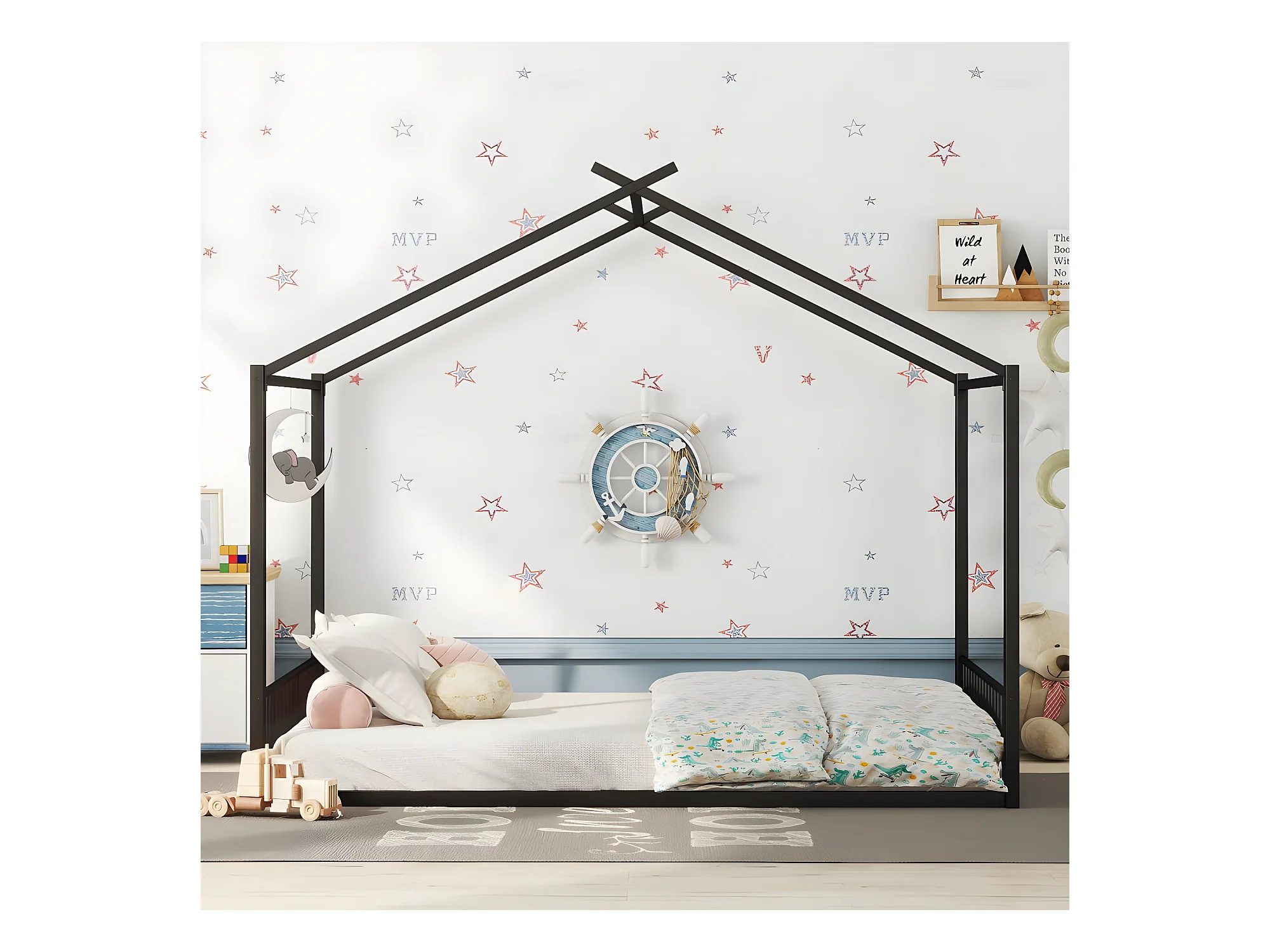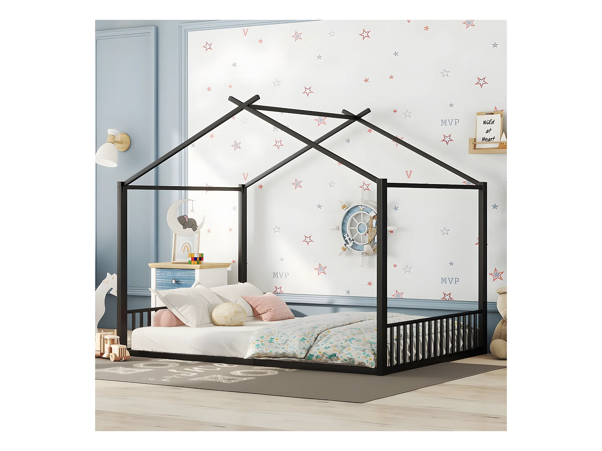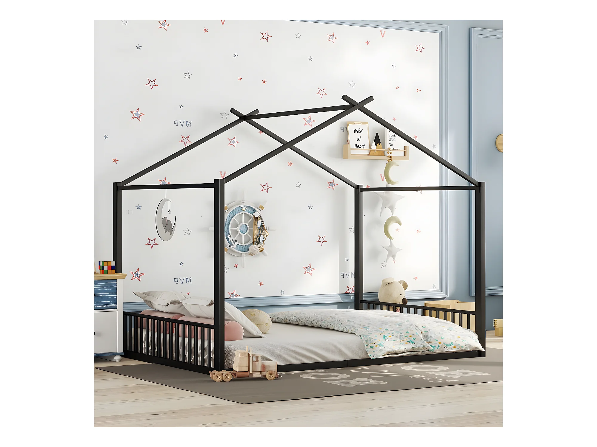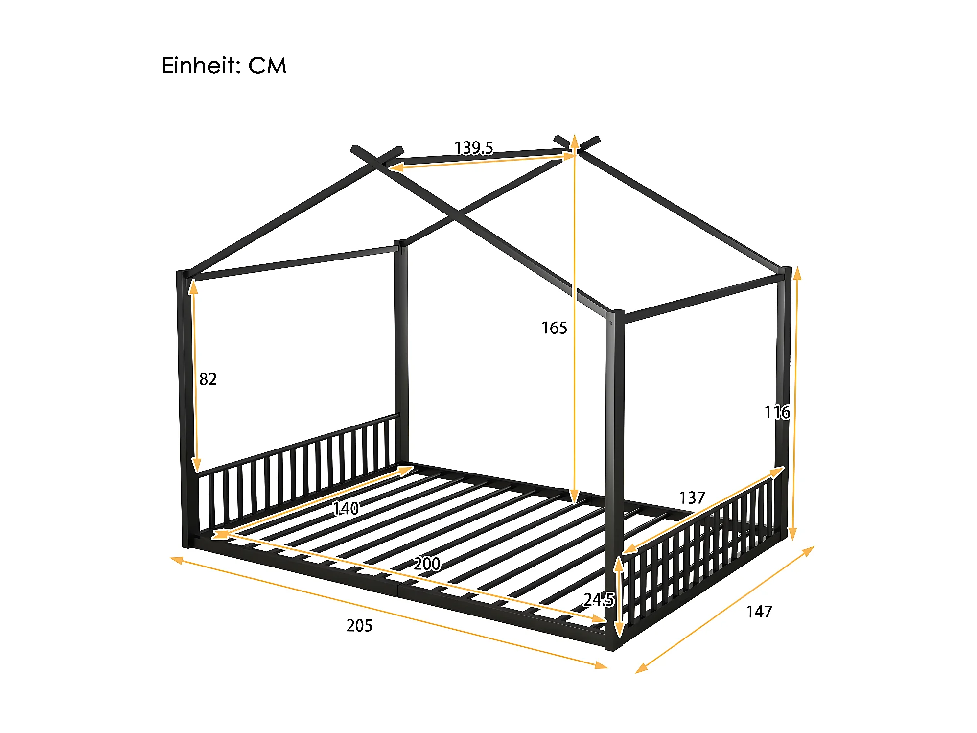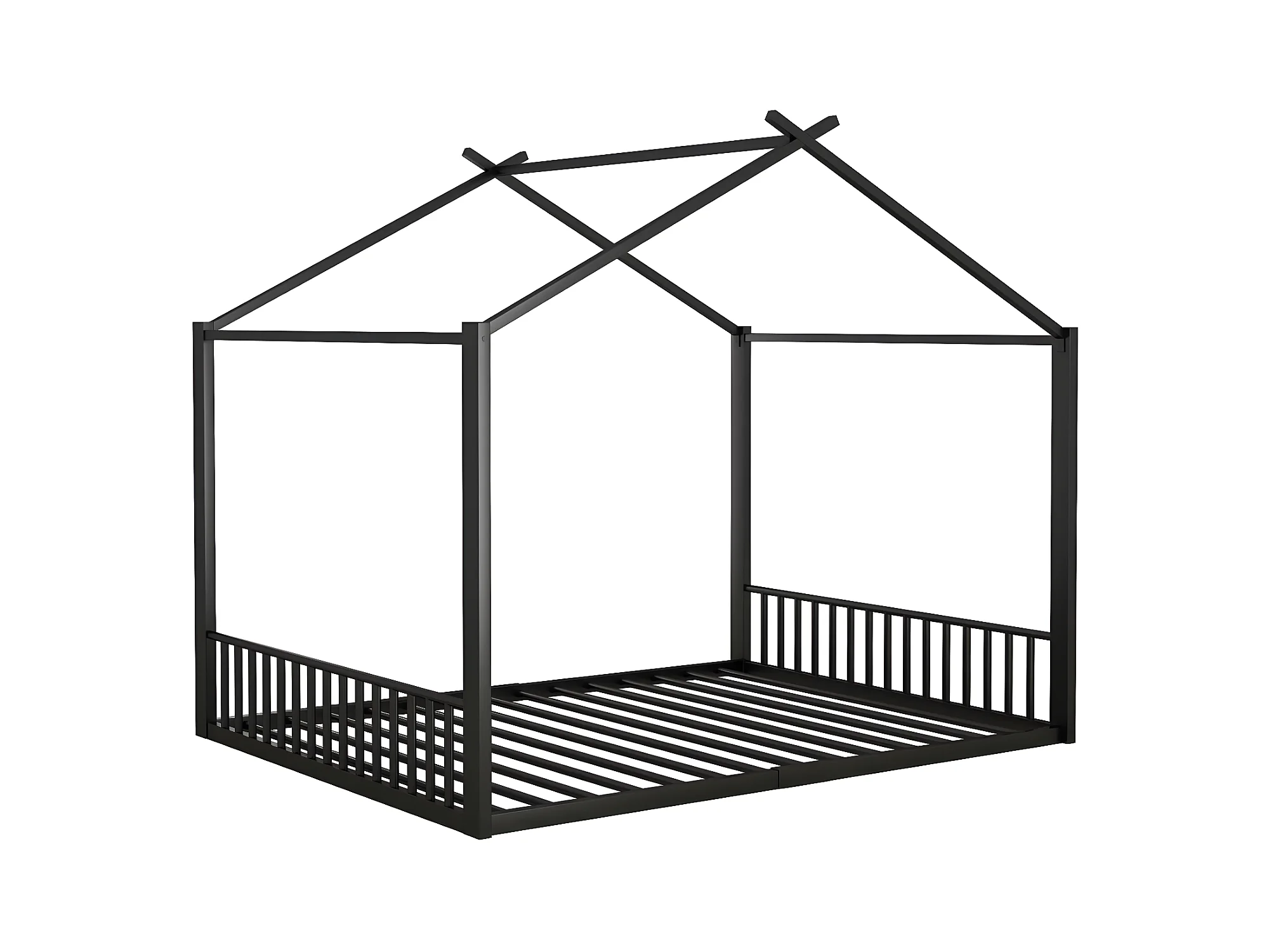 140*200cm lit plat, lit à cadre en fer, lit d'enfant, barre de maison, noir