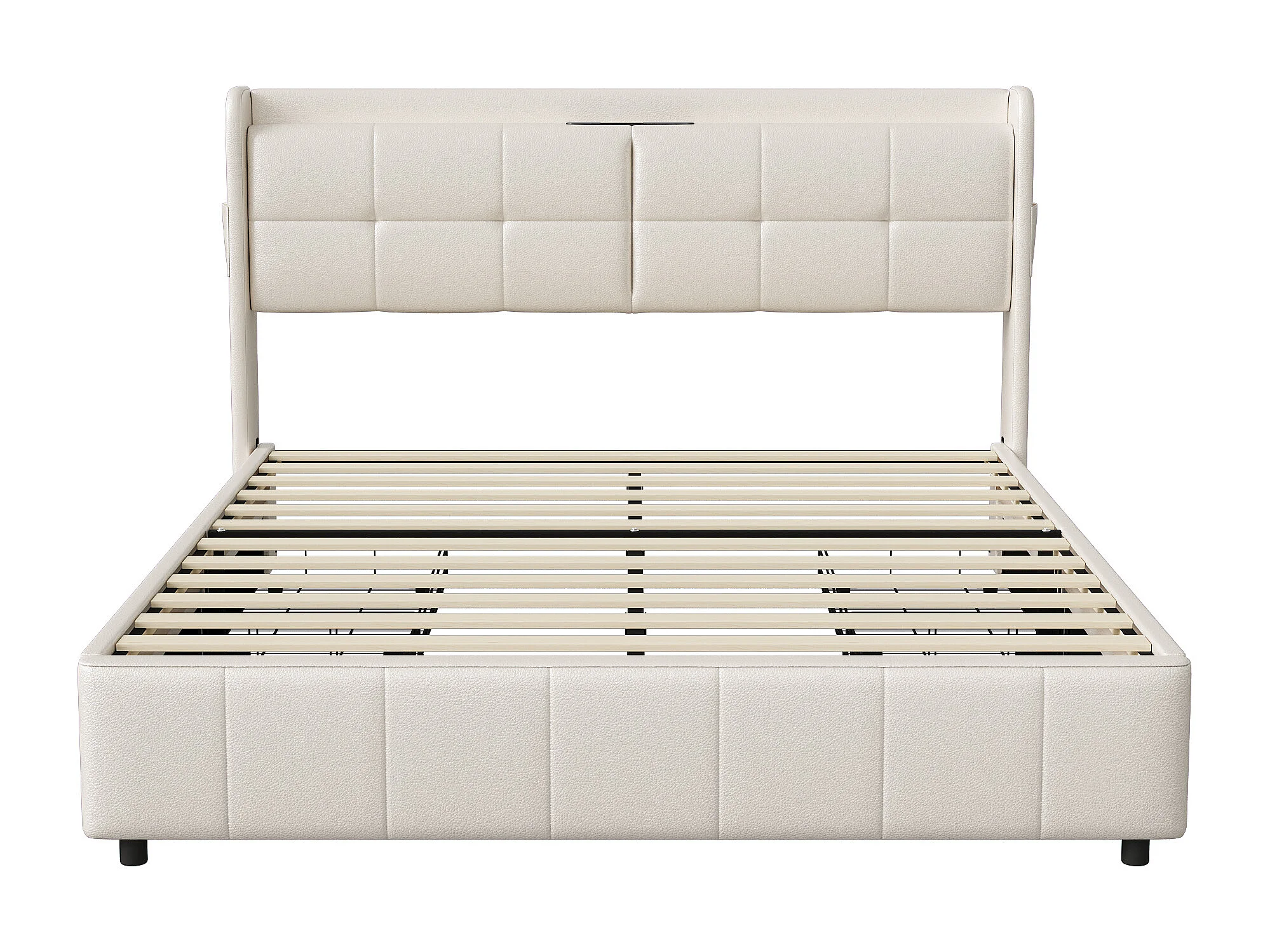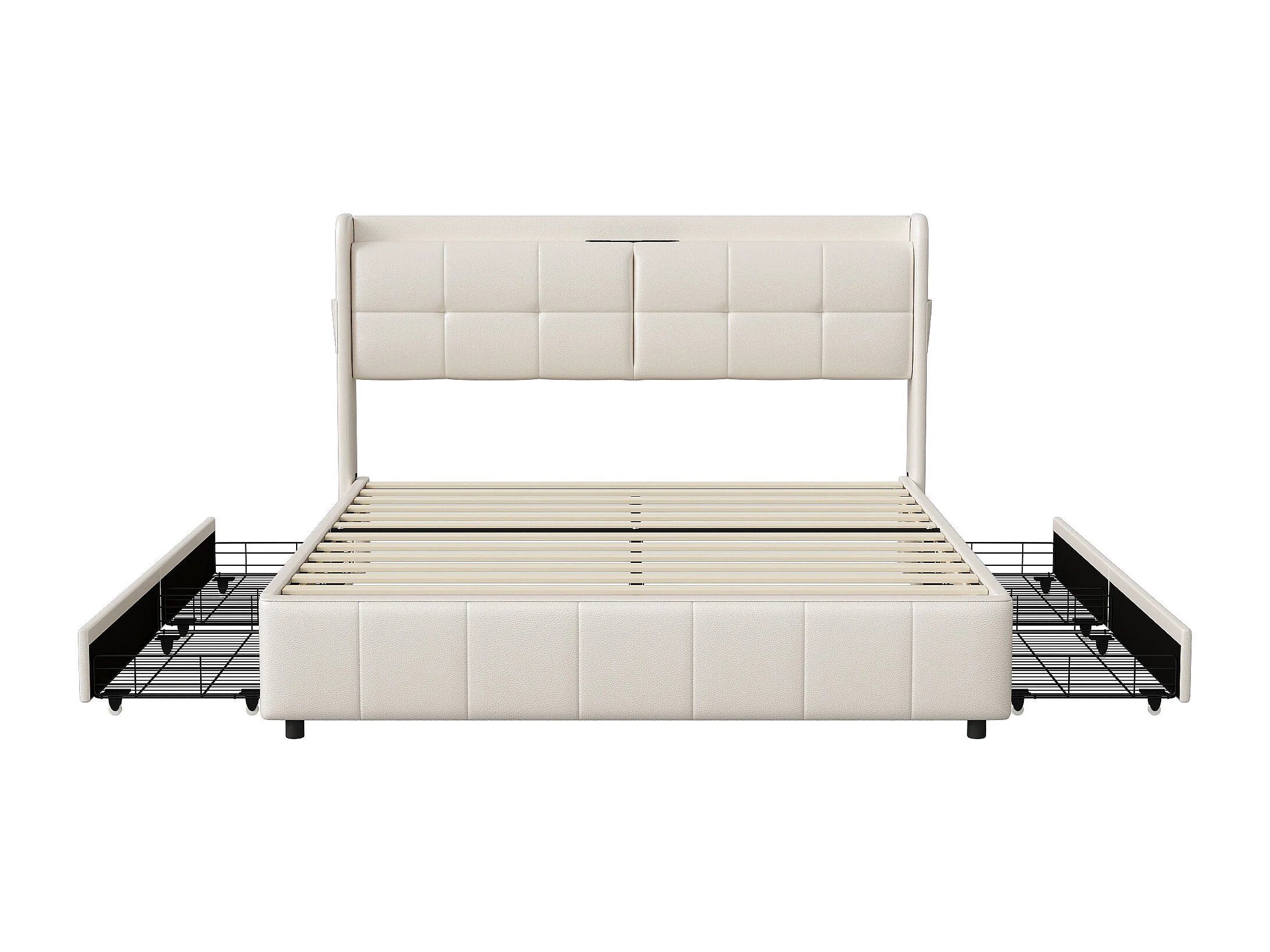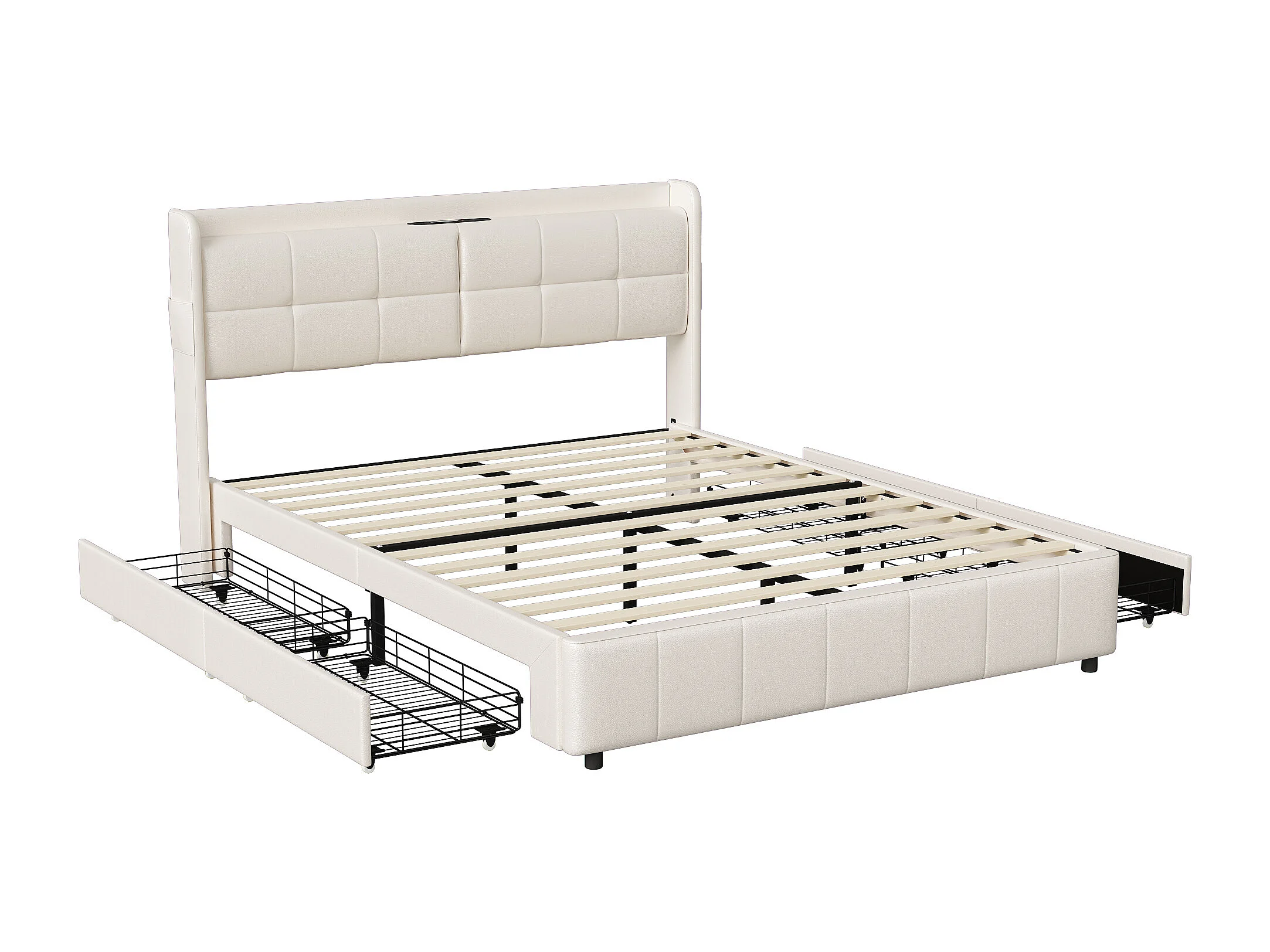 160x200 cm, lit double en cuir PU blanc rembourré - lit de rangement avec 4 tiroirs et fonction de charge USB - lit avec cadre à lames
