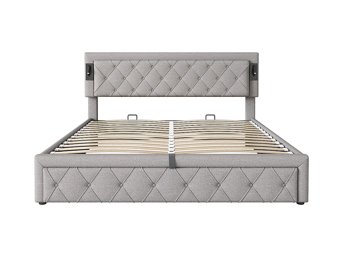 180*200 Lit tapissé avec éclairage d'appoint et port USB, lit de rangement, double, lin, gris