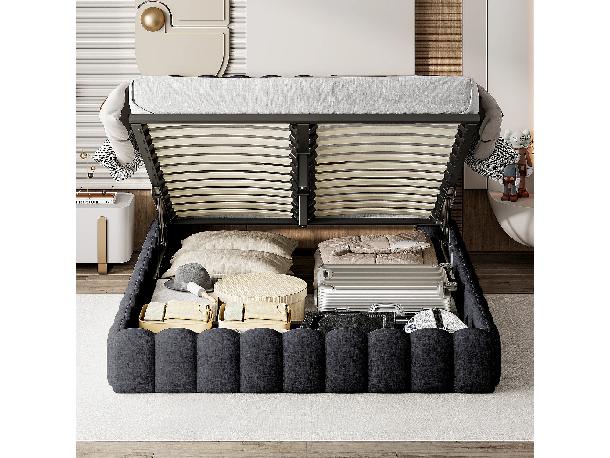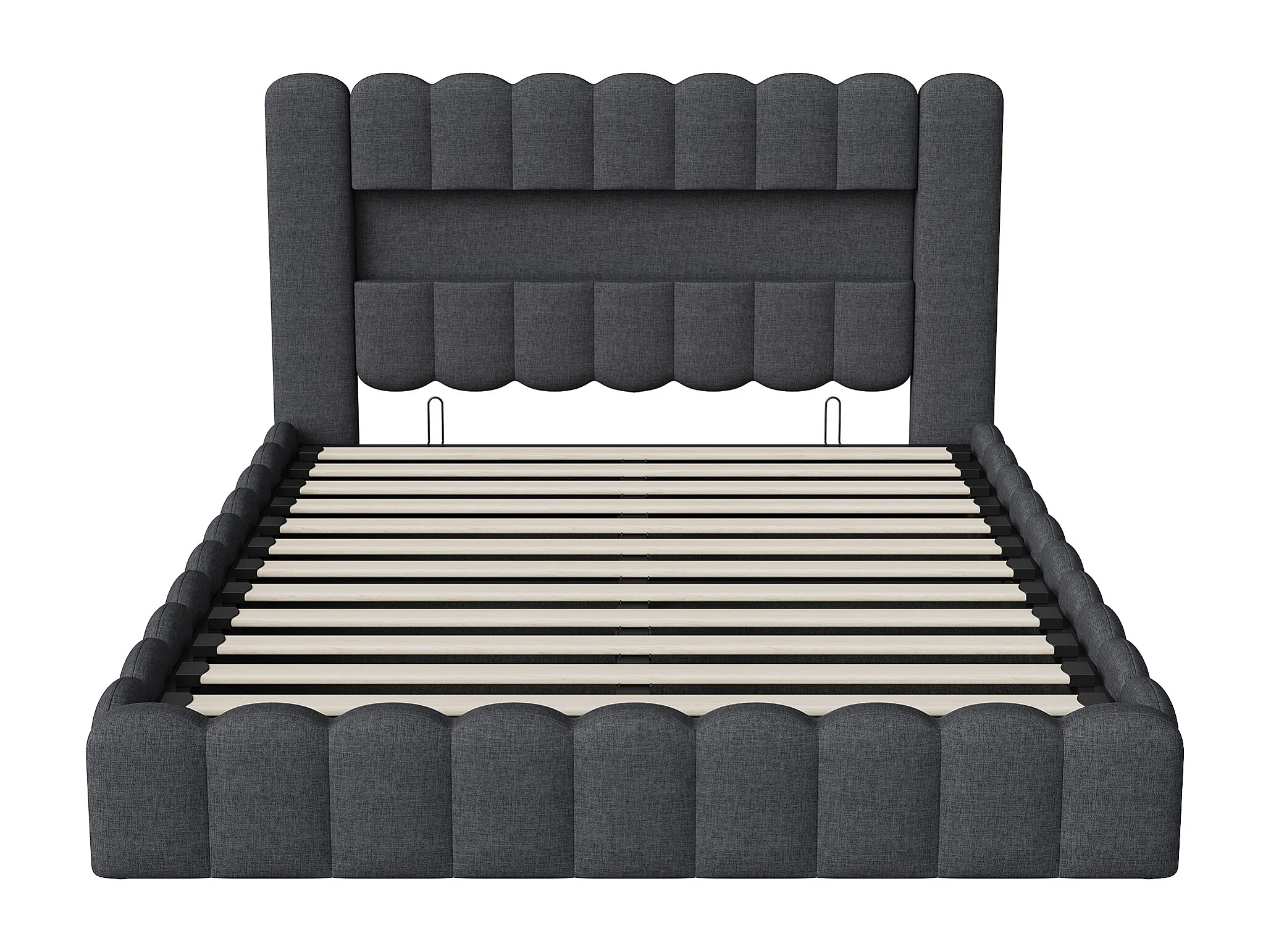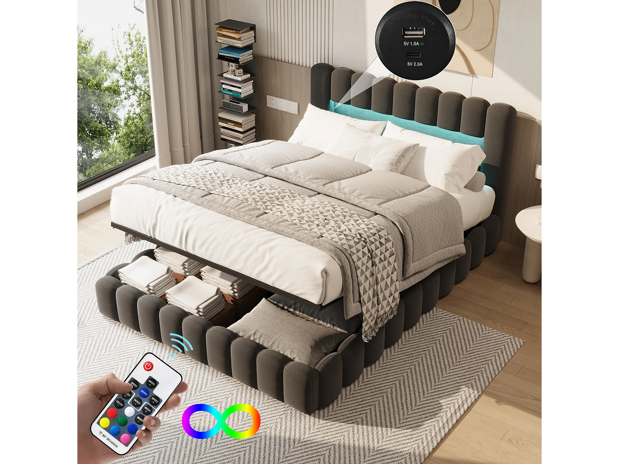 180x200cm, boîte de lit hydraulique de stockage en lin gris avec tête de port de charge LED et USB - cadre de lit double