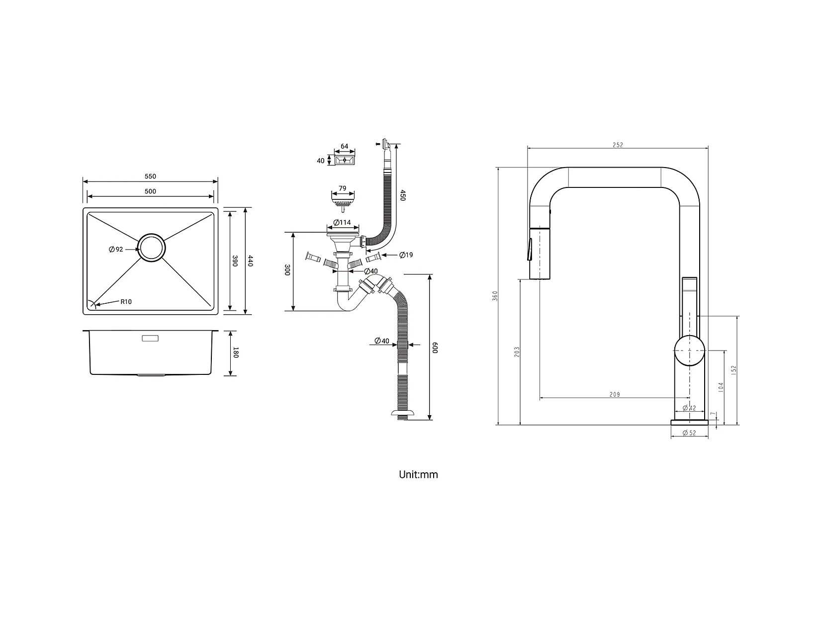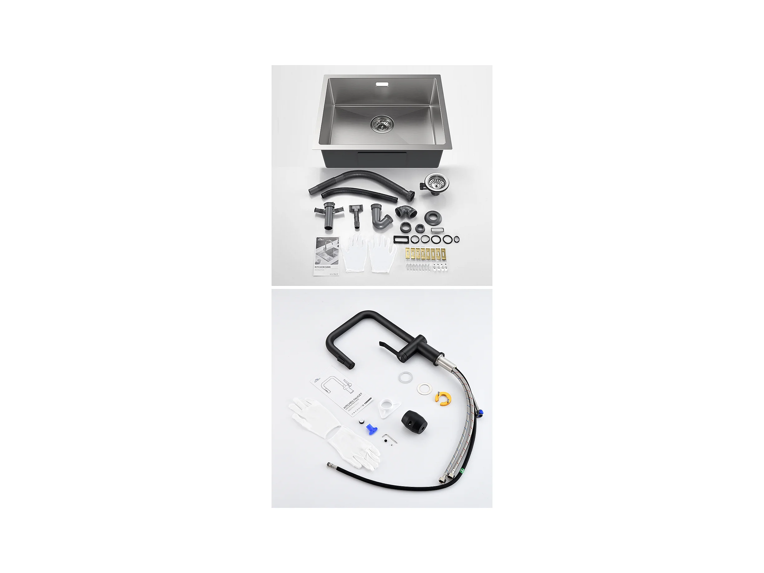 2 en1 Évier Cuisine 1 Bac 55*44*19CM,Brossé+RobinetCuisine avec Douchette Extractible Rotatif 360 °2 Fonctions, Barboteur démontable,Noir