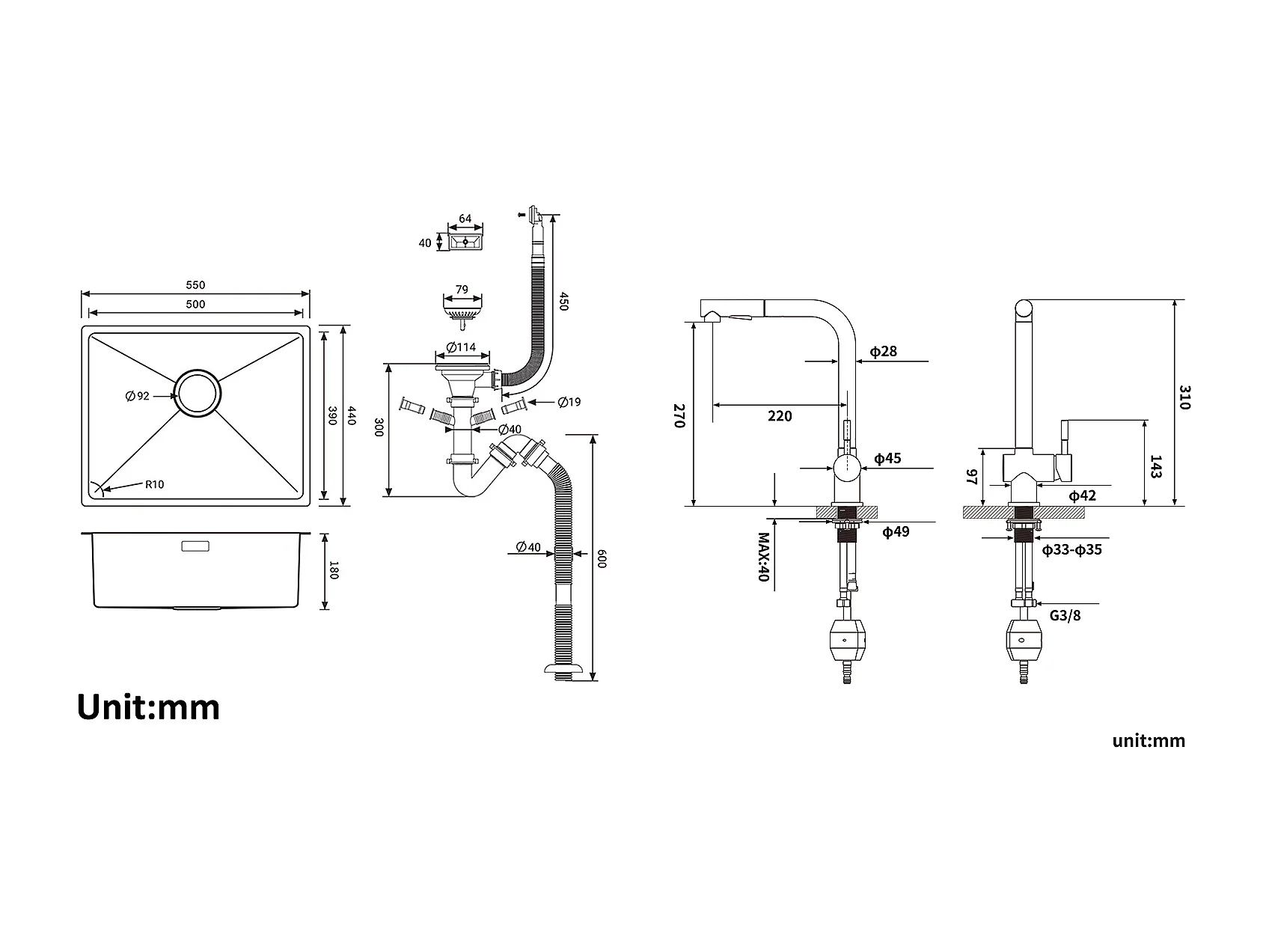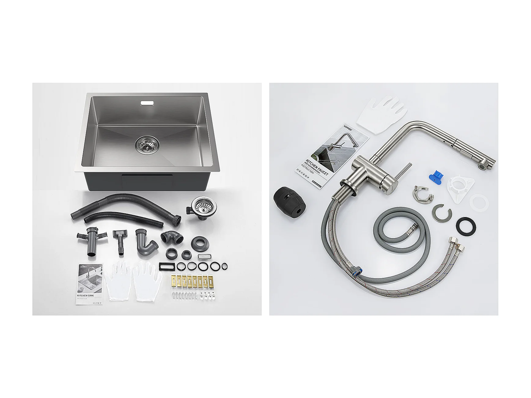 2 en1 Évier de Cuisine 1 Bac 55*44*19CM, à Encastrer/Fleur/ Sous-Plan, Brossé+Robinet Cuisine Douchette Extractible Deux Jets Pivotant 360°