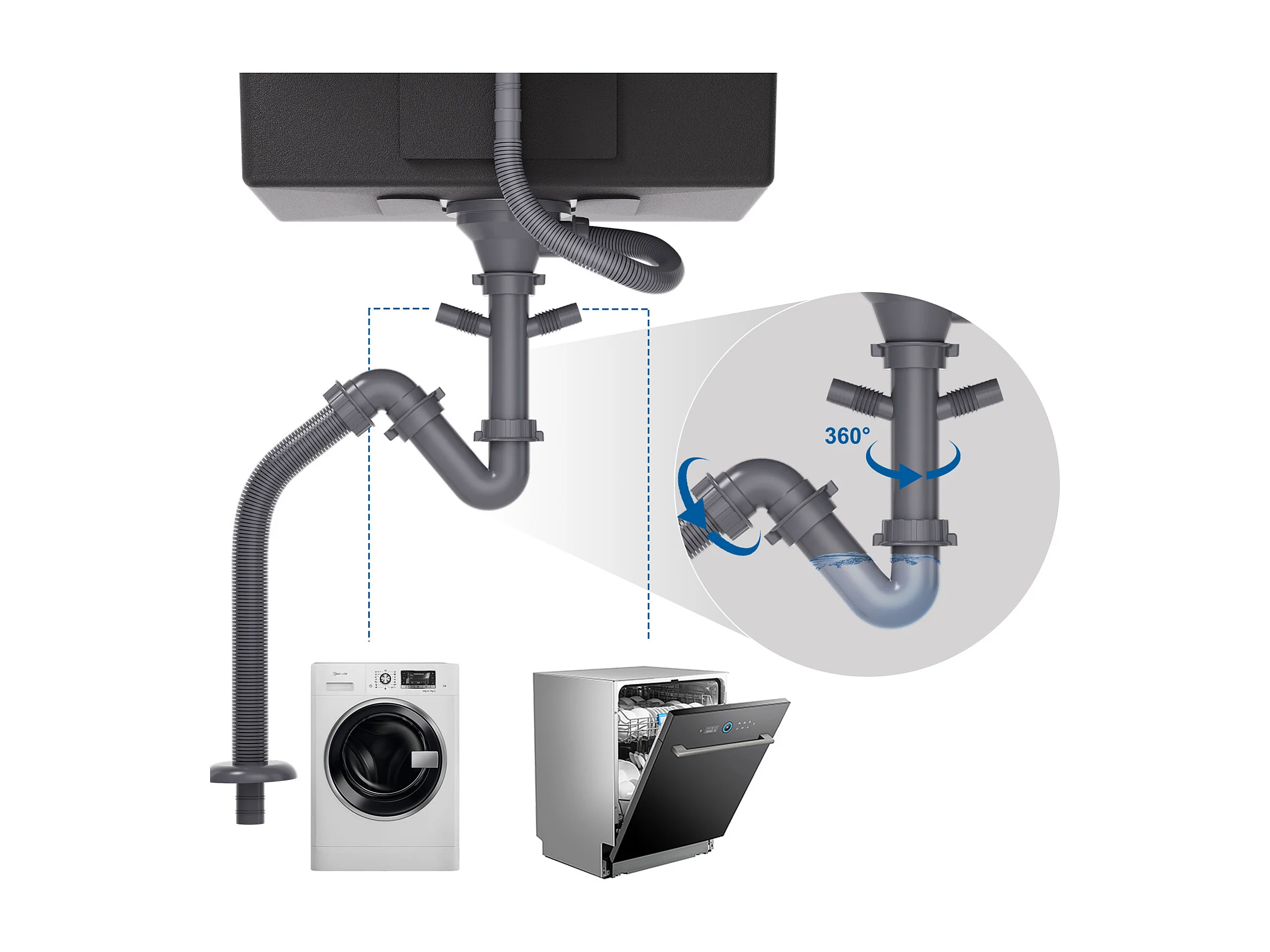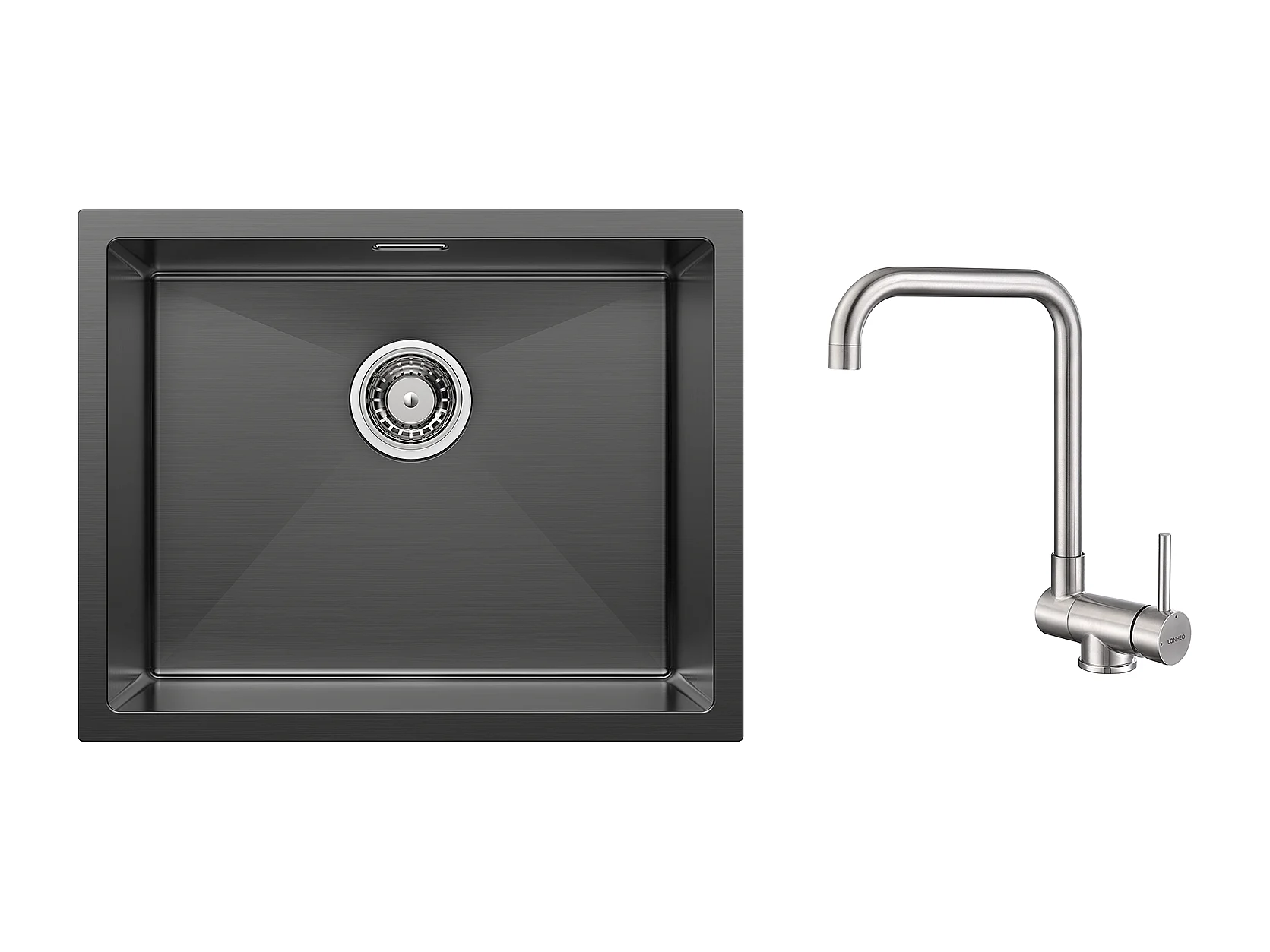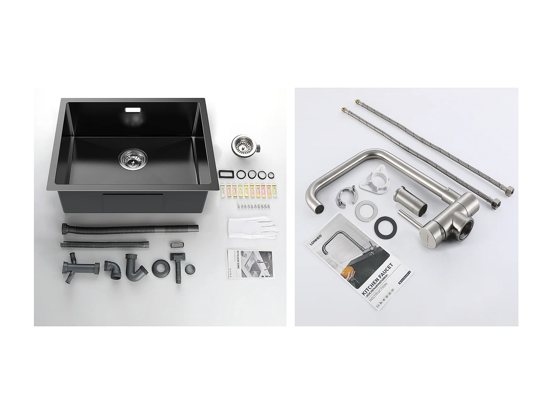 2 en1 Évier de Cuisine 1 Bac 55*44*19CM, à Encastrer/Fleur/ Sous-Plan, Noir +Robinet Cuisine Douchette Extractible Gris Foncé Rotatif 360 °