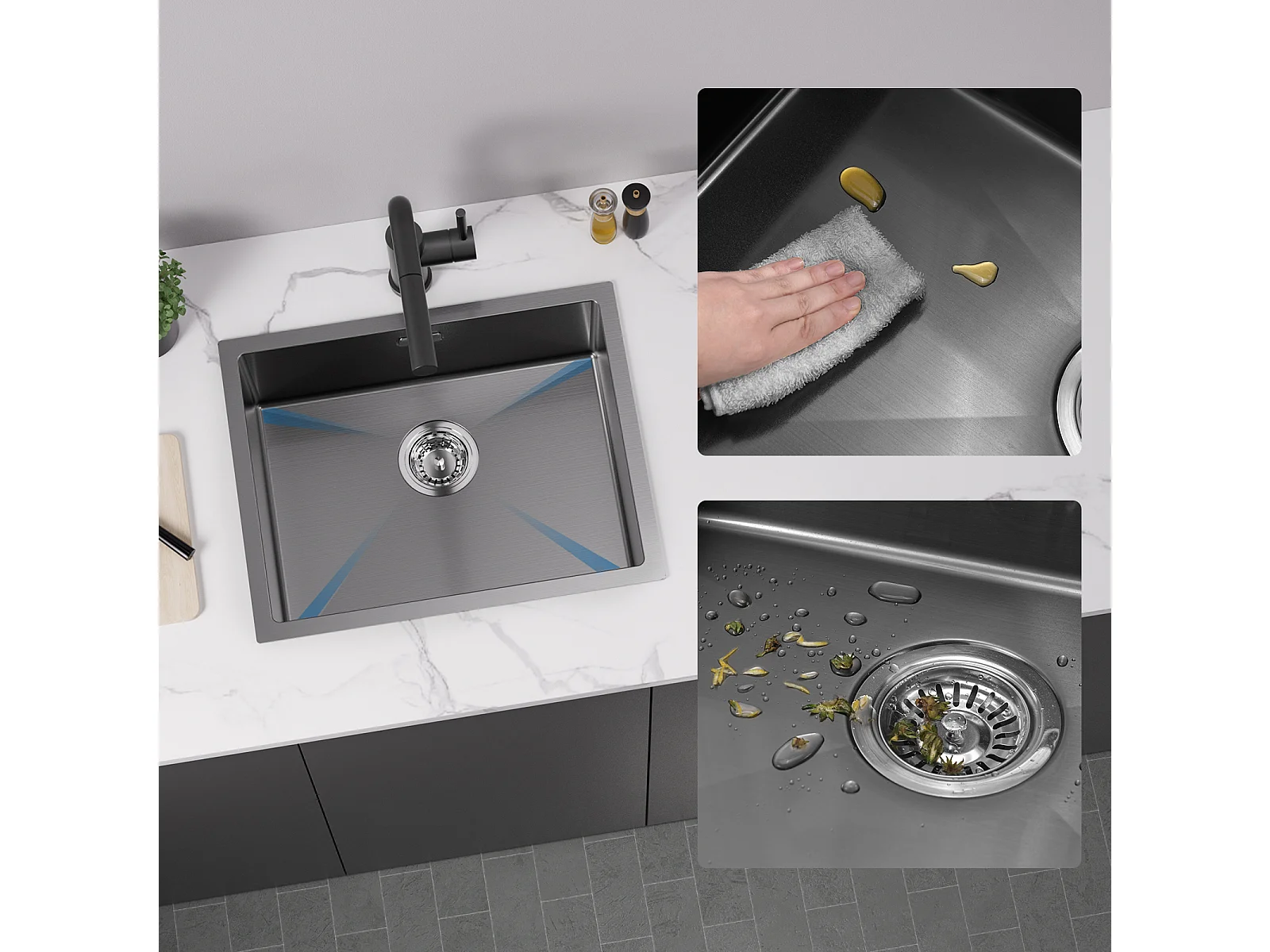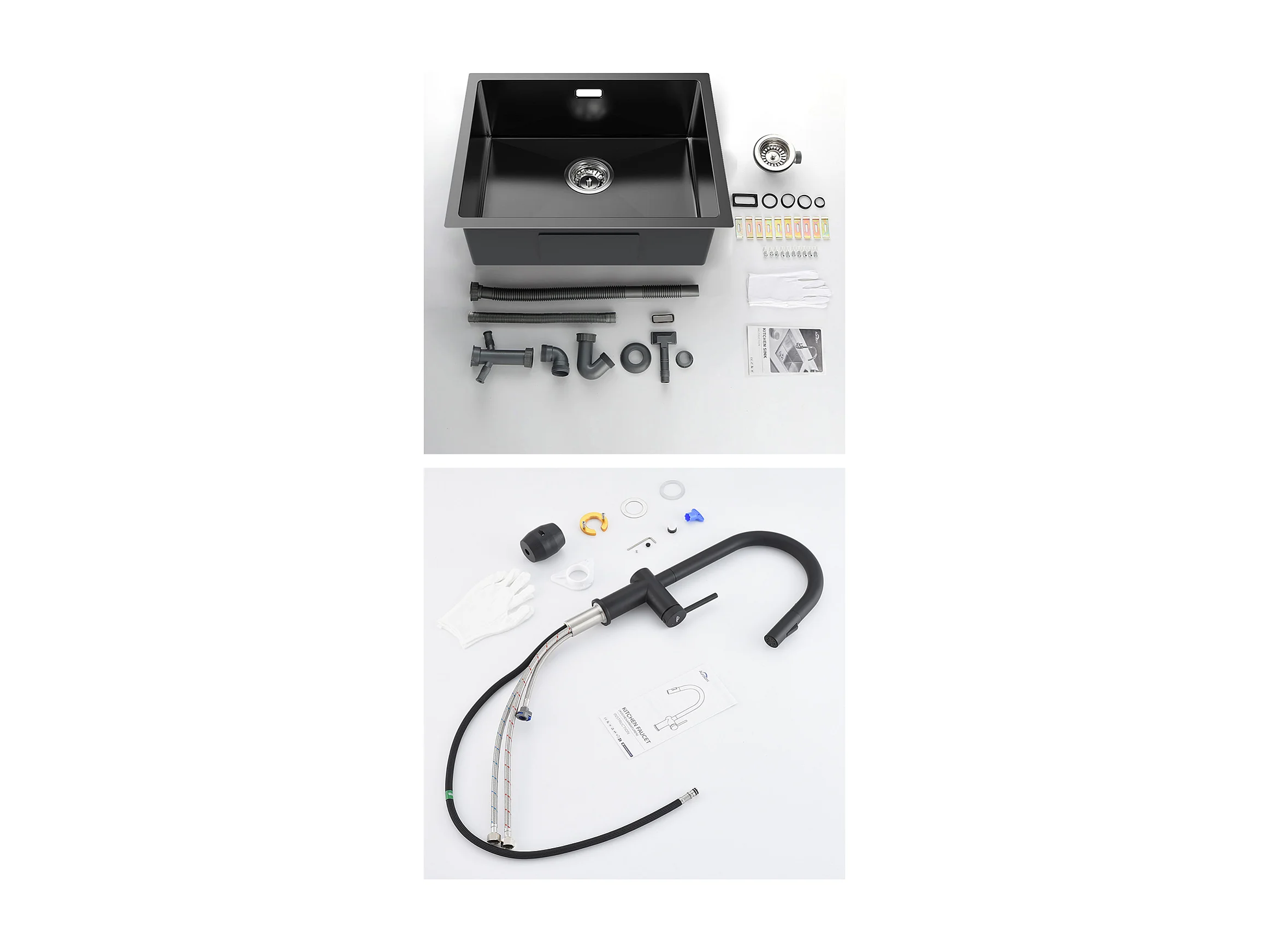 2 en1 Évier de Cuisine 1 Bac 55*44*19CM,à Encastrer/Fleur/ Sous-Plan+robinet de cuisine rétractable à deux fonctions, Noir