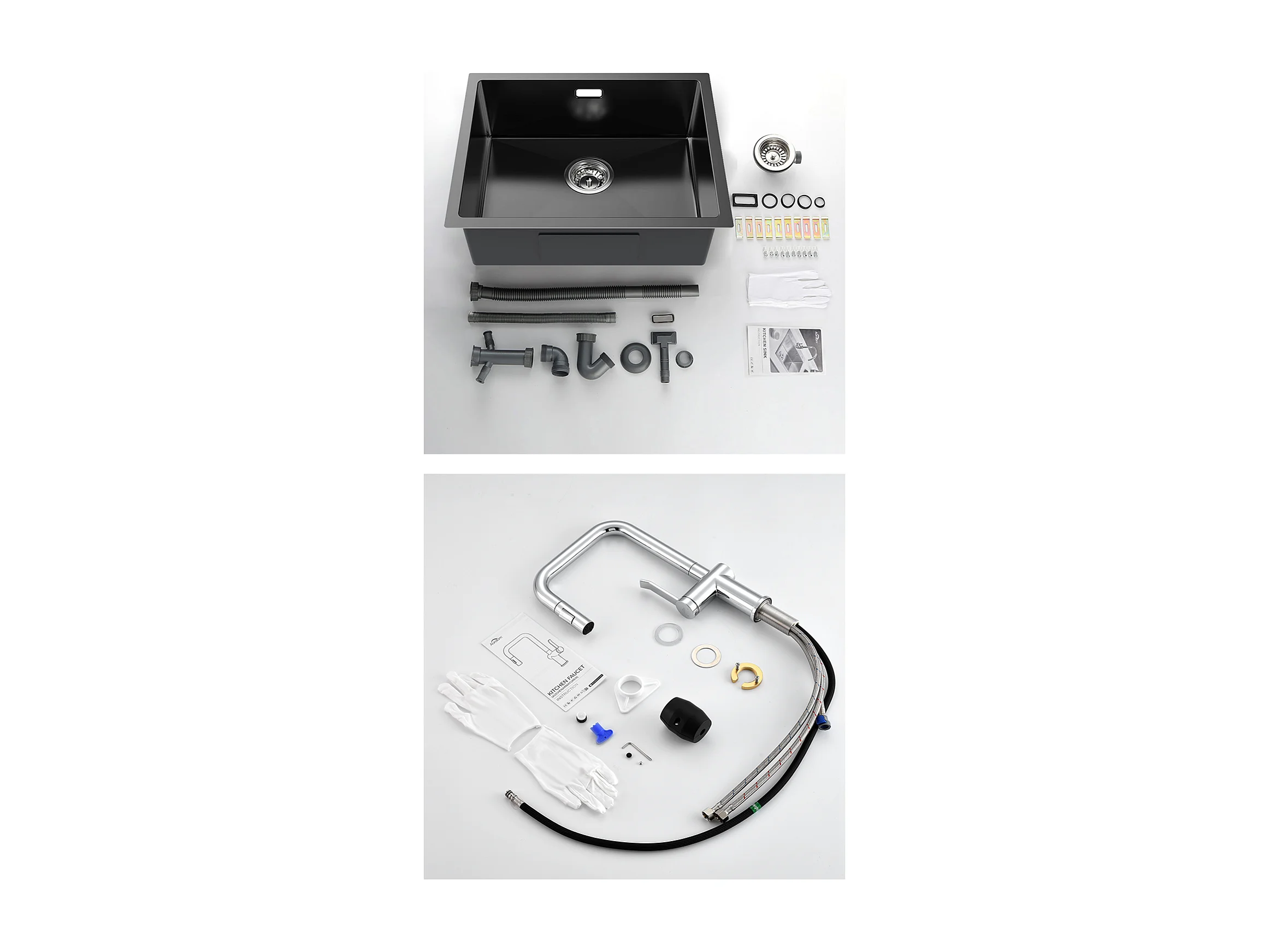 2 en1 Évier de Cuisine 1 Bac 55*44*19CM+Robinet de Cuisine avec Douchette Extractible Rotatif 360 °2 Fonctions, Barboteur démontable,Chromé