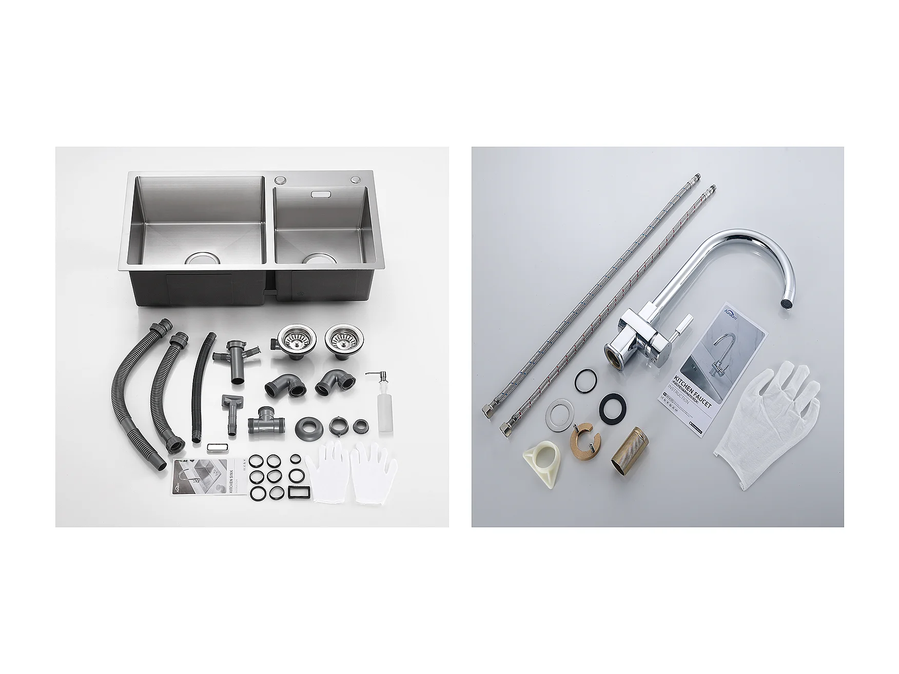 2 en1 Évier de Cuisine 2 Bac 75x45x19cm,Encastré/ à Poser avec Distributeur de Savon+Robinet Cuisine Chromé Pivotant 360° Eau Froide /Chaude