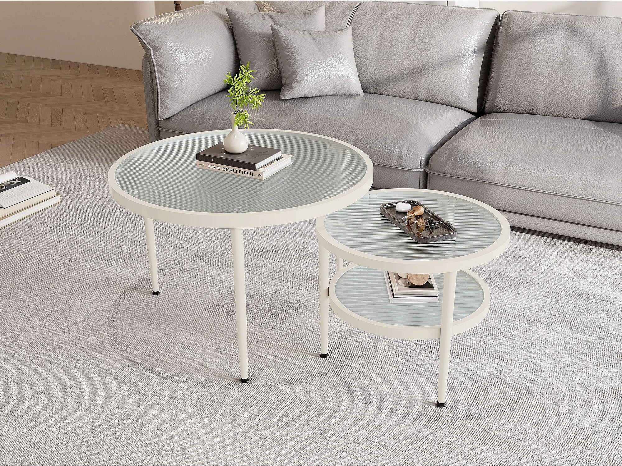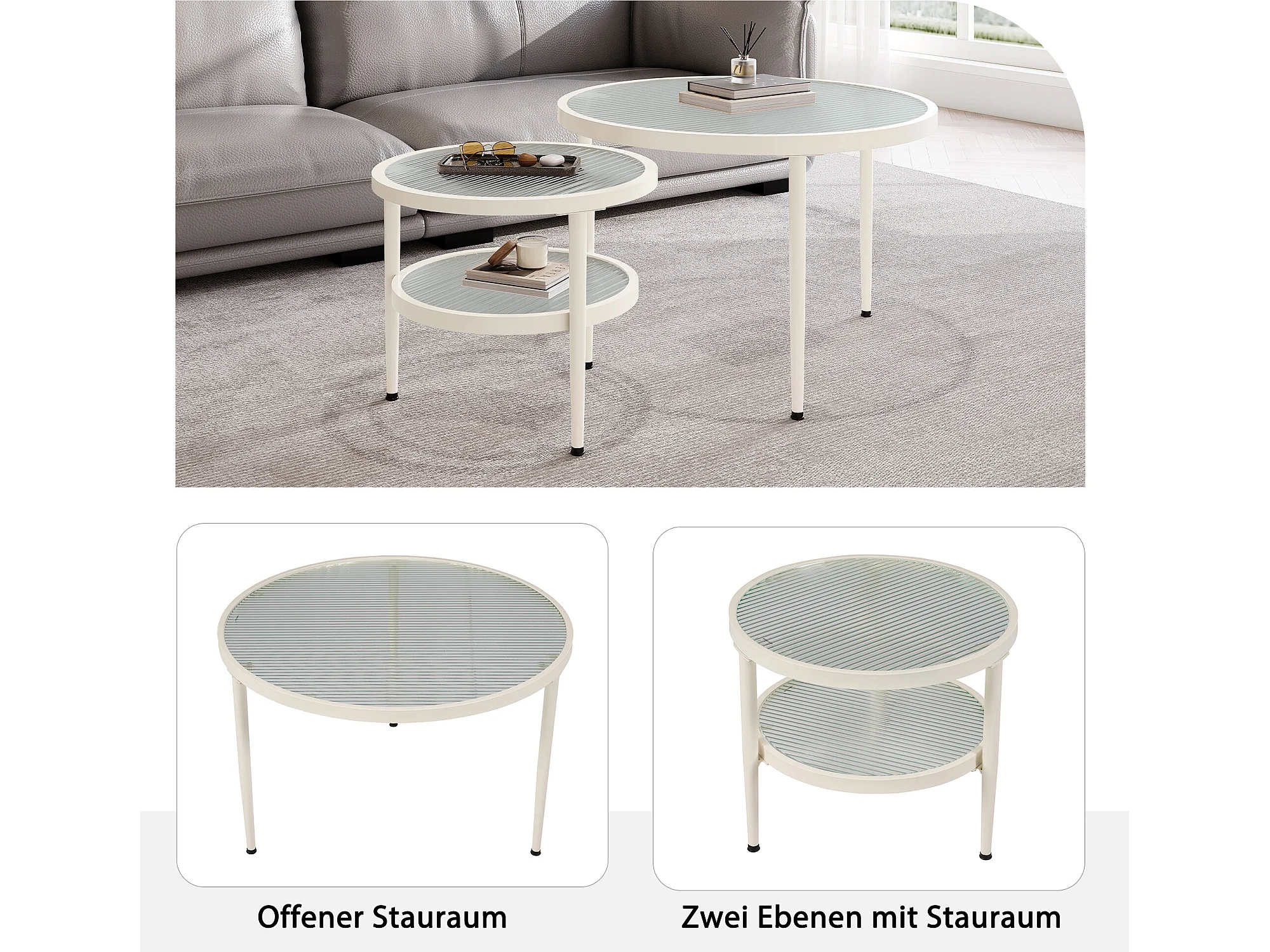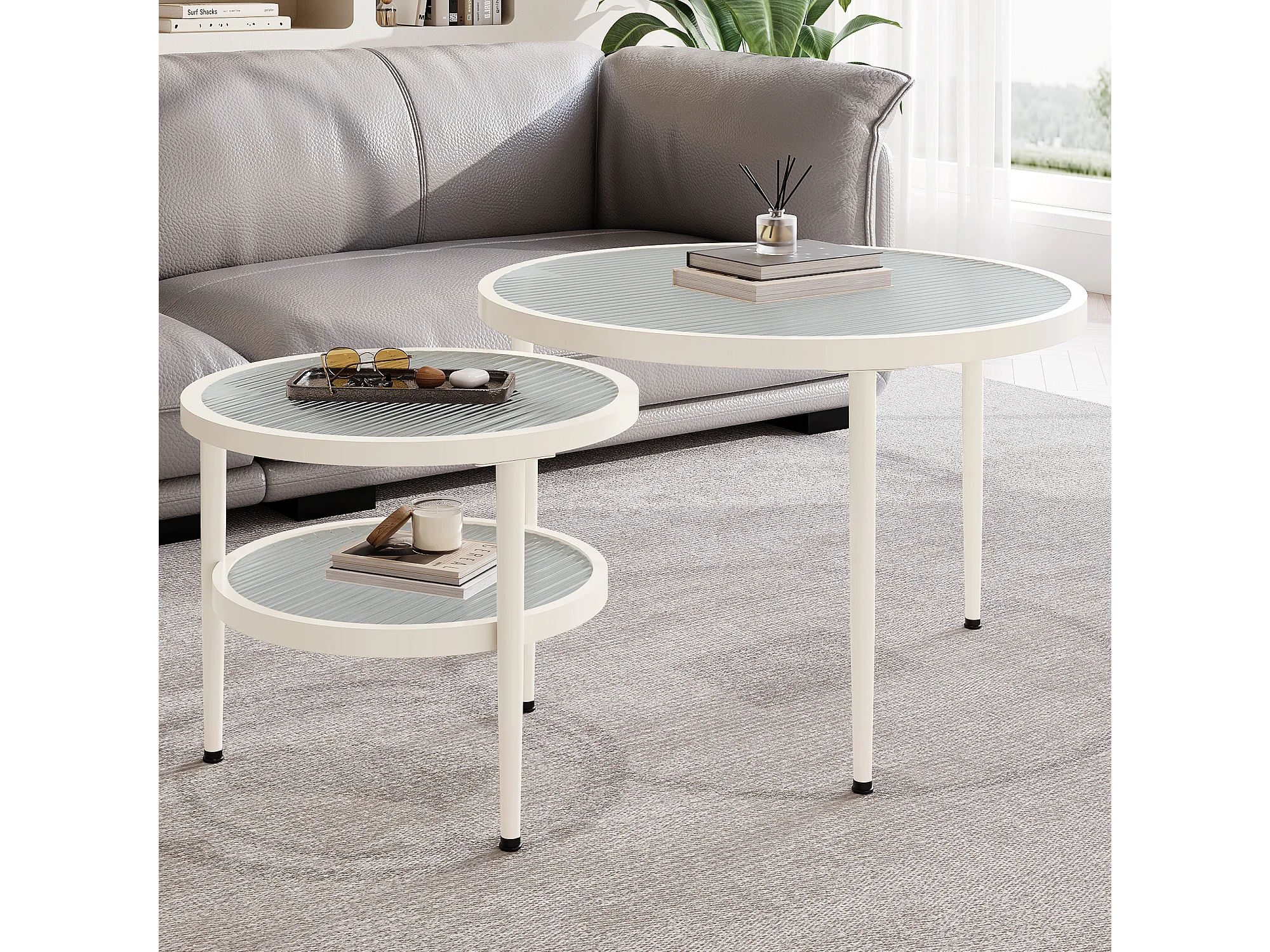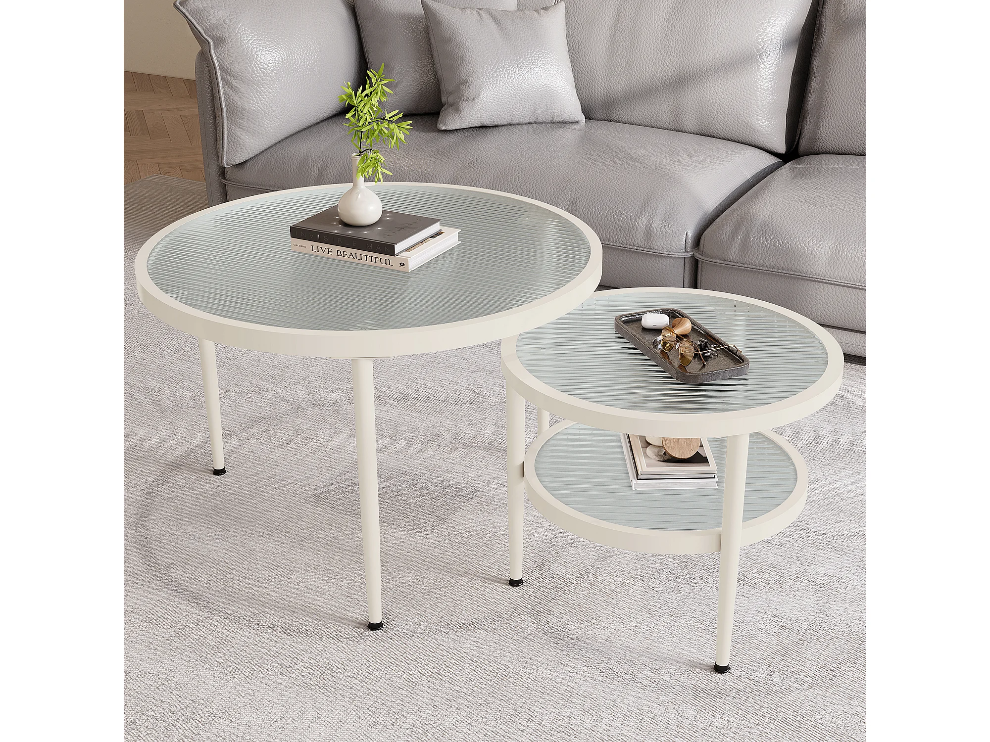 2 pièces ensemble de tables basses rondes, plateau en verre ondulé, finition blanc crème