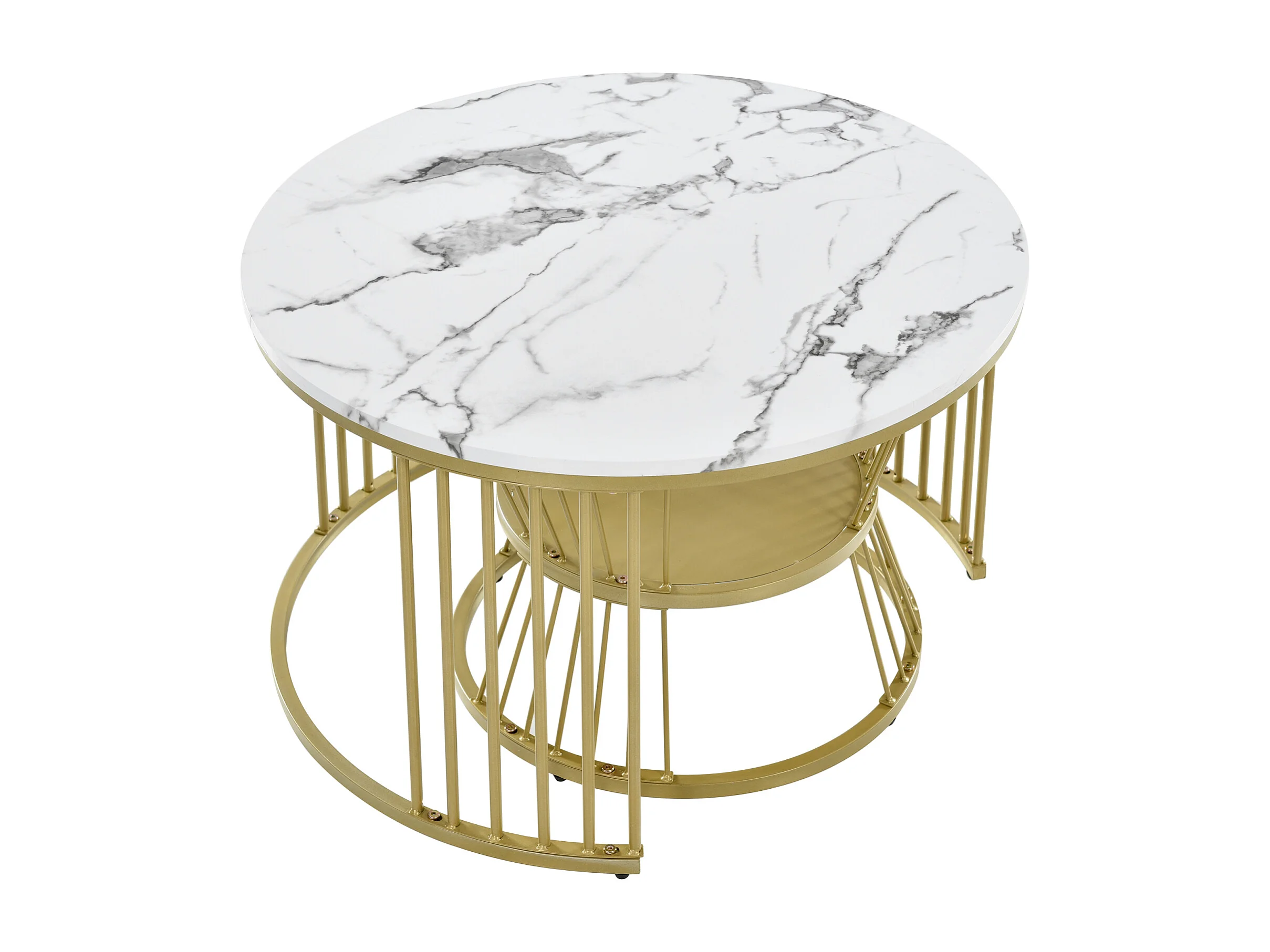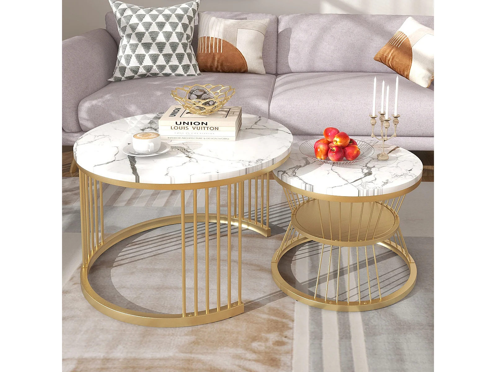 2pcs ronde moderne nidification table basse ensemble - Couleur d'or cadre en marbre placage canapé tables latérales - Tables de fin - blanc