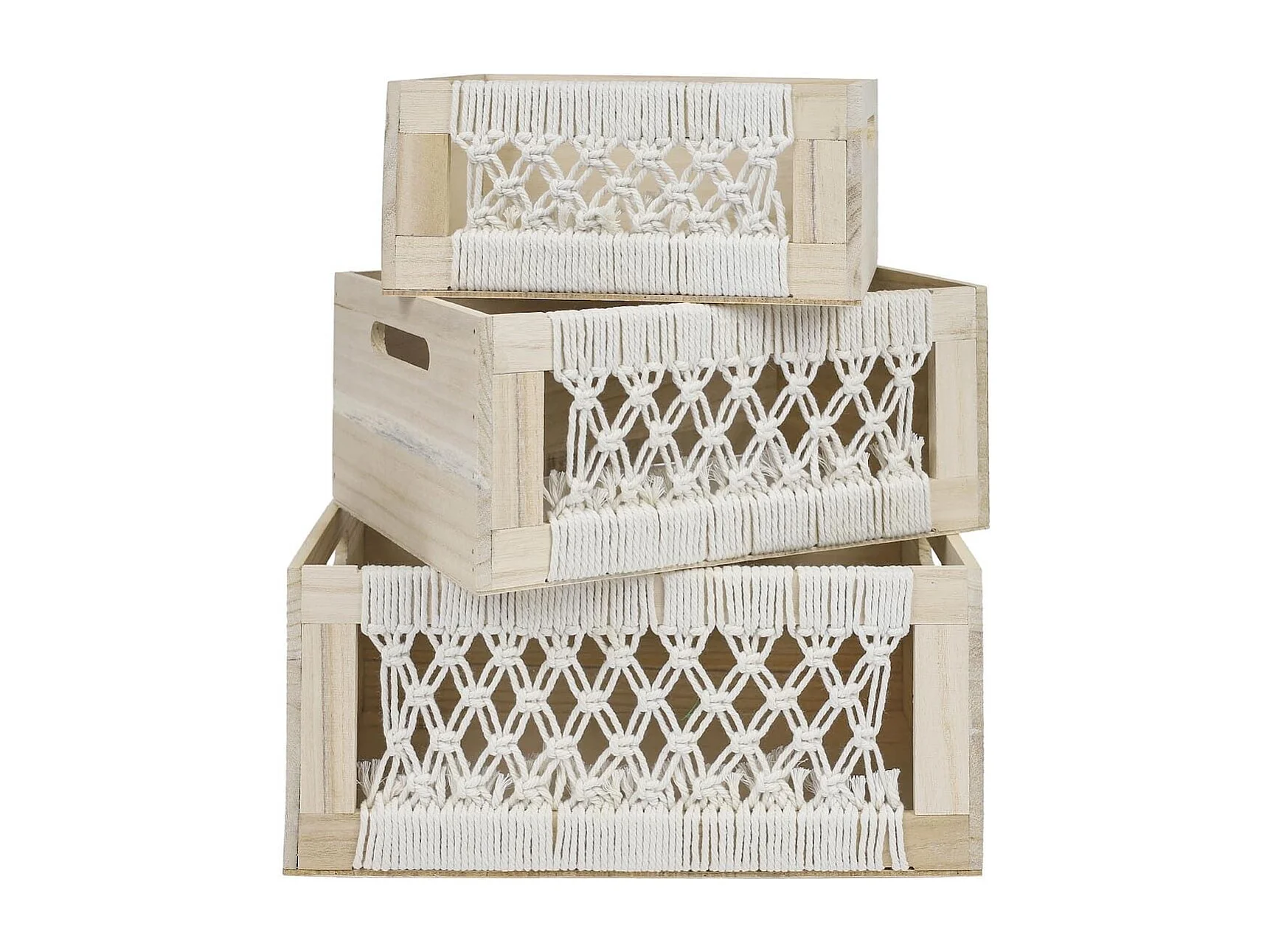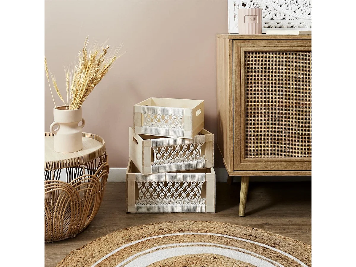 Lot de 3 Cagettes en Bois et Macramé L 36 L 32 et L 28 cm