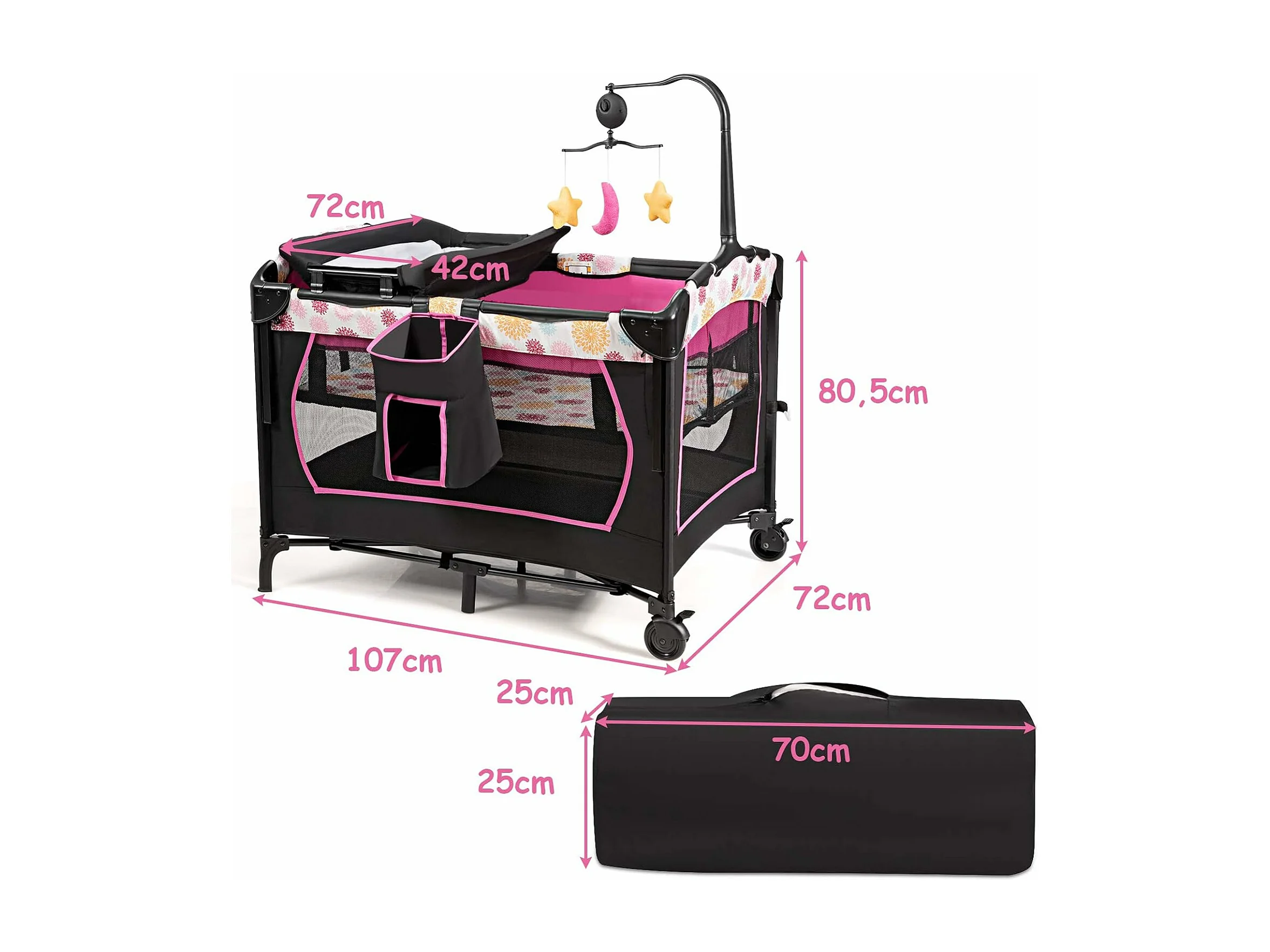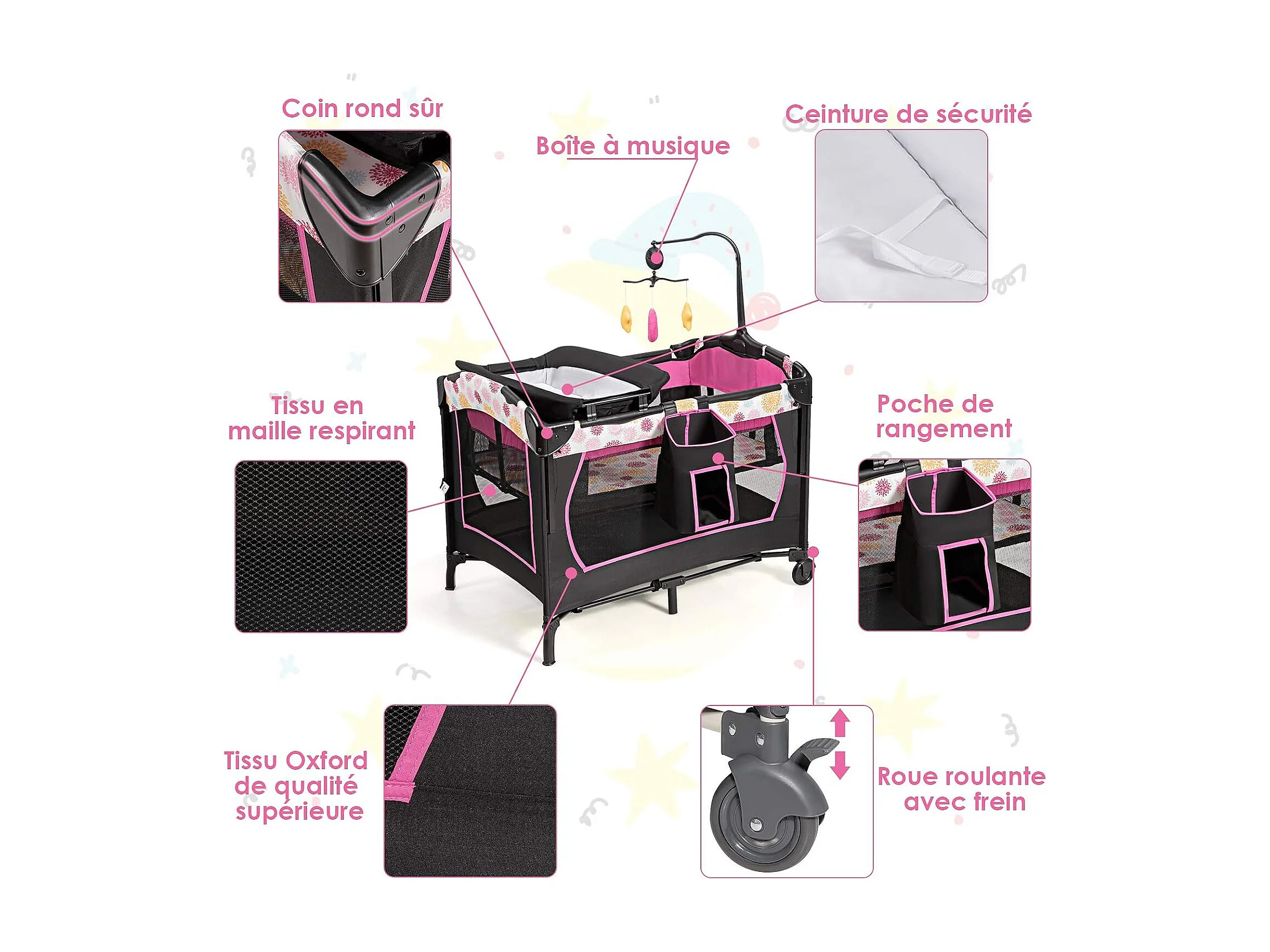 3 en 1 Lit Parapluie pour Bébé avec Arceau de Jeu en Tissu Oxford avec Centre Musical et Table à Langer pour Bébé 0-36 Mois Hauteur Réglable