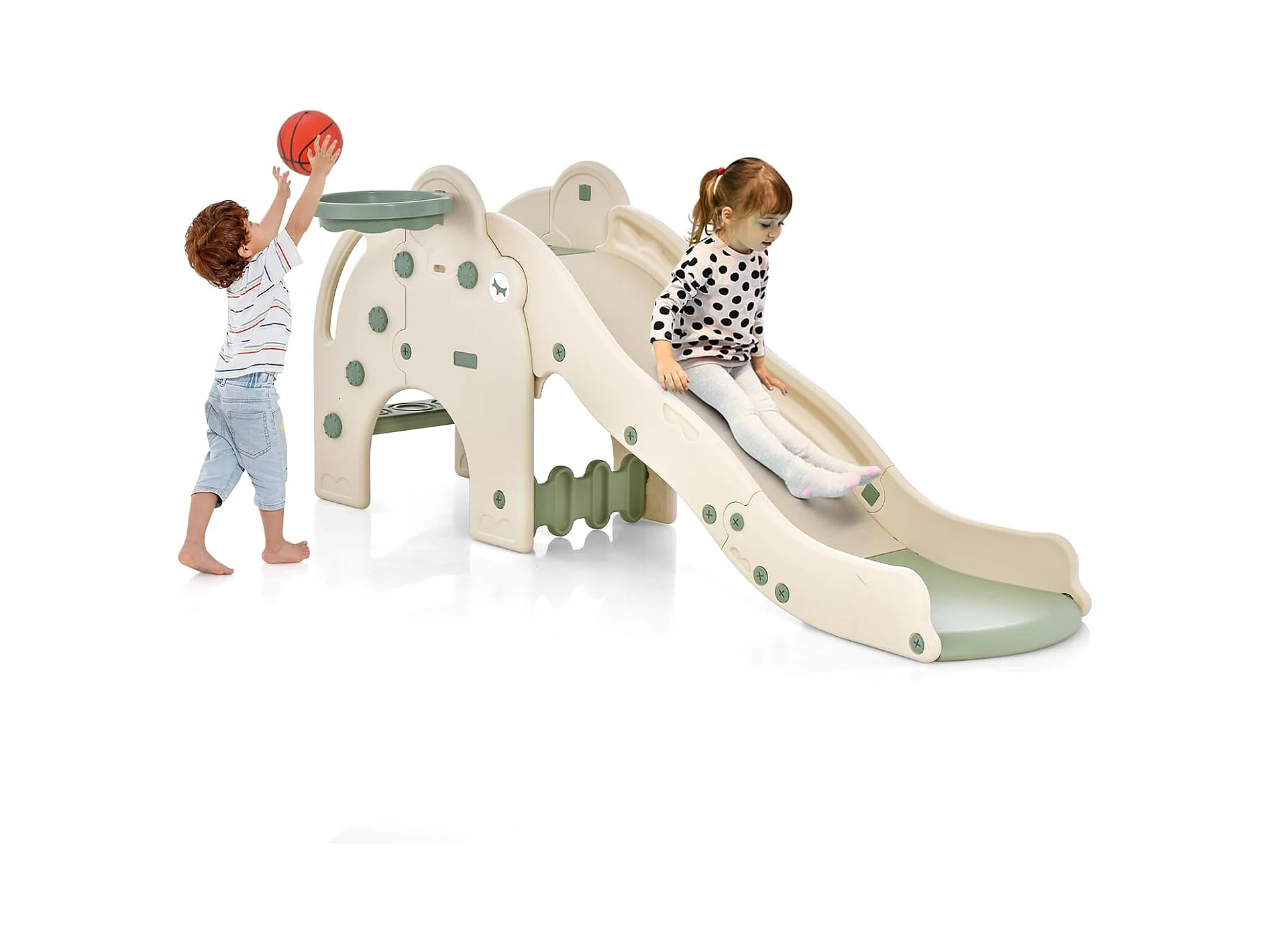 4 en 1 Toboggan Enfant en Forme Éléphant avec Panier de Basketball, en HDPE avec Ballon, Aire de Jeux pour Glisser & Grimper, Charge 50kg pour 18 Mois+ (Vert)