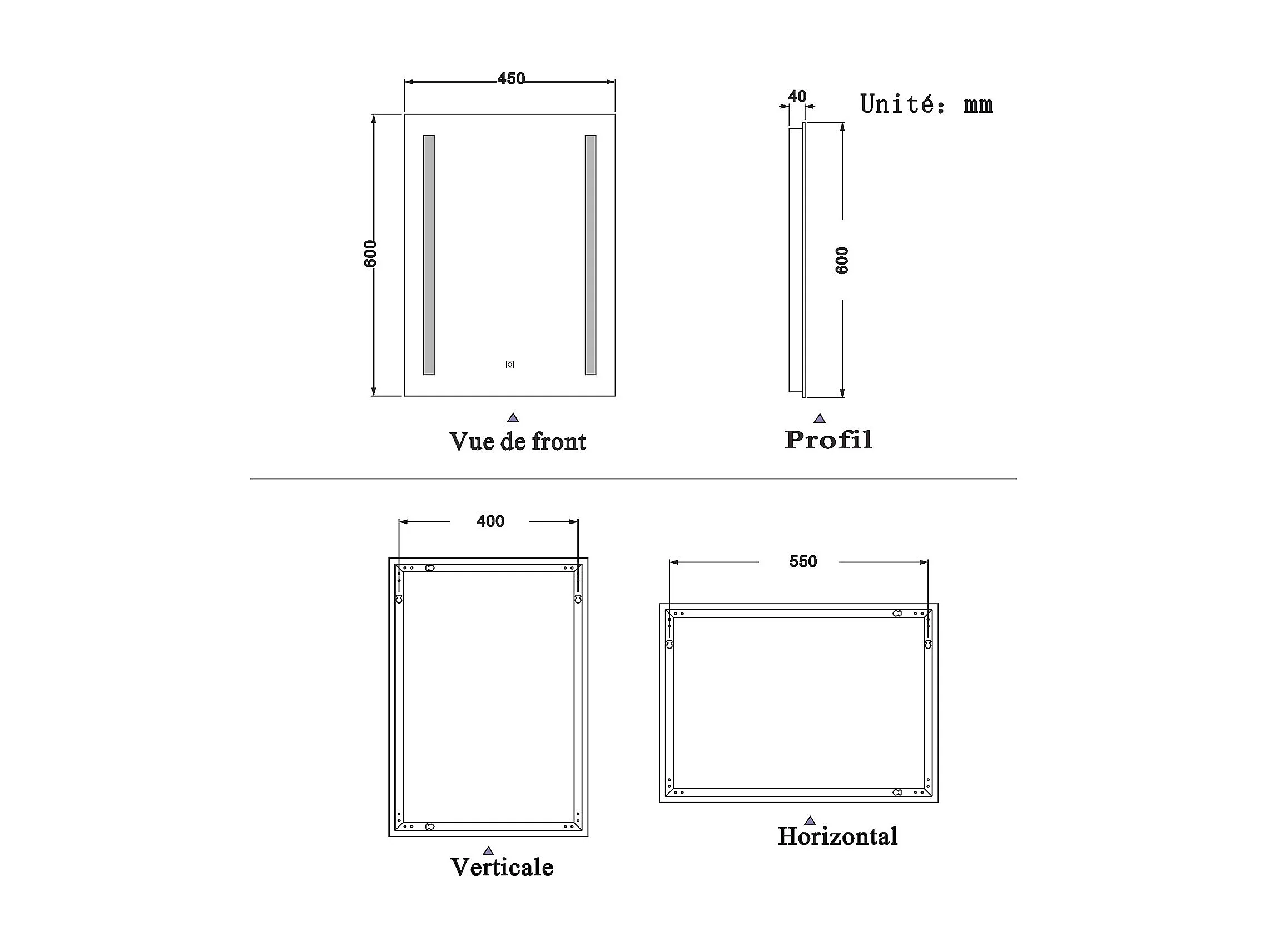 45x60cm Miroir de salle de bain, commutateur tactile, avec fonction LED et anti-buée, Modèle Baguette
