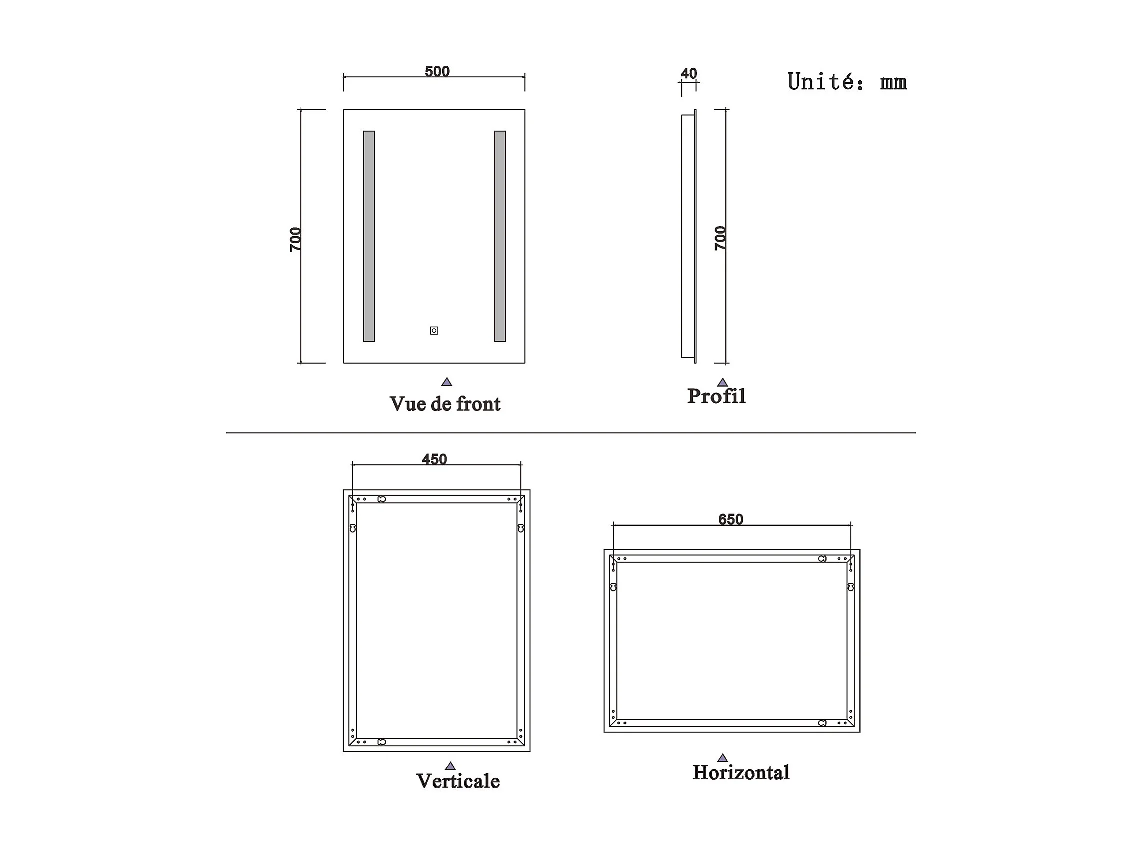 50x70cm Miroir de salle de bain, commutateur tactile, avec fonction LED et anti-buée, Modèle Baguette
