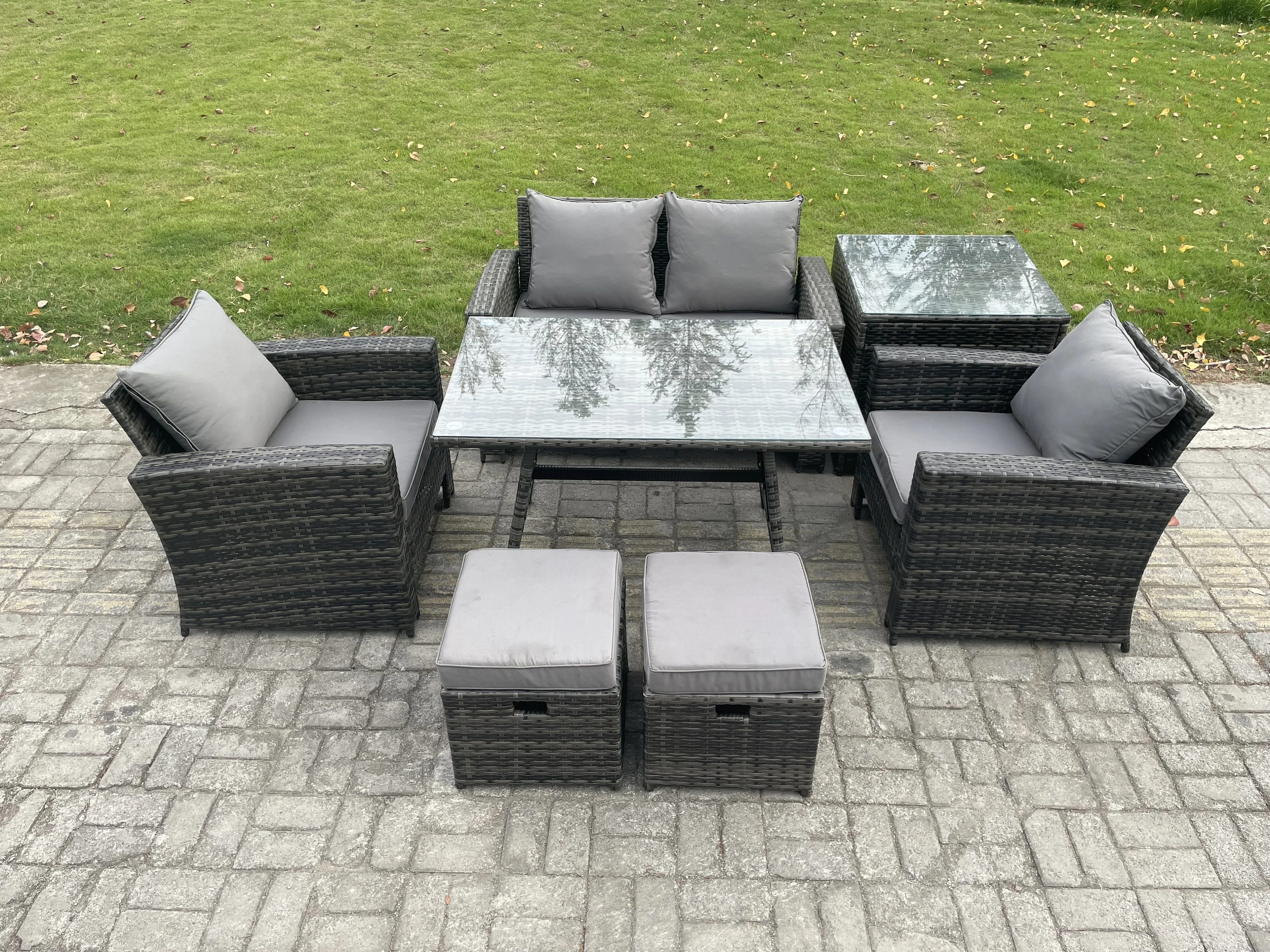 6 places Ensemble de canapé en rotin extérieur avec Table à manger Table d'appoint 2 Petits tabourets Gris foncé mixte