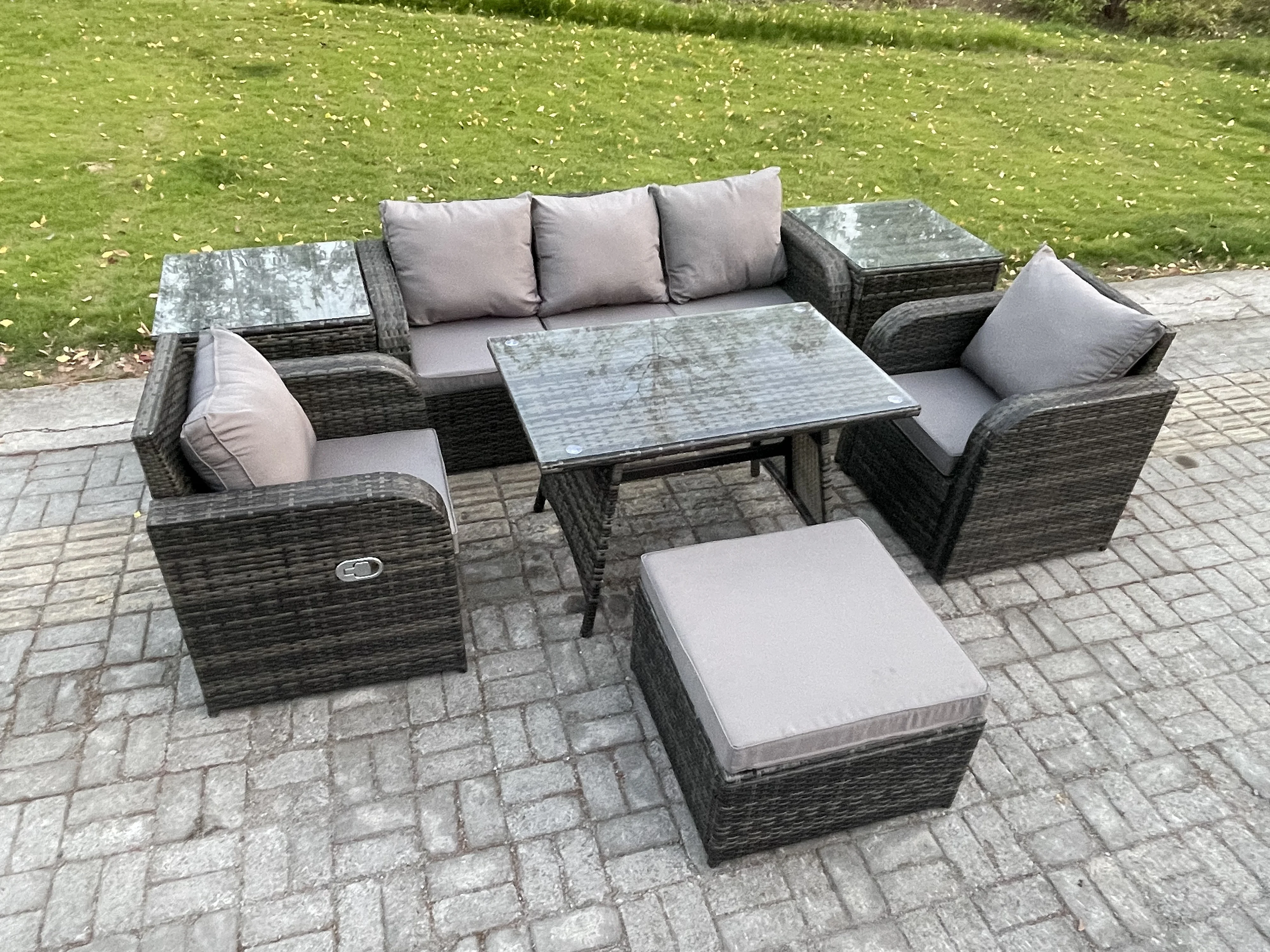 6 places Ensemble de Meubles de Jardin avec Table à manger rectangulaire Chaise inclinable Canapé 3 places Grand tabouret 2 Tables d'appoint