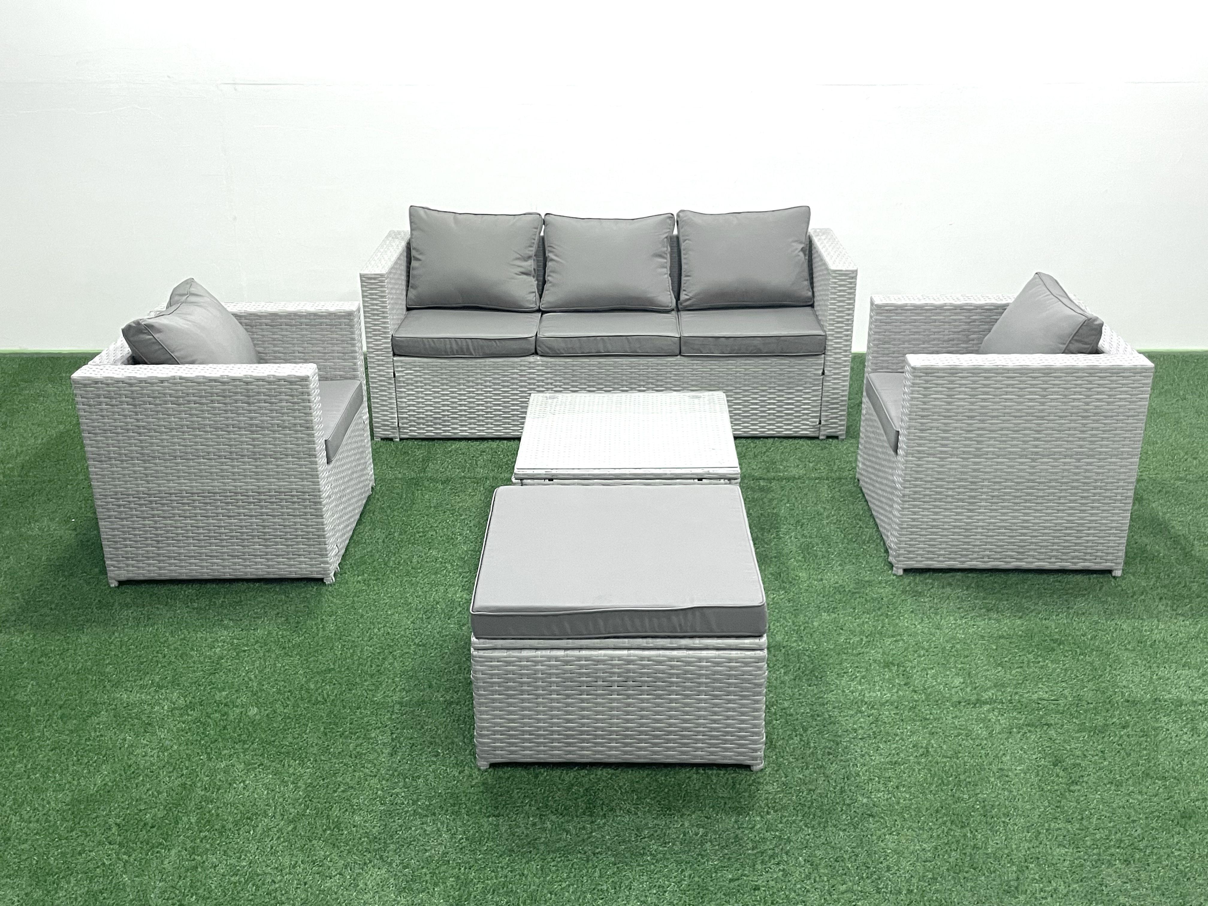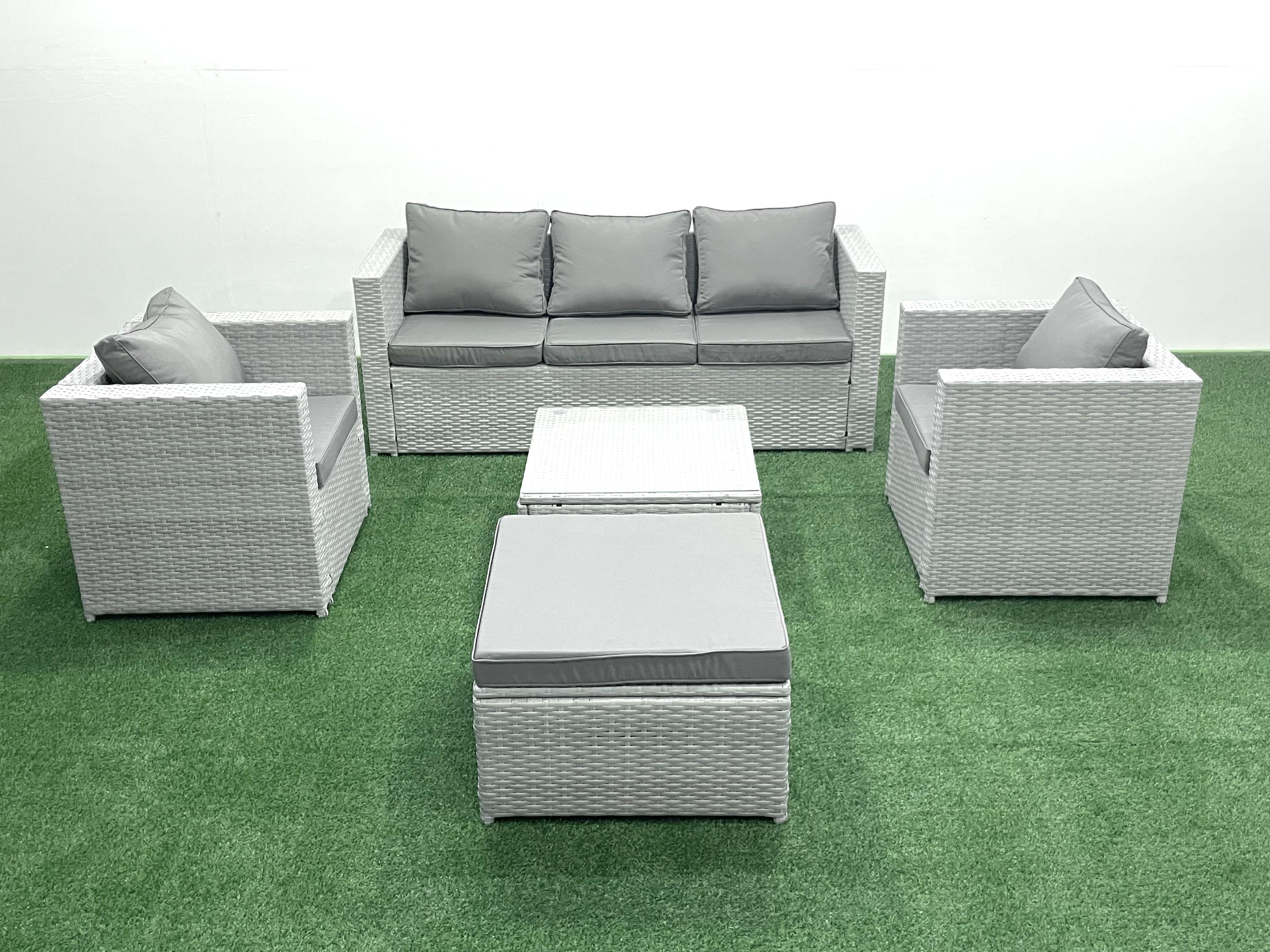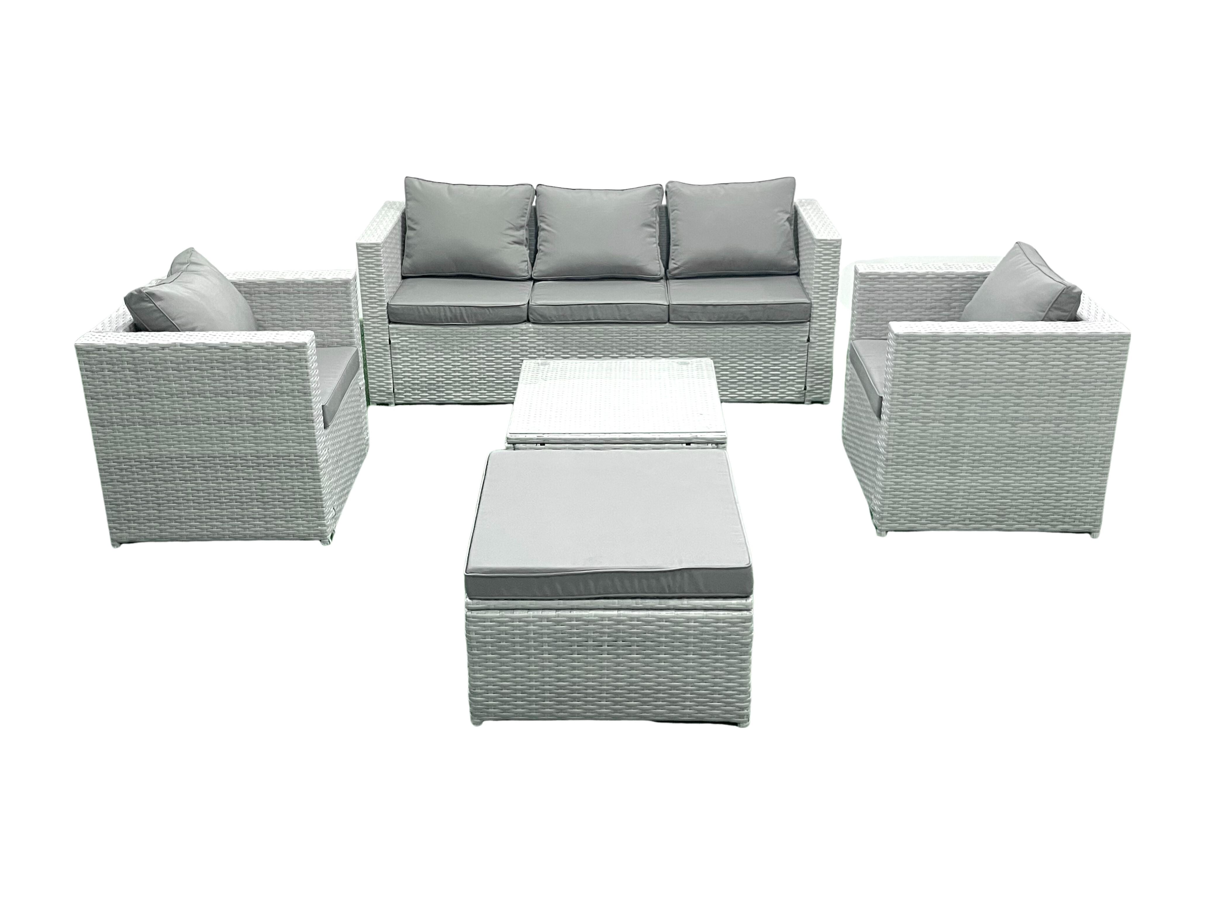 6 places Salon de jardin avec Canapé 3 places 2 Chaise Table basse carrée Grand tabouret Gris clair mixte