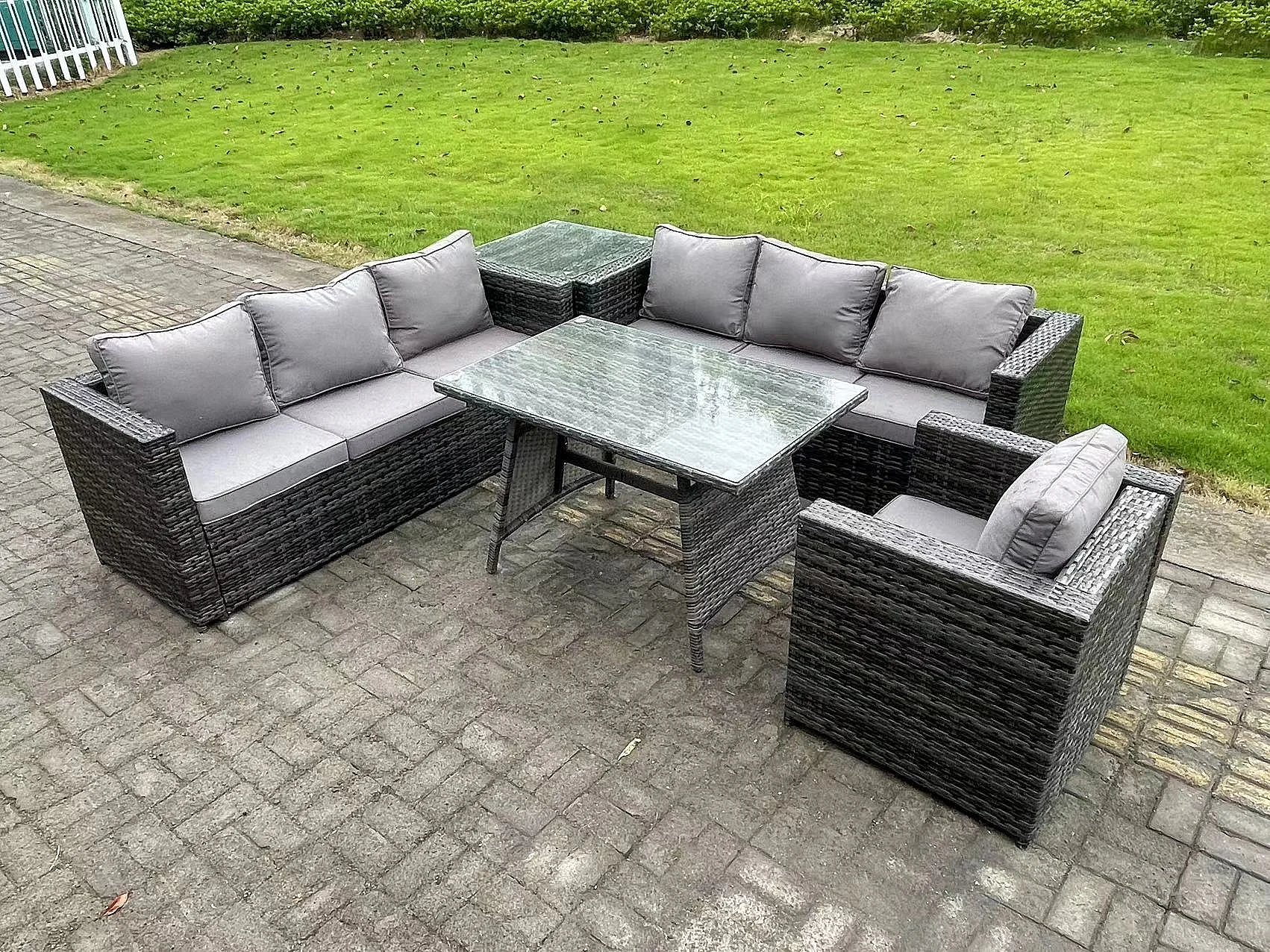 7 places Ensemble de canapé en rotin extérieur avec Table à manger Table d'appoint Fauteuil Gris foncé mixte