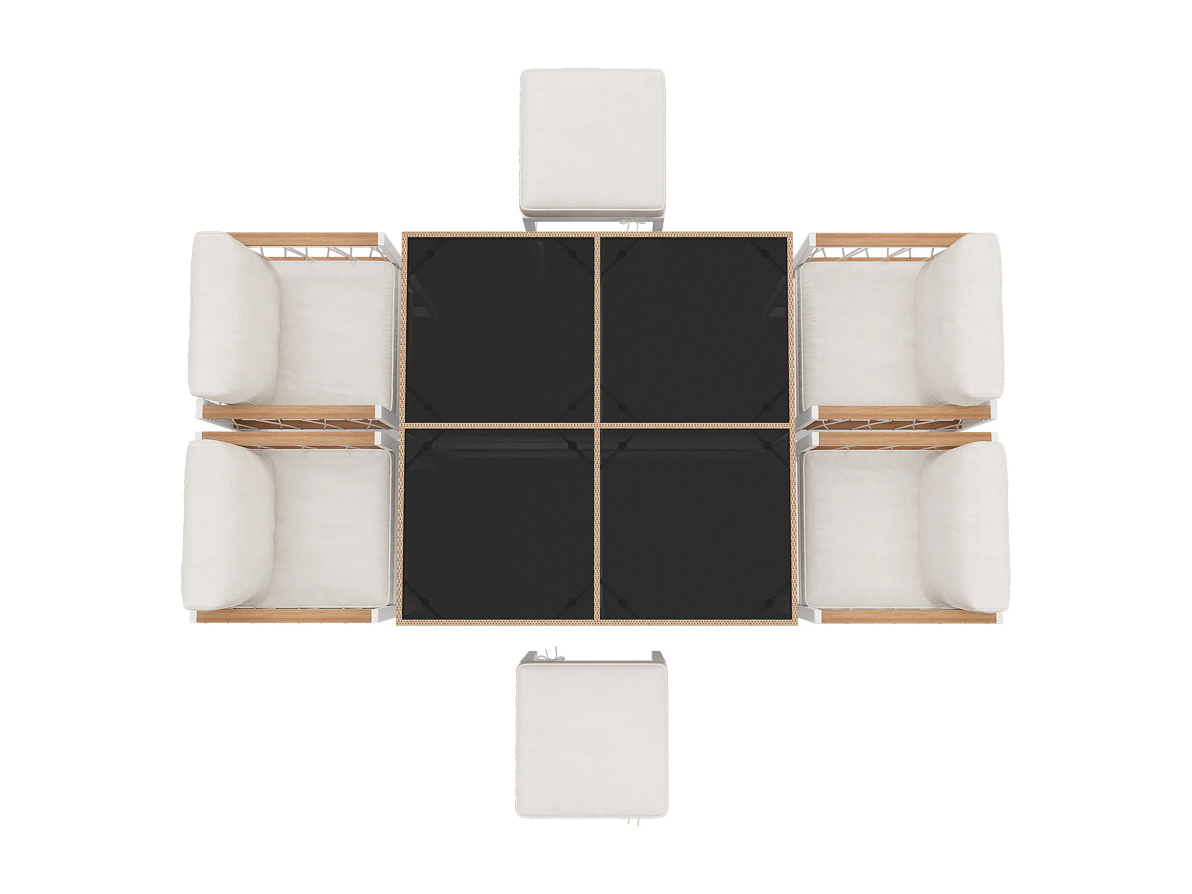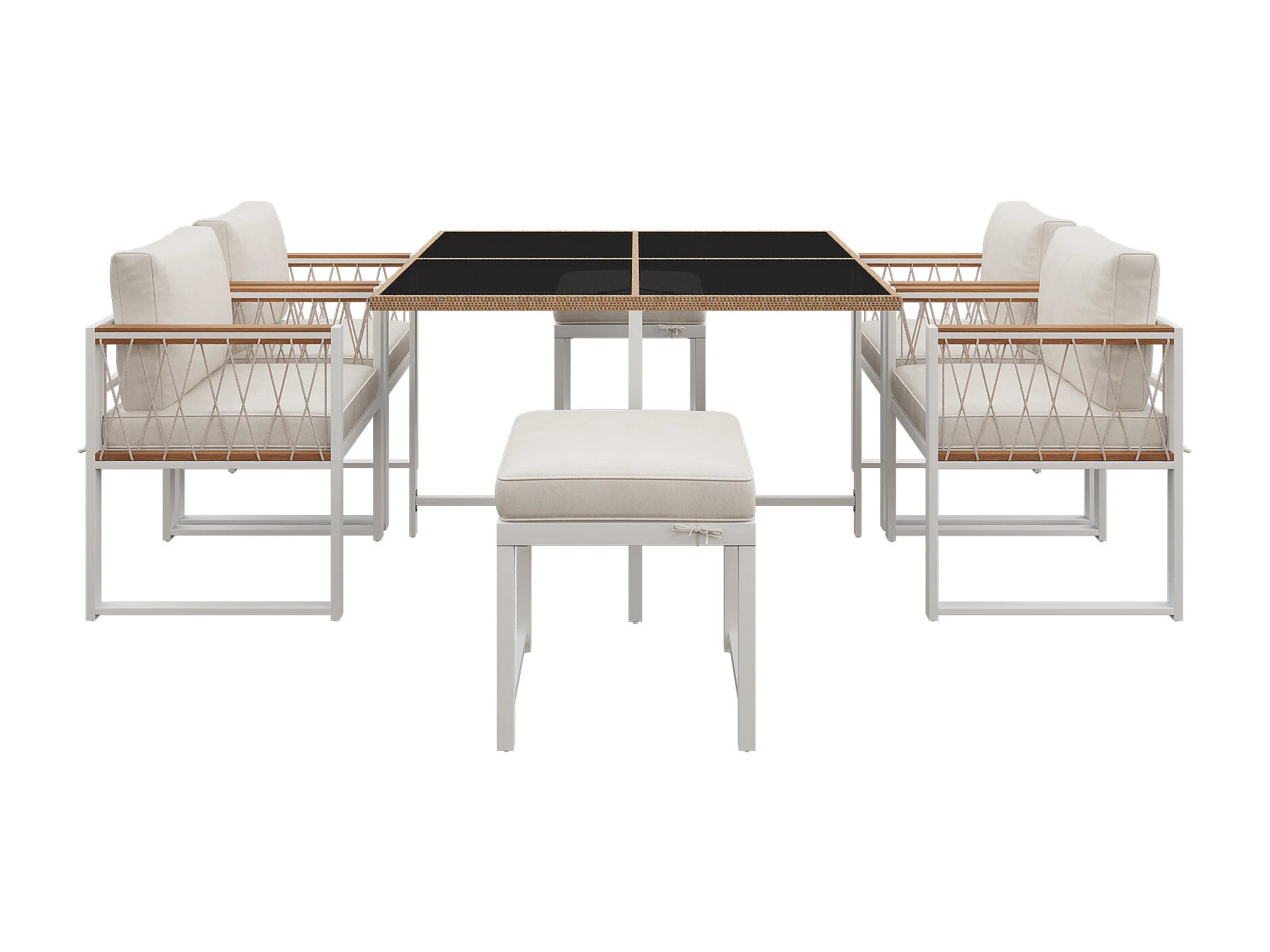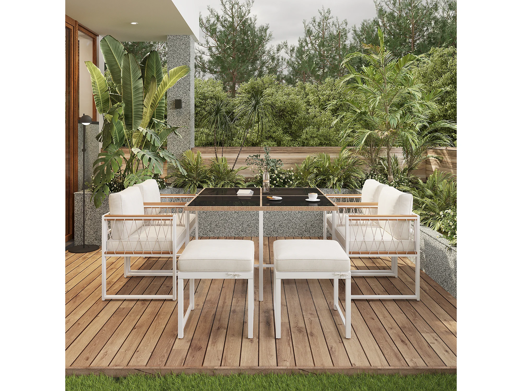 Ensemble table et chaises de salle à manger d'extérieur 7 pièces, table en verre trempé, revêtement en rotin PE, plateau d'accoudoir en bois d'acacia