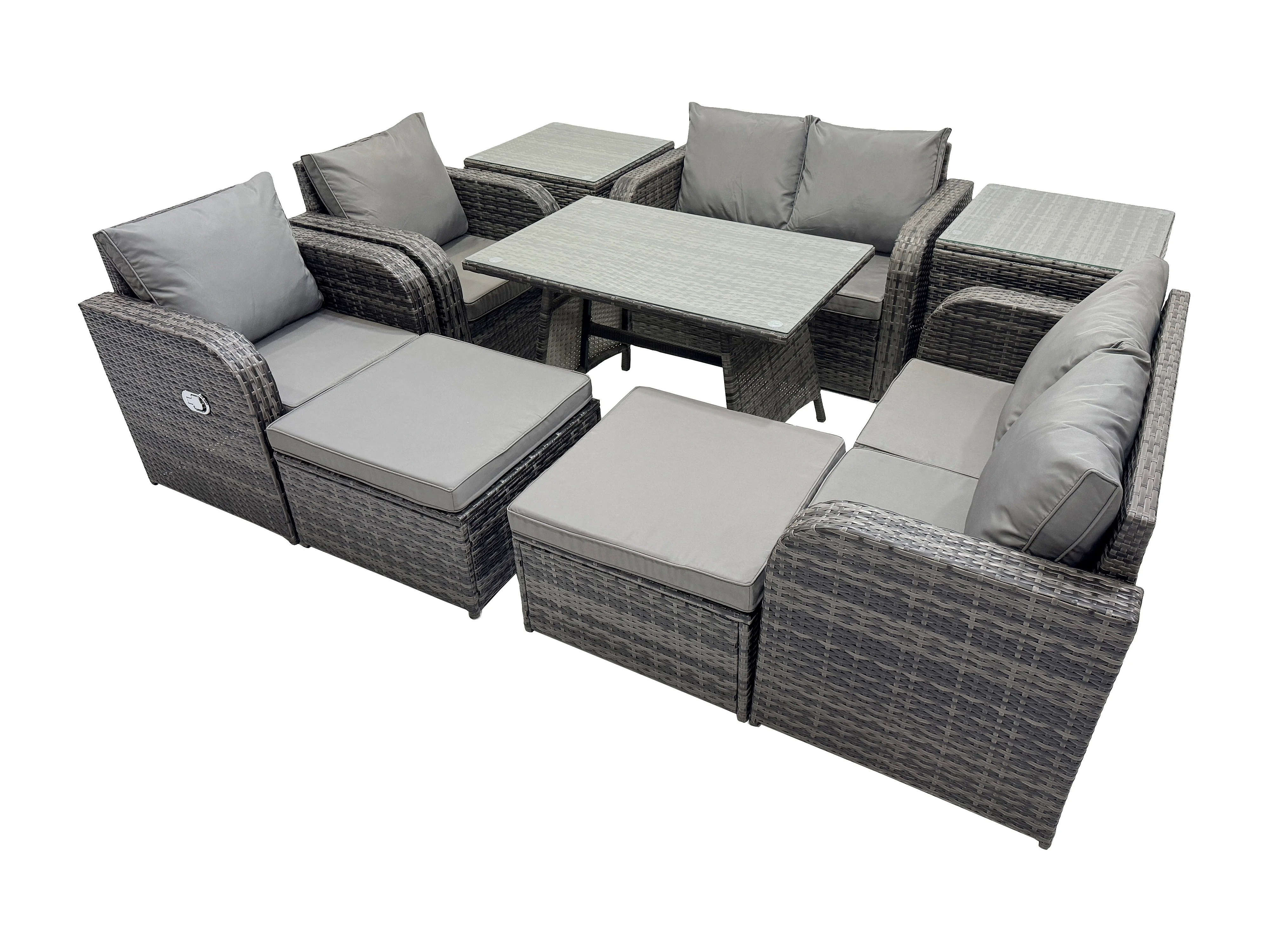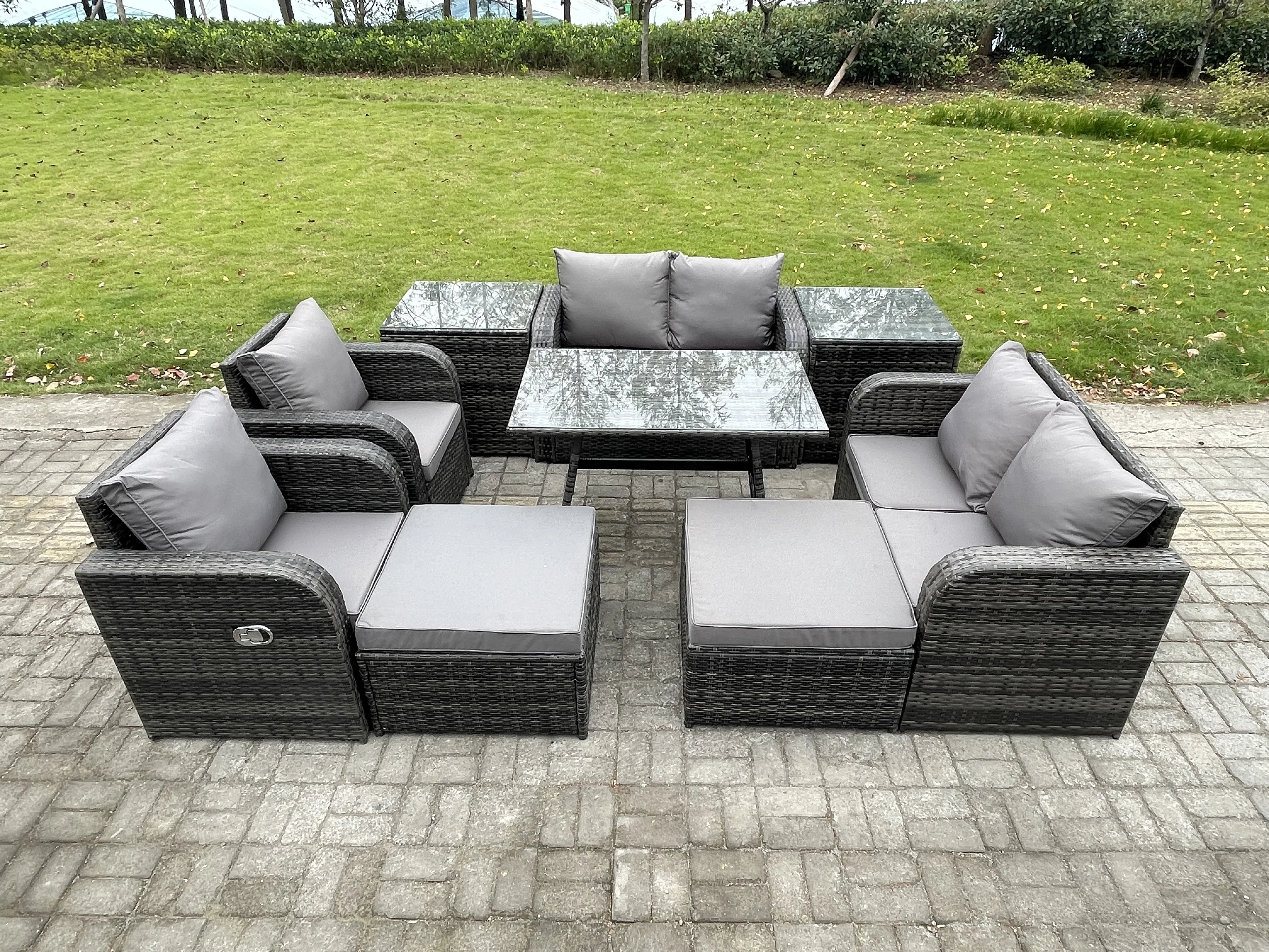 8 places Ensemble de canapé en rotin extérieur avec Table à manger rectangulaire 2 Tables d'appoint 2 Grand tabourets Gris foncé mixte