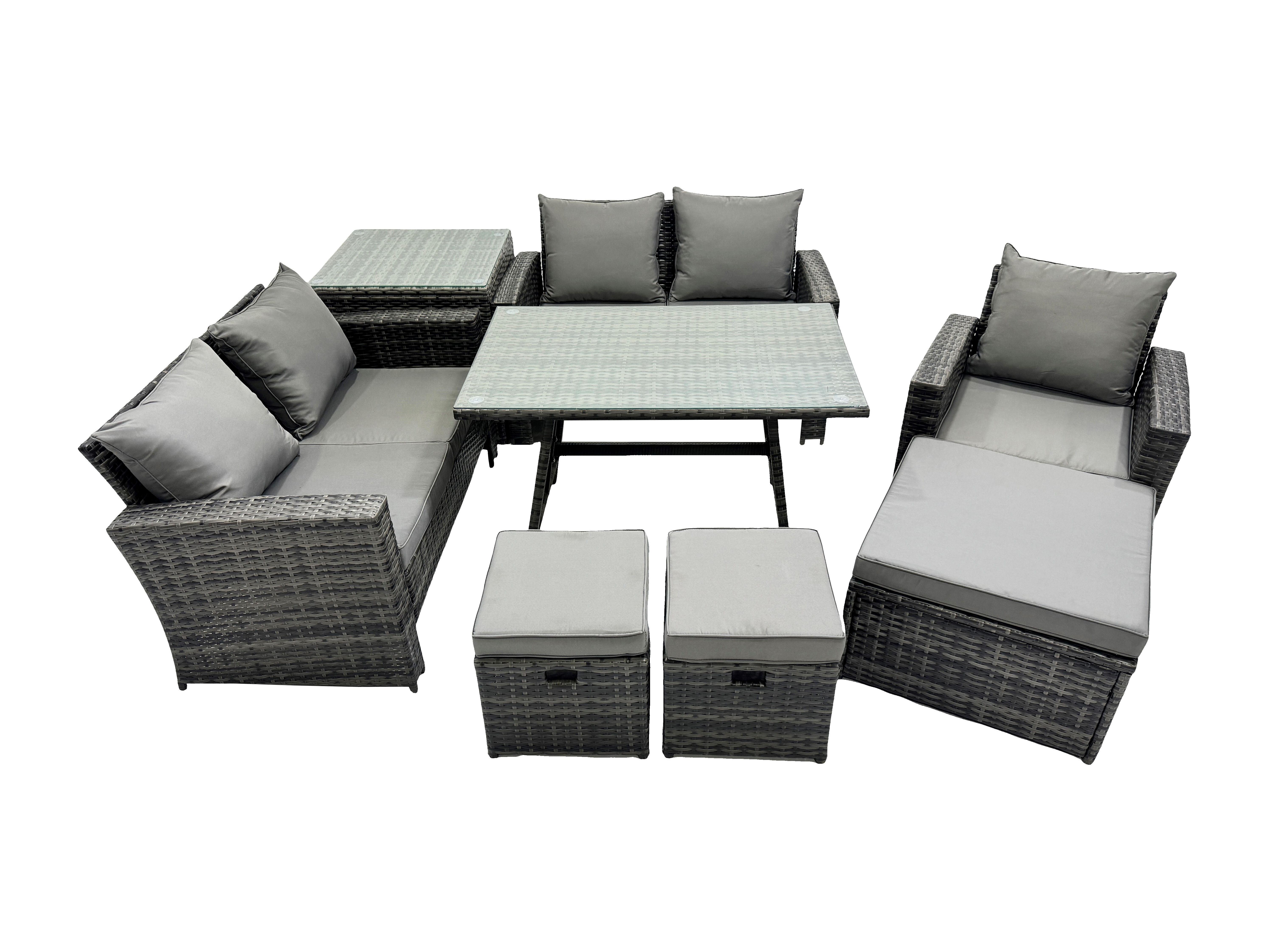 8 places Ensemble de canapé en rotin extérieur avec Table à manger rectangulaire Canapé à deux places Table d'appoint 3 Tabourets Gris foncé mixte