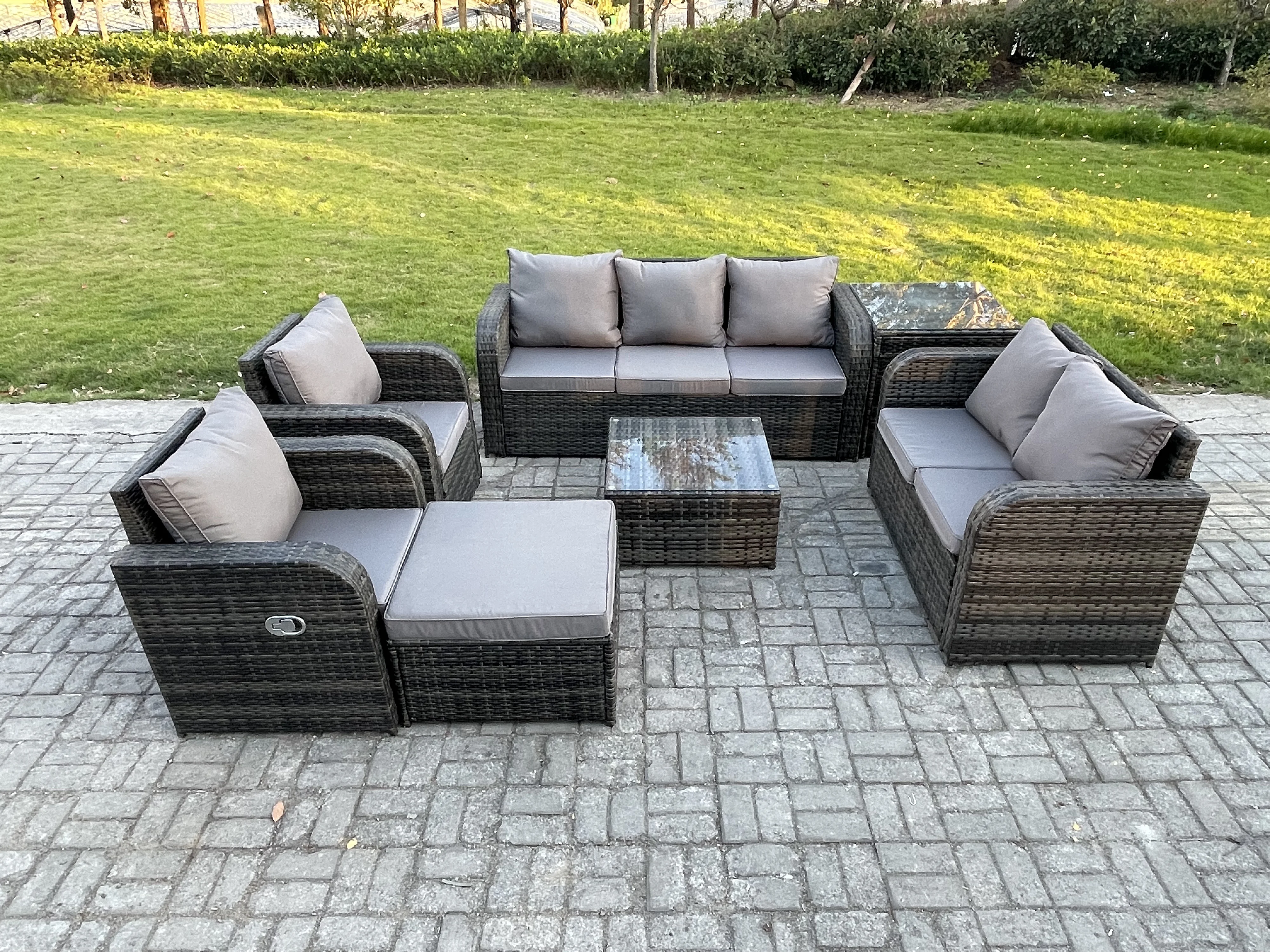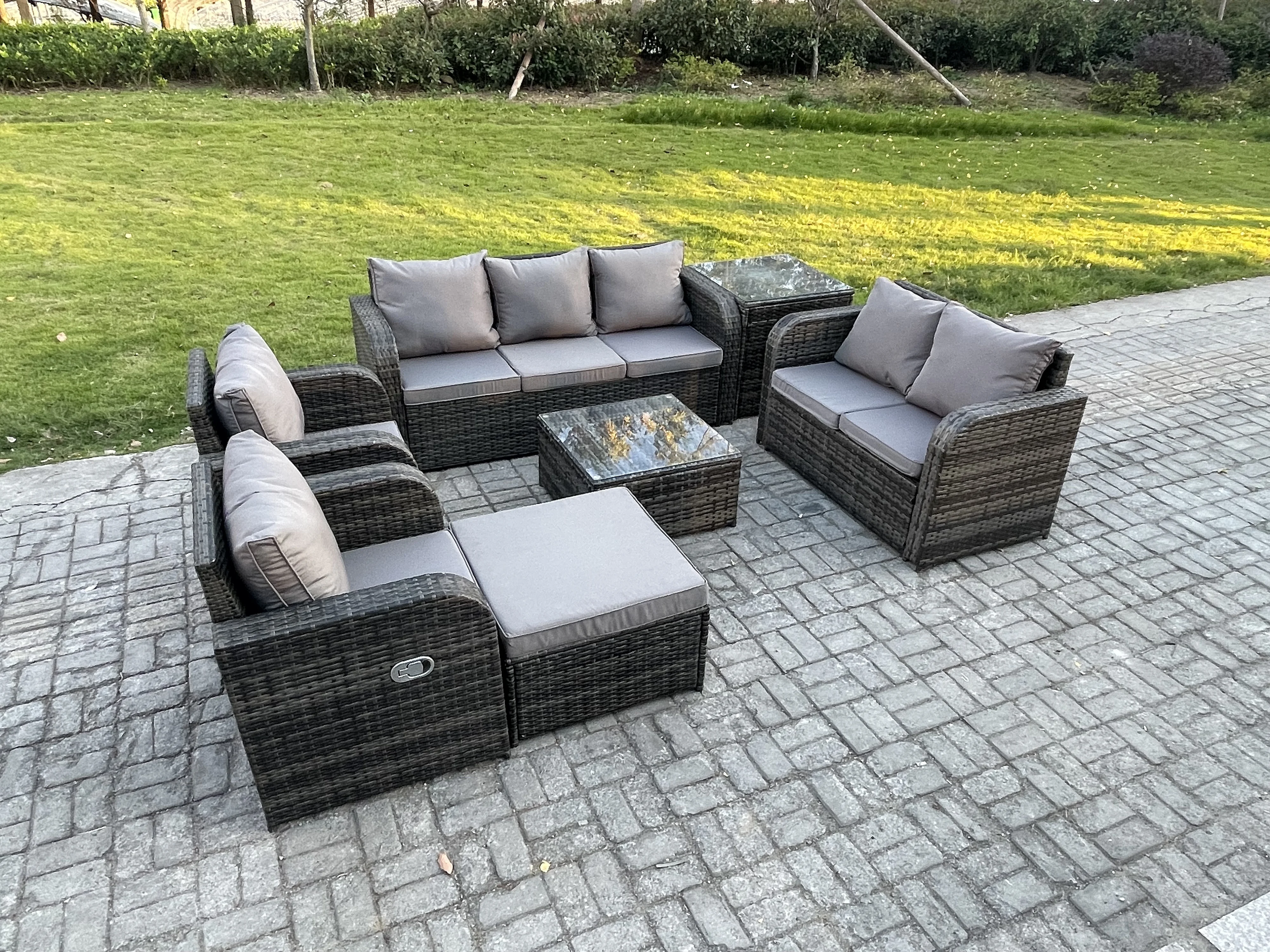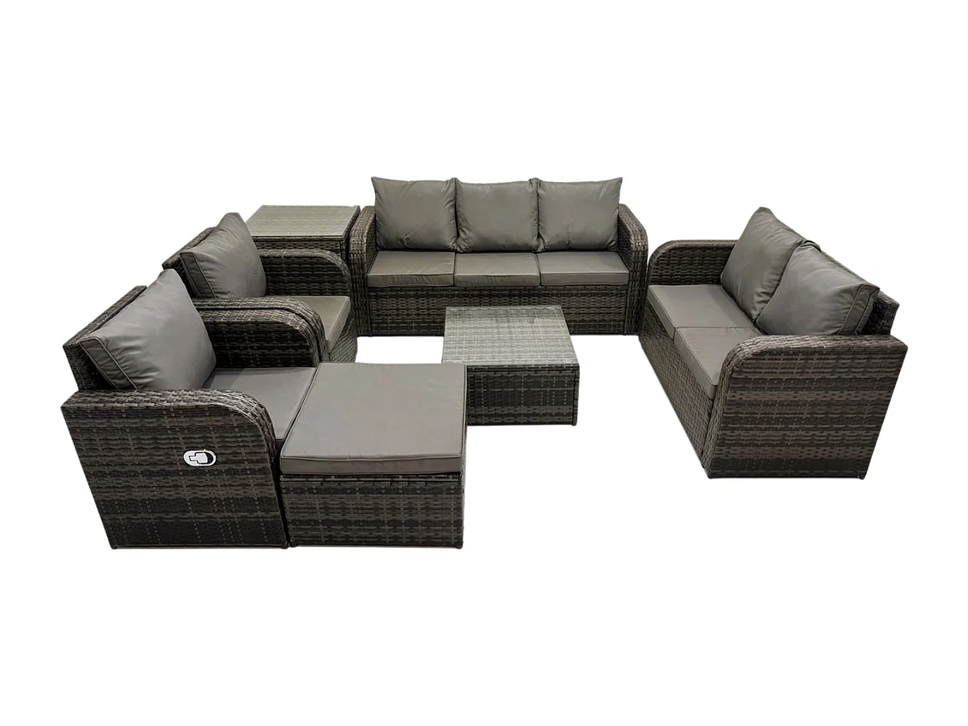 8 places Ensemble de meubles de jardin Rattan Outdoor Canapé Lounge Fauteuil avec Table basse carrée Grand tabouret Table d'appoint Gris foncé mixte