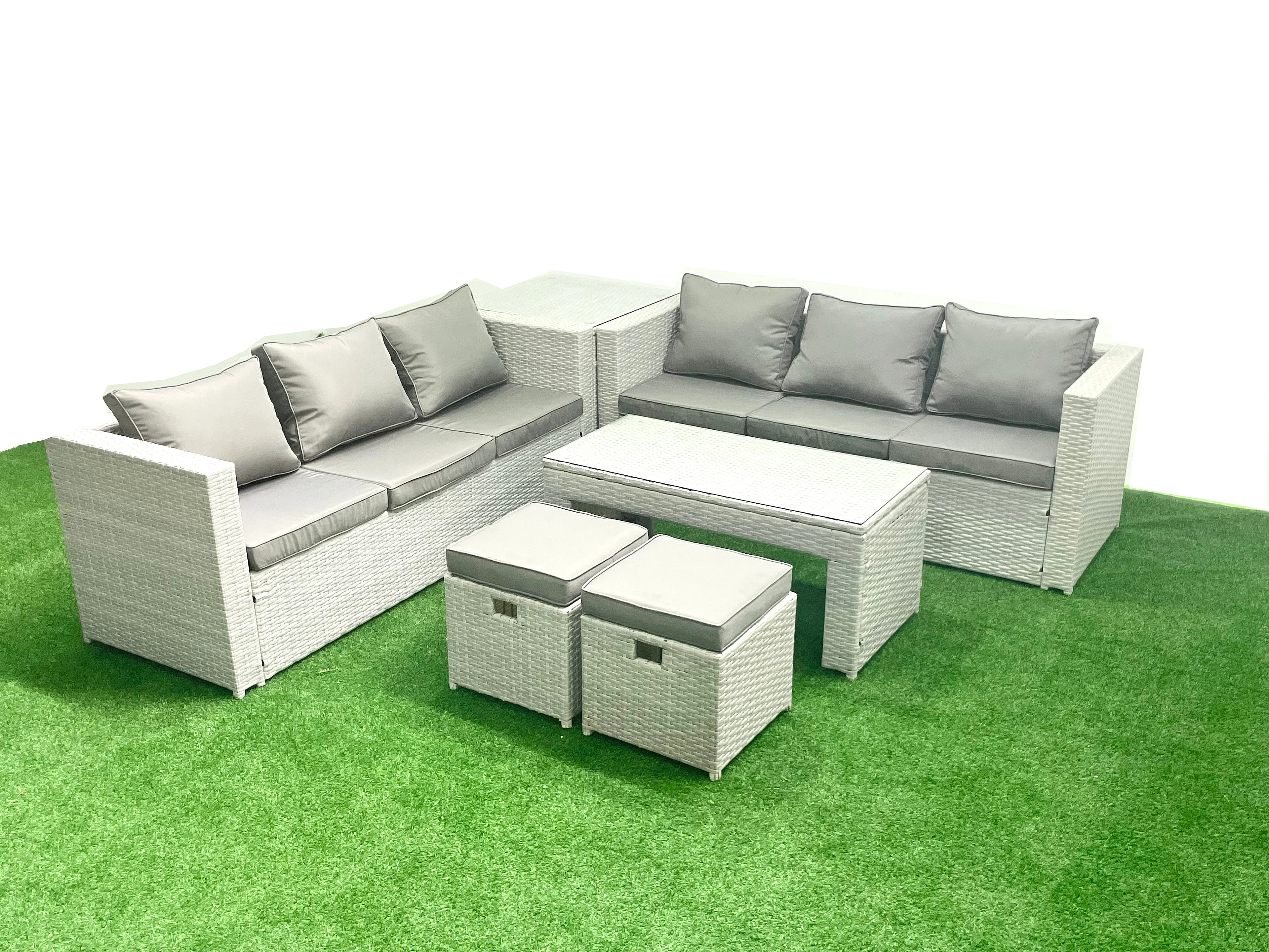 8 places Salon de Jardin Extérieur Canapé de jardin en rotin Table basse oblongue avec 2 Petit pouf Table d'appoint Gris clair mixte