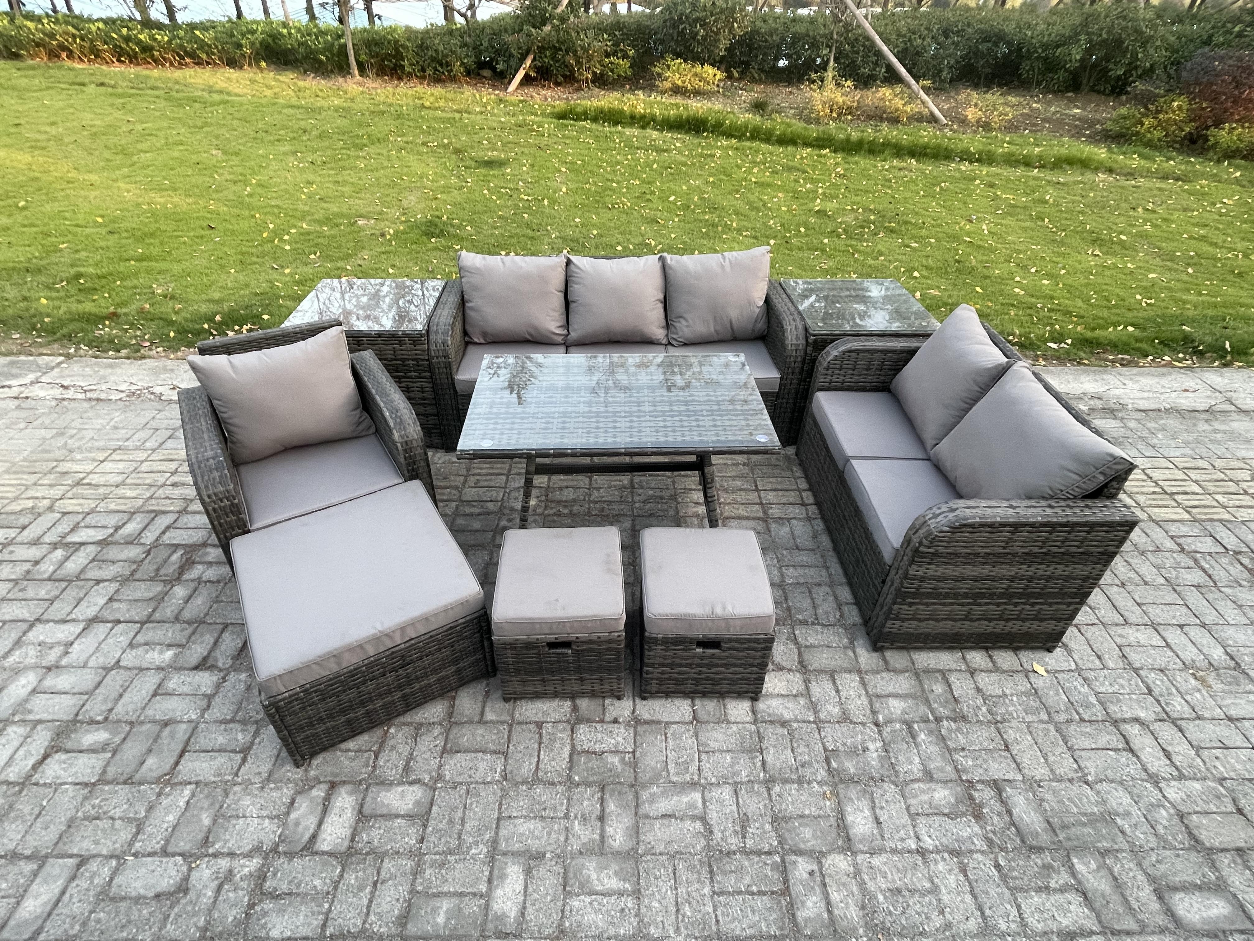 9 PCS Ensemble de canapés en rotin Salon de jardin avec Table à manger rectangulaire Fauteuil 3 Tabourets Gris foncé mixte