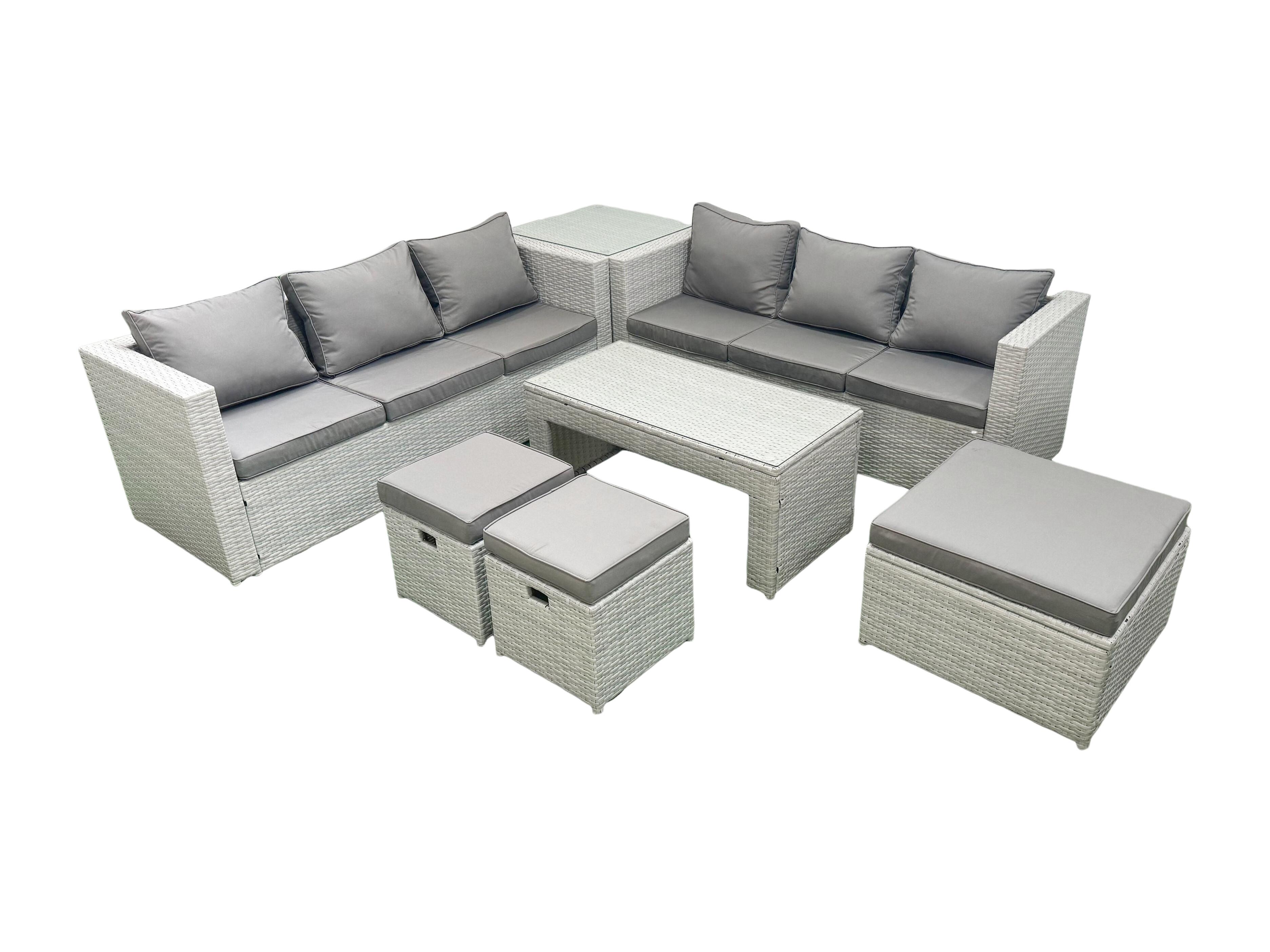 9 places Salon de Jardin Extérieur Canapé de jardin en rotin Table basse oblongue avec 3 Tabourets Table d'appoint Gris clair mixte