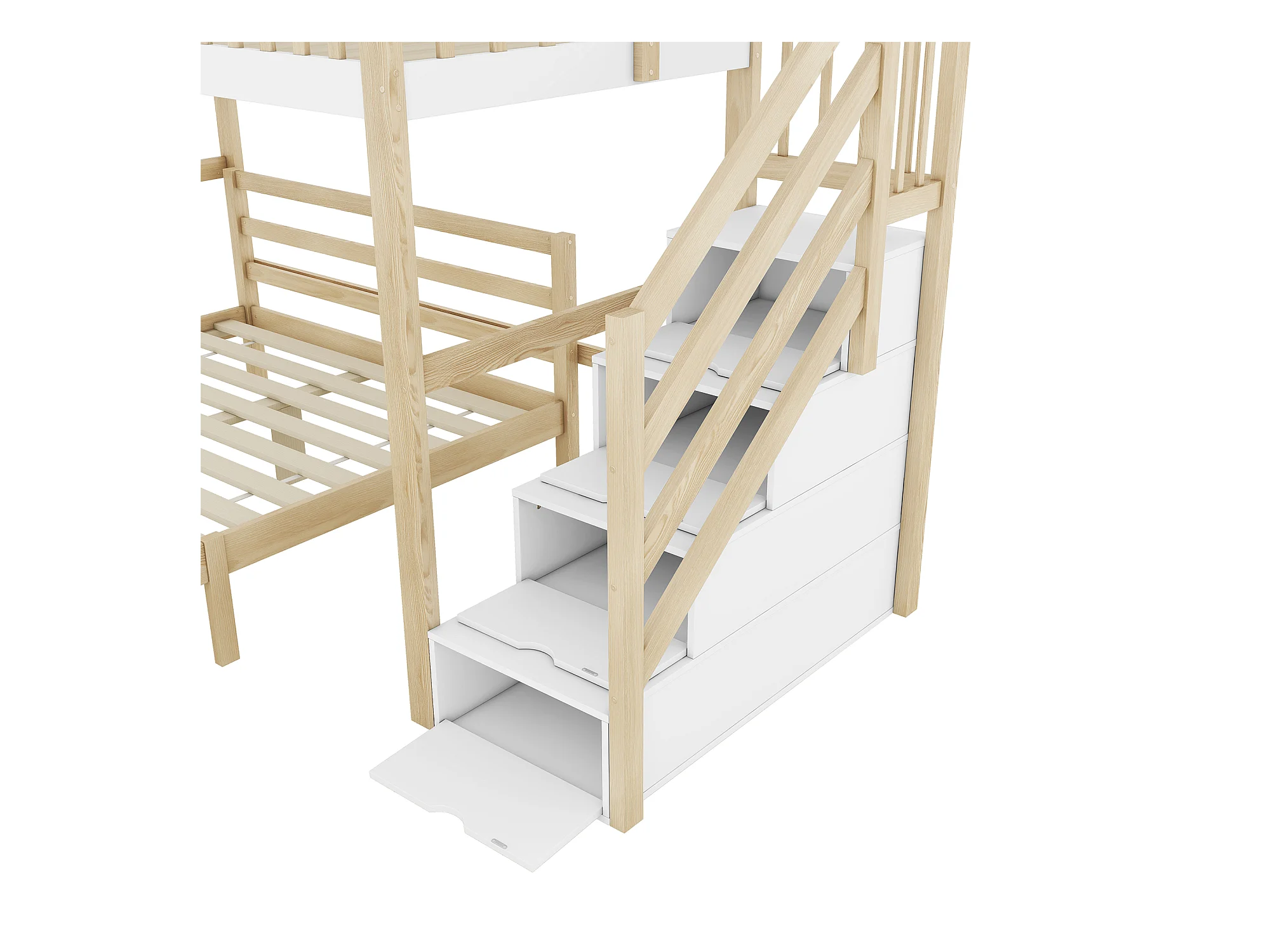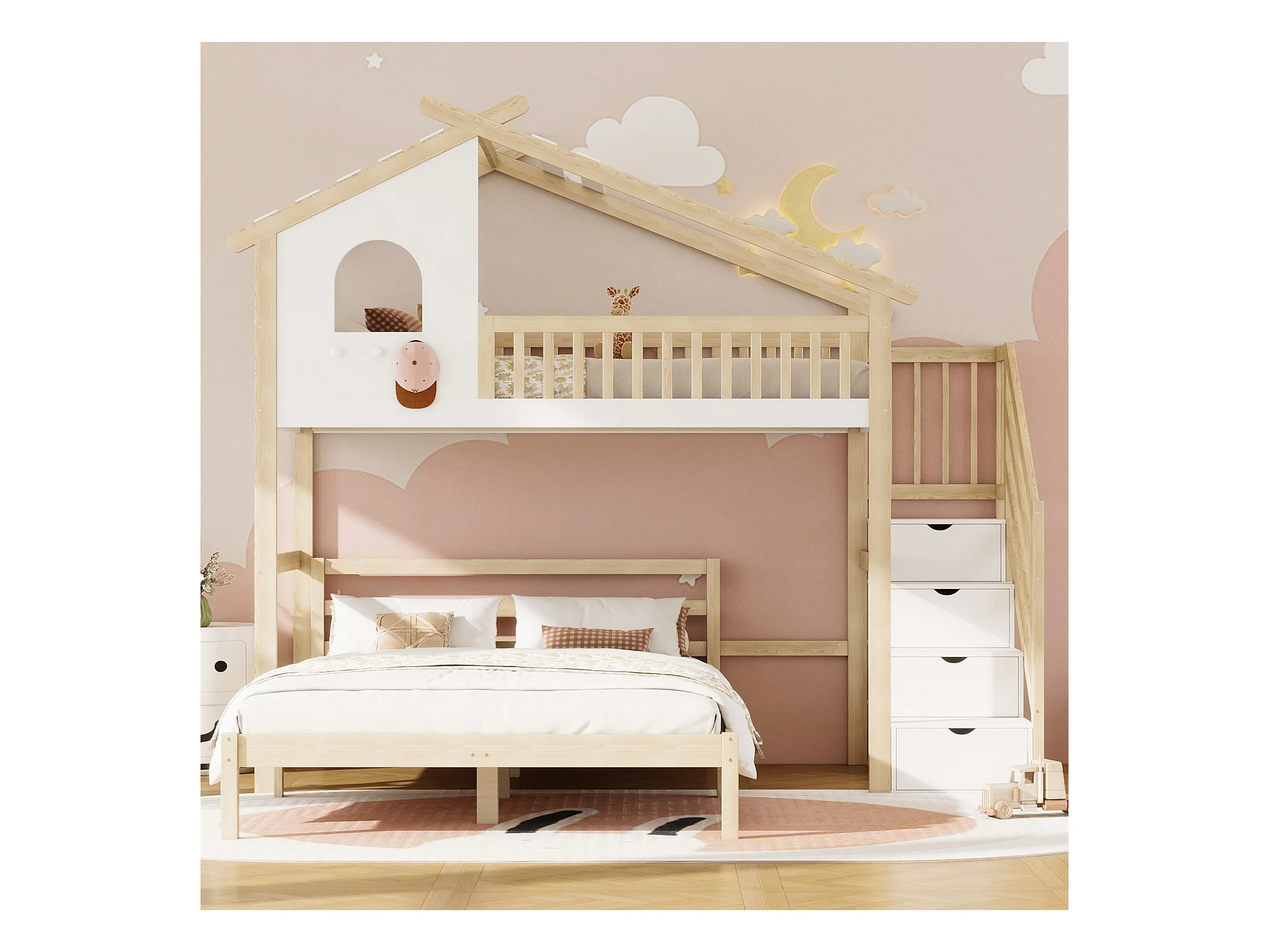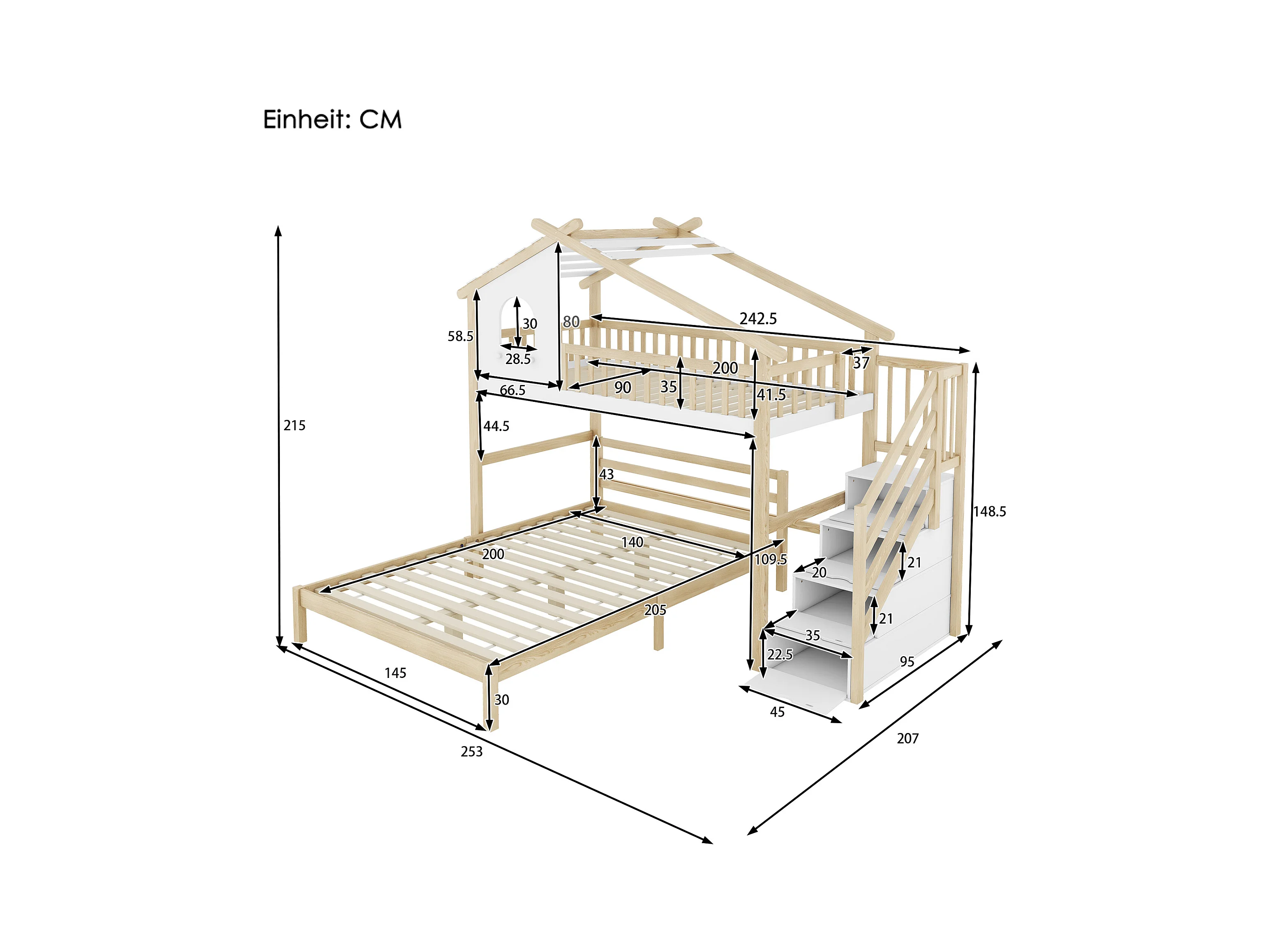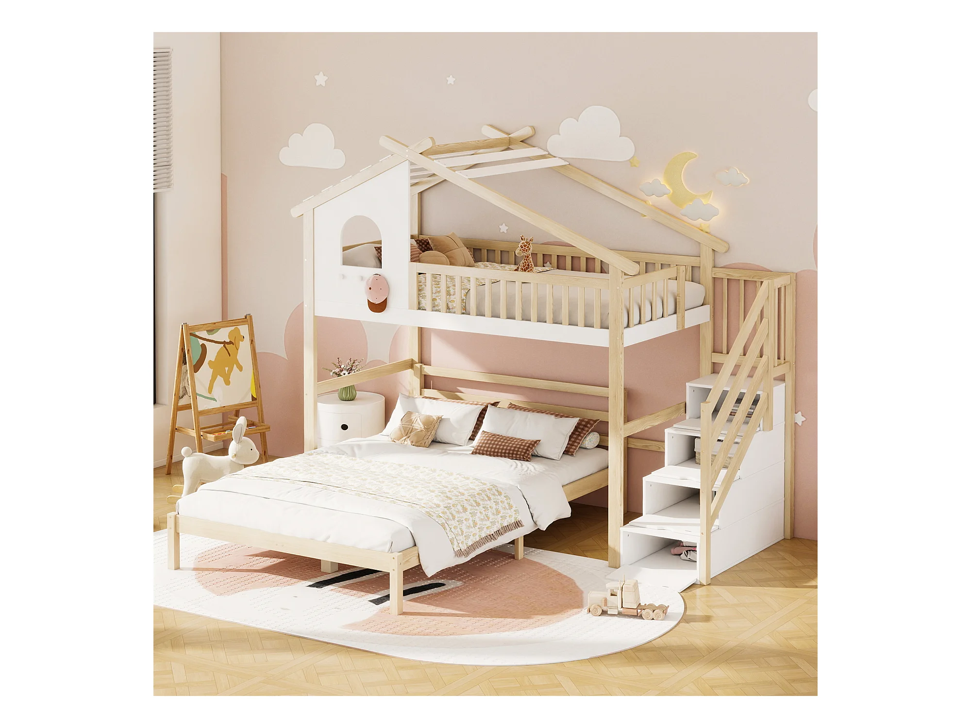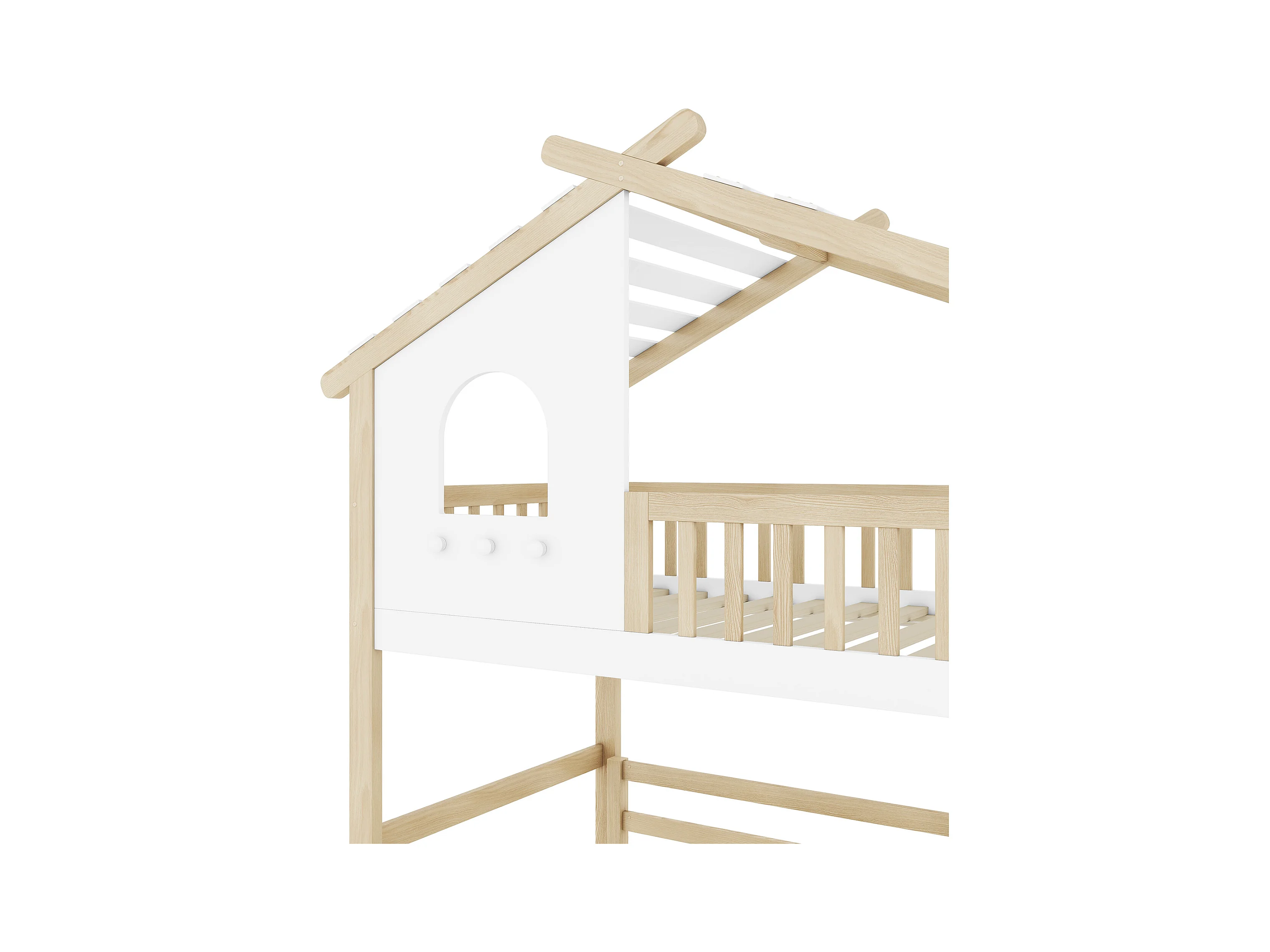 Lit surélevé, 90*200 cm, barrière de lit, échelle de rangement, fenêtre, barre de maison, sommier 140*200 cm, blanc + naturel