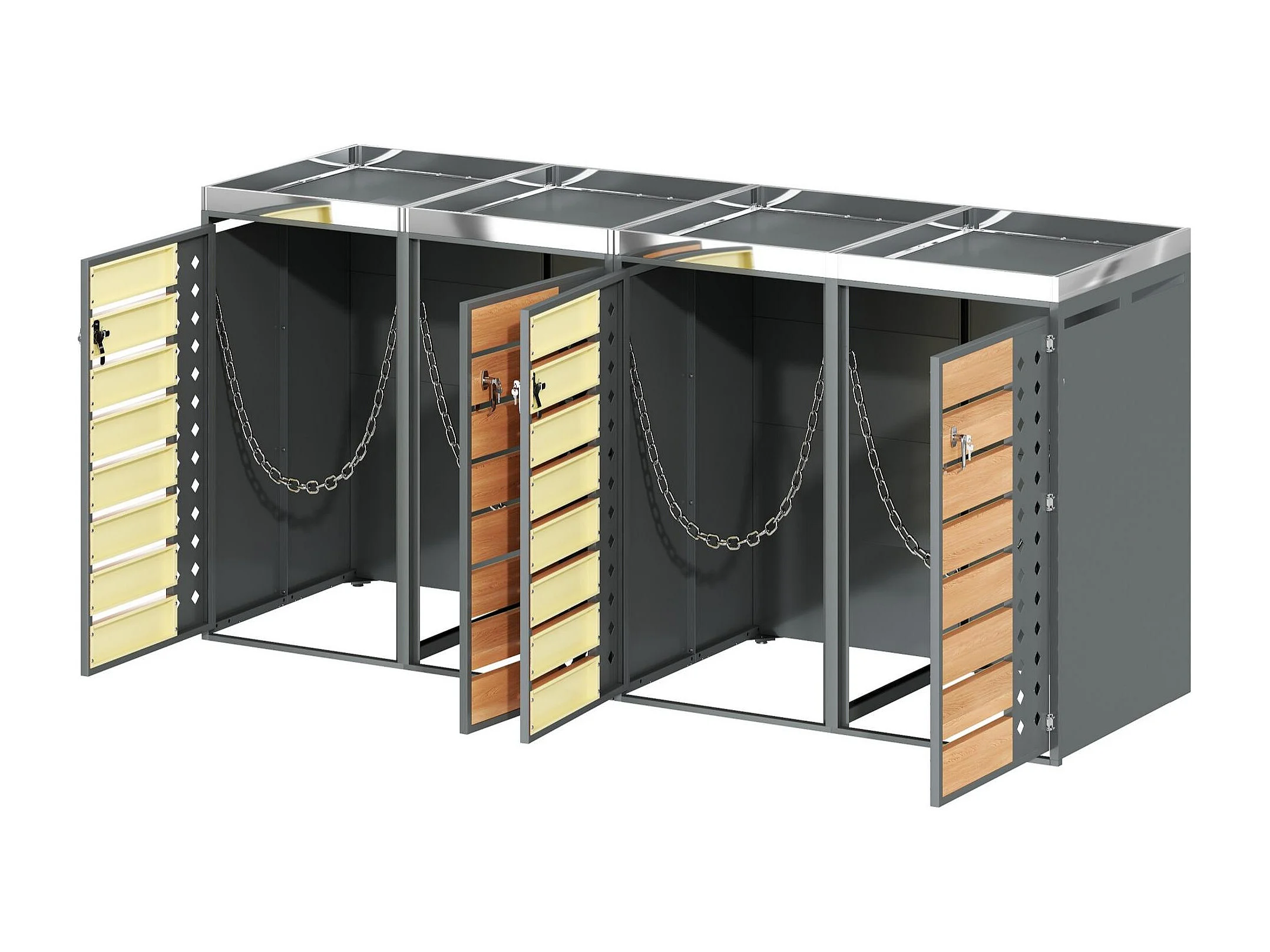 Abri poubelle jardin design 4 portes double bac tri avec jardinière intégrée, acier galvanisé et bois, 264x124,5x80 cm