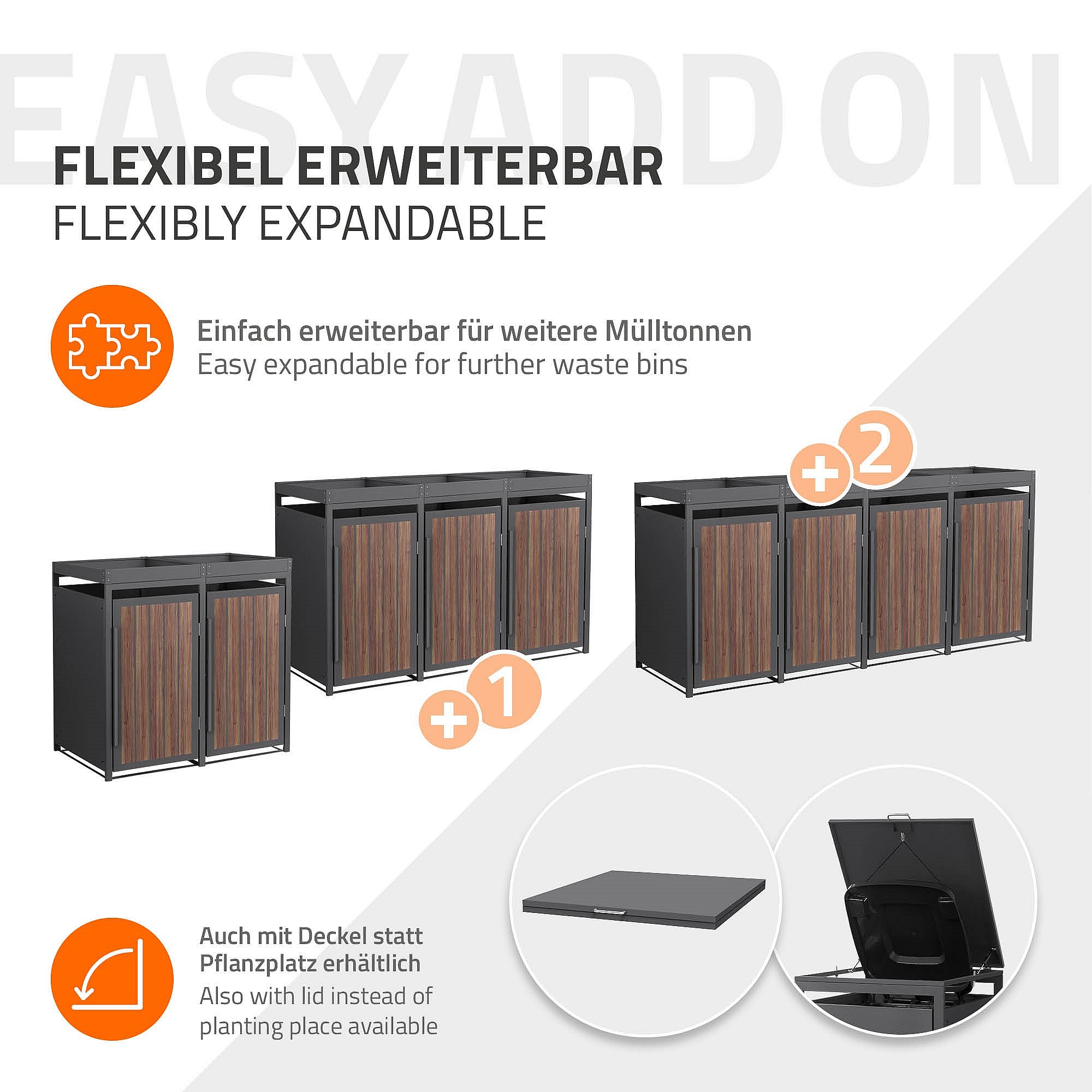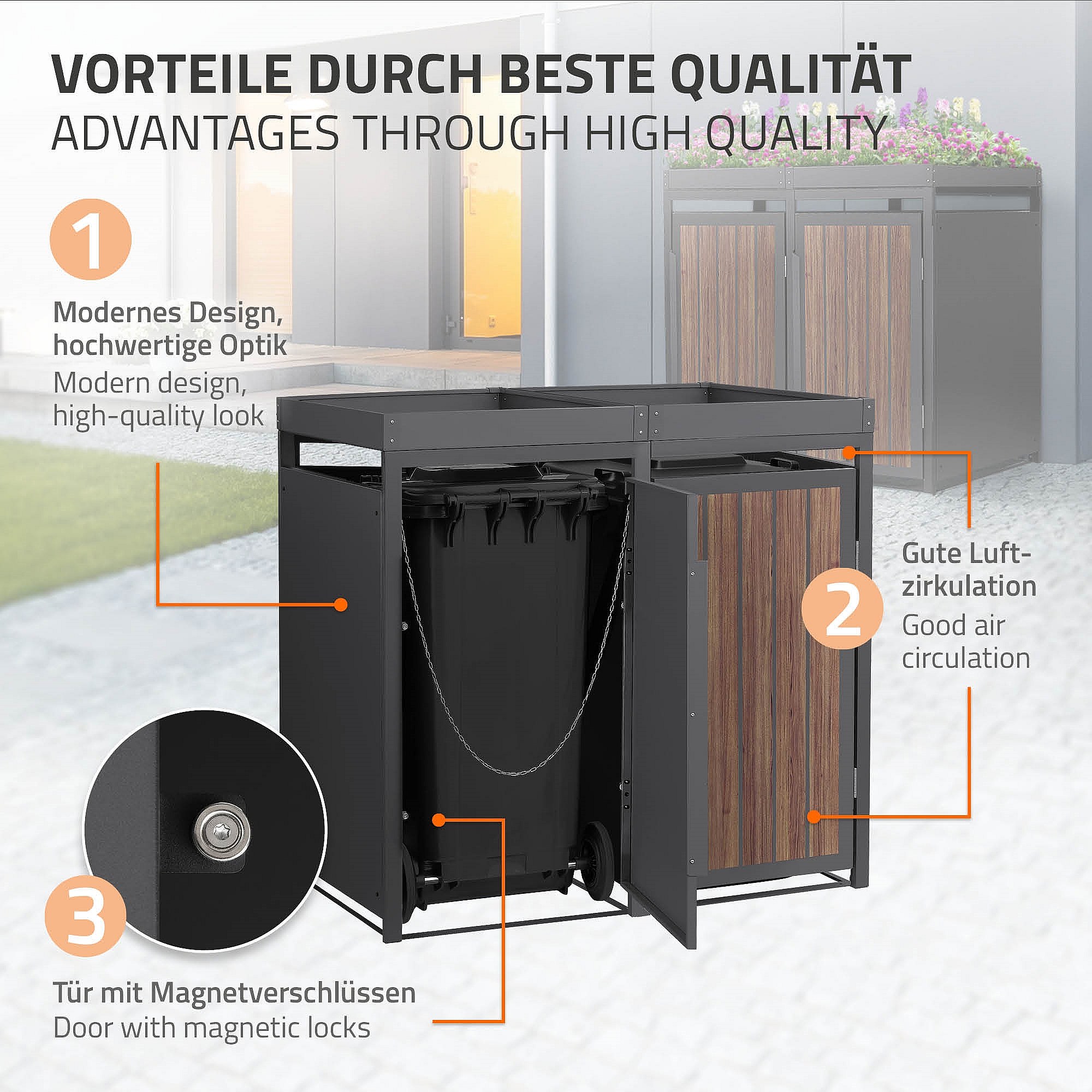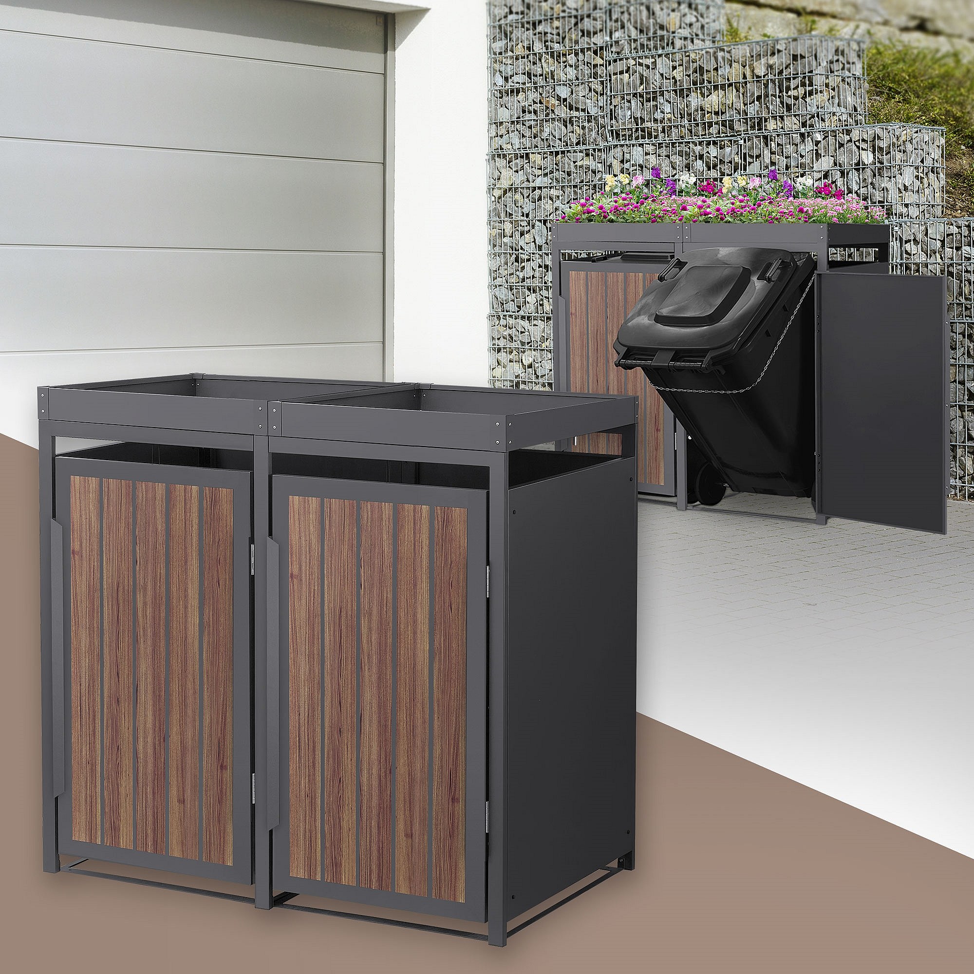 Abri pour 2 poubelles 132x80x124cm capacité 240L en acier aspect bois foncé toit pour plantes et fleurs protection visuelle résistant aux intempéries