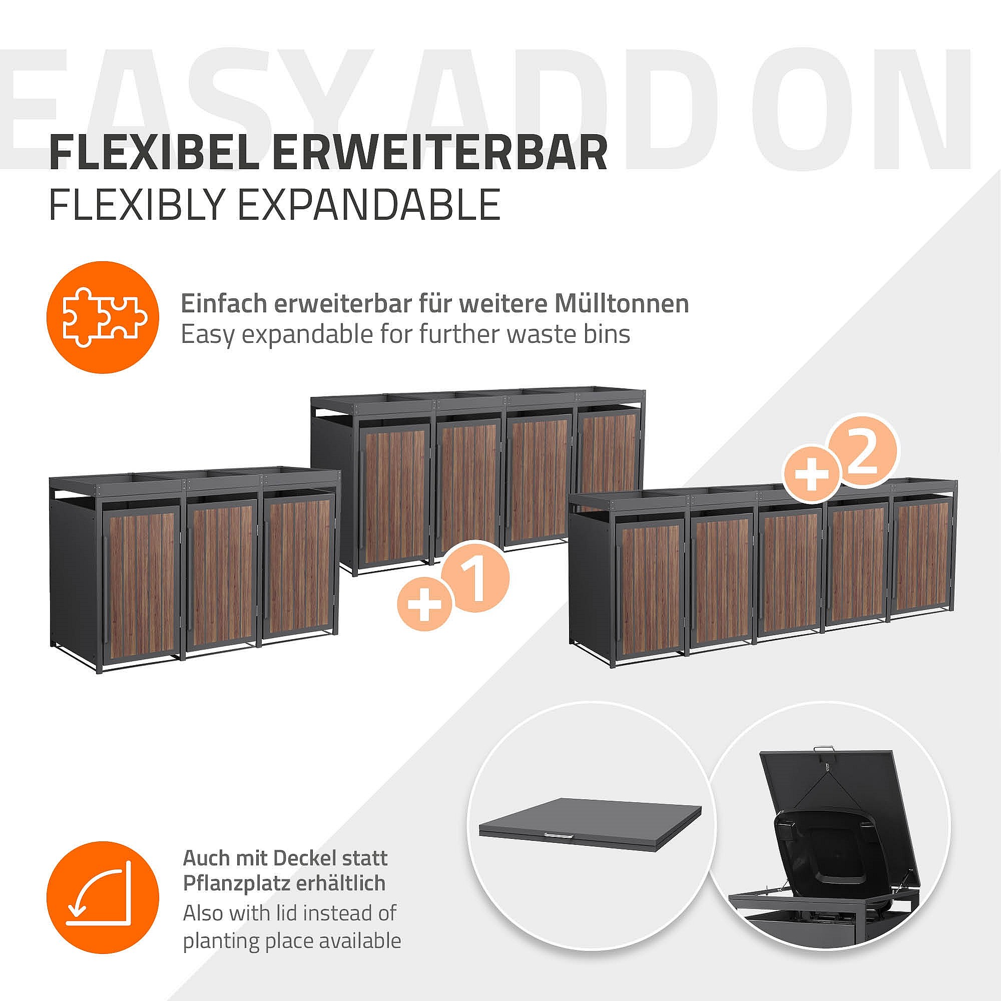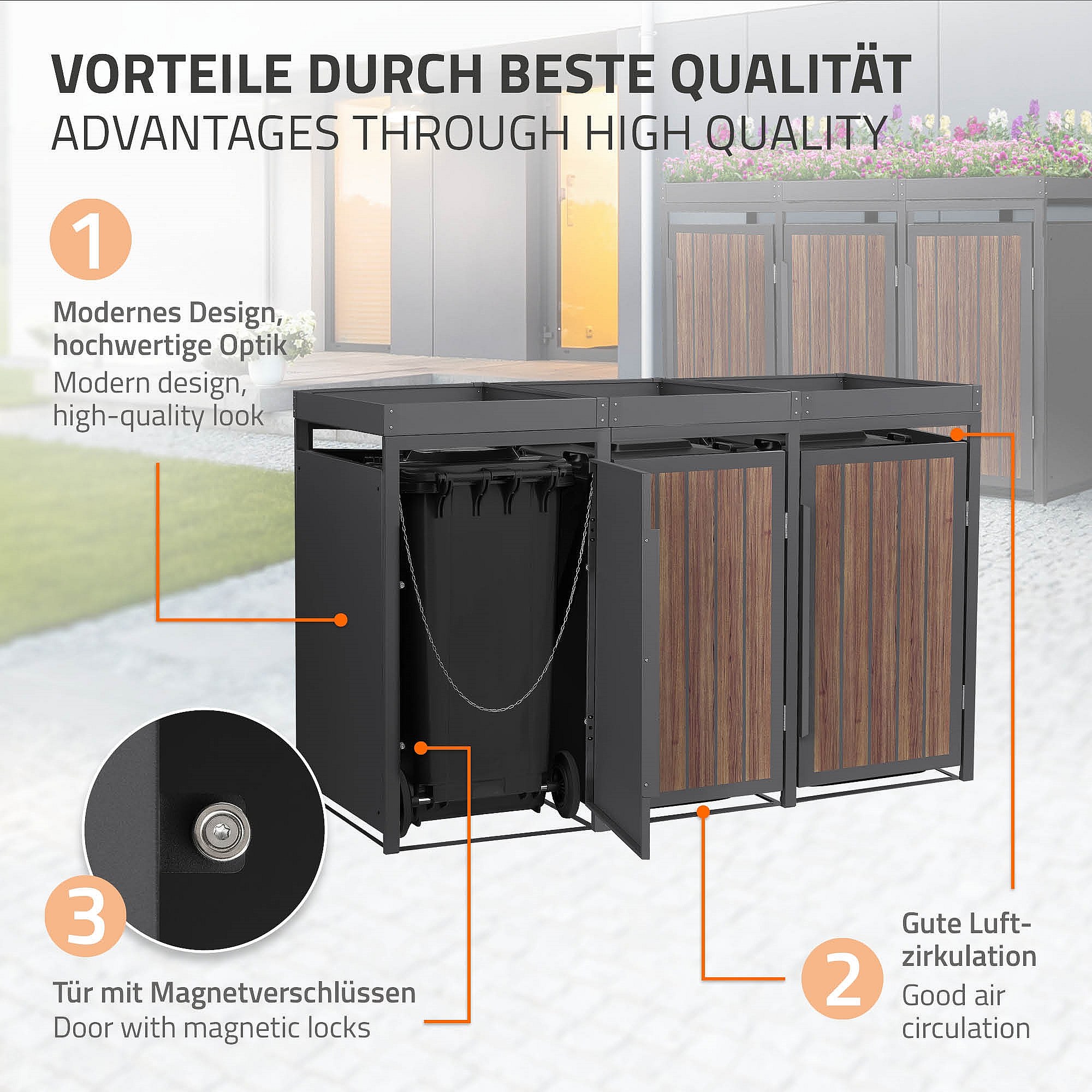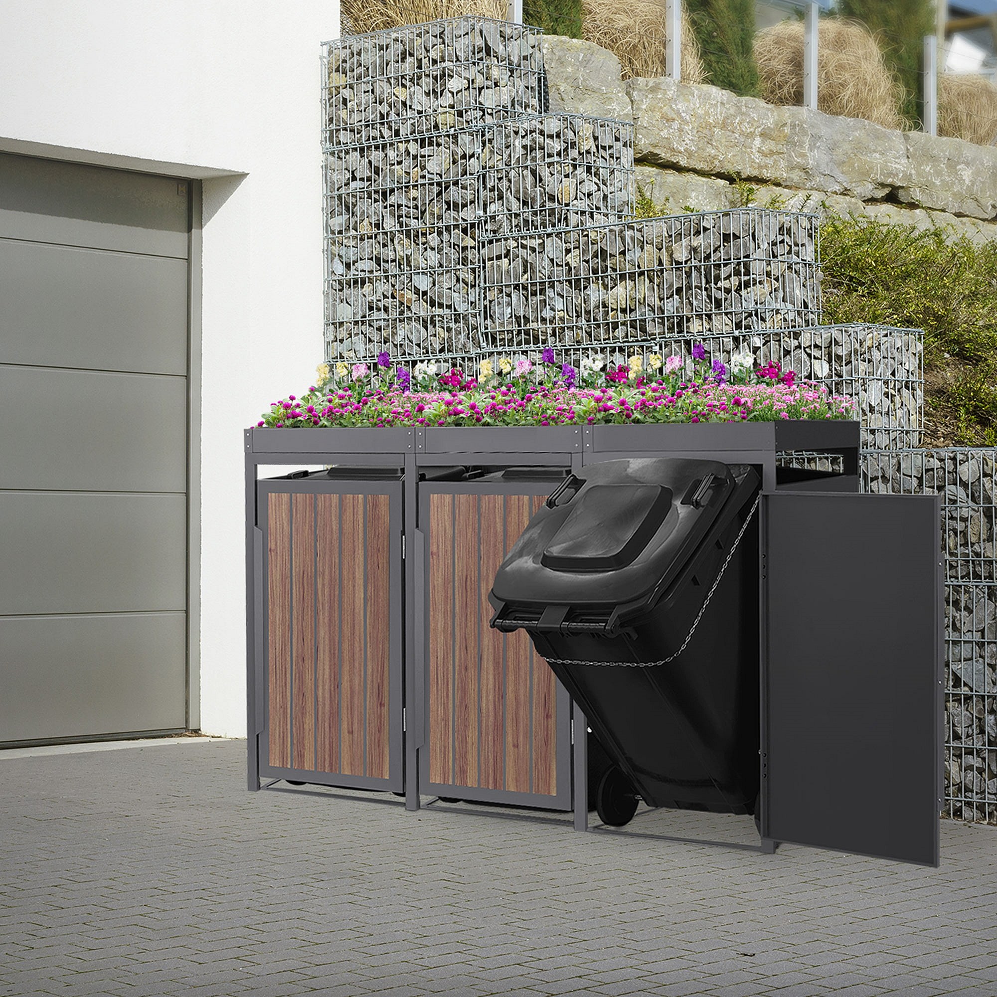 Abri pour 3 poubelles 196x80x124cm capacité 240L en acier aspect bois foncé toit pour plantes et fleurs protection visuelle résistant aux intempéries