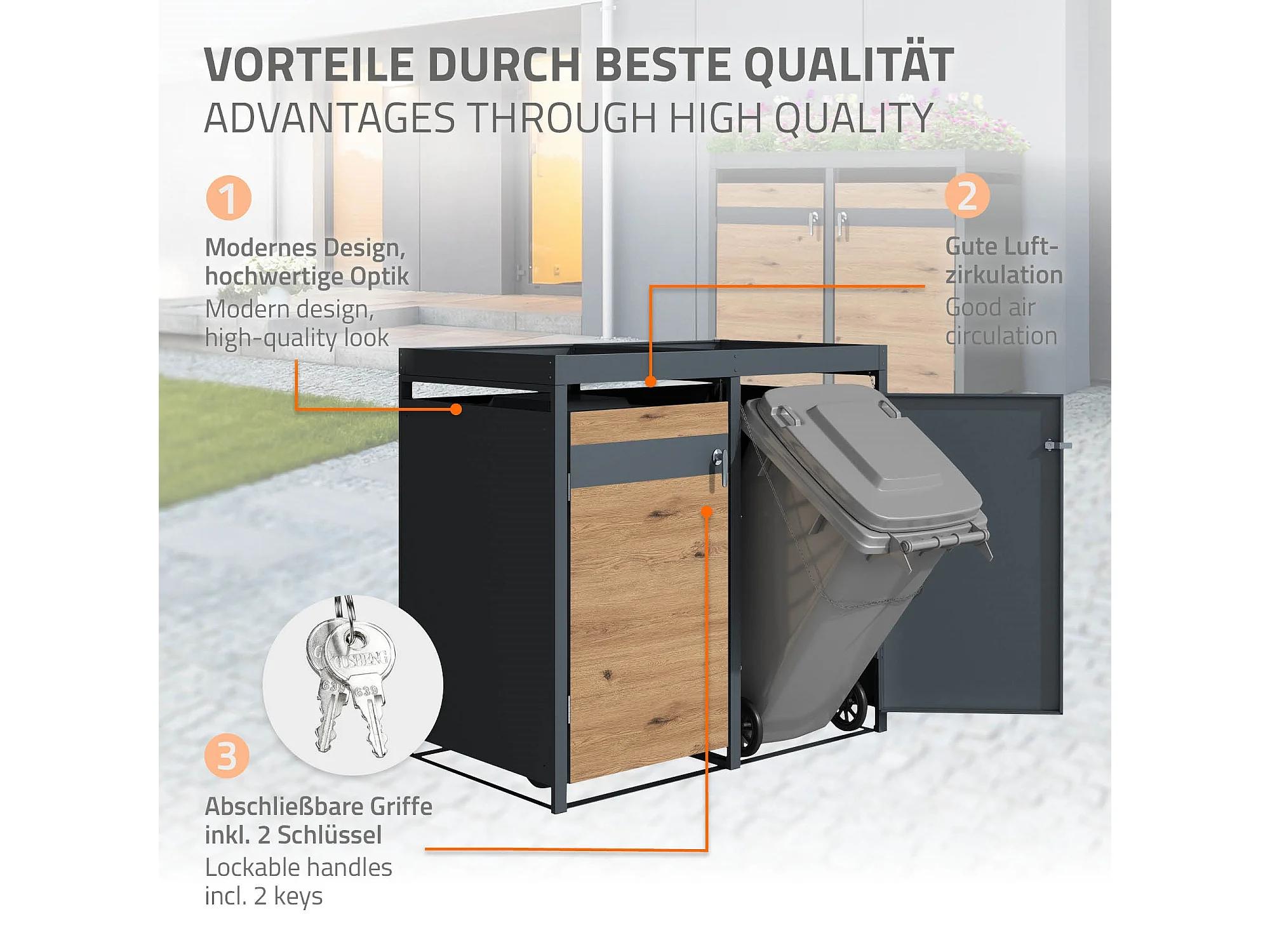 Abri pour 4 poubelles 264x80x124 cm capacité de 60L à 240L anthracite/aspect chêne en acier avec toit pour plantes/4 portes résistant aux intempéries