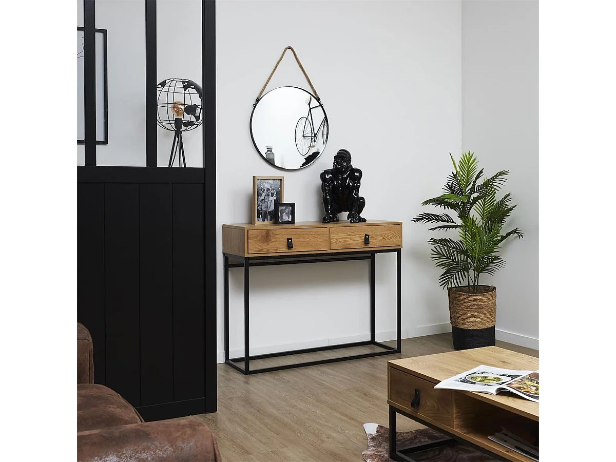 ABRIL - Console 2 Tiroirs Aspect Bois et Pieds Métal