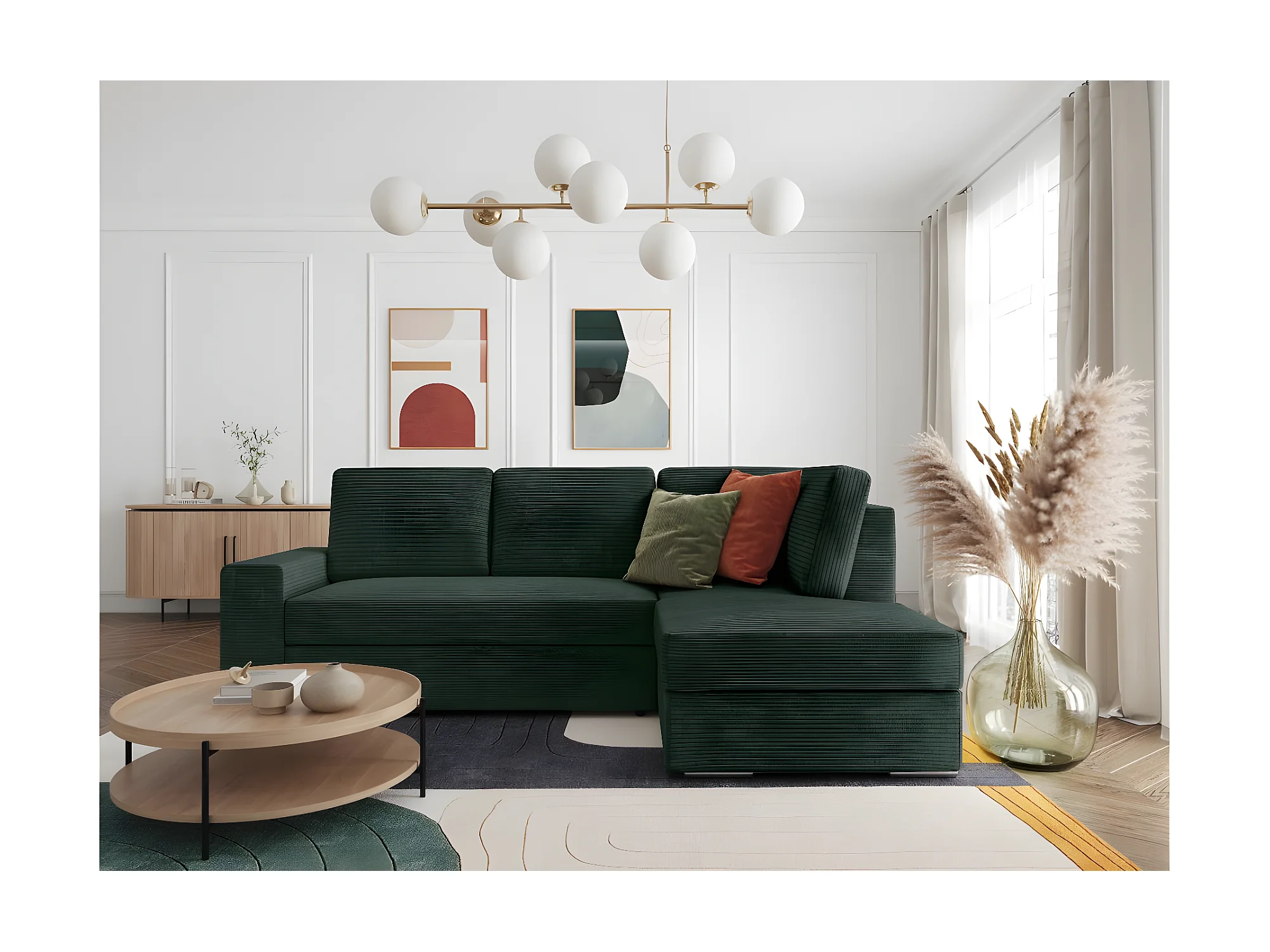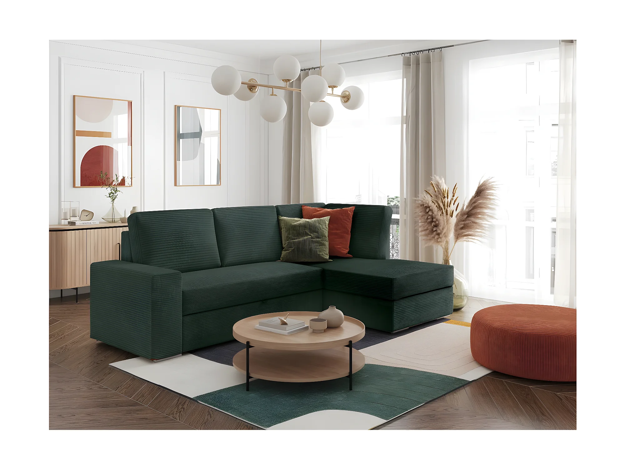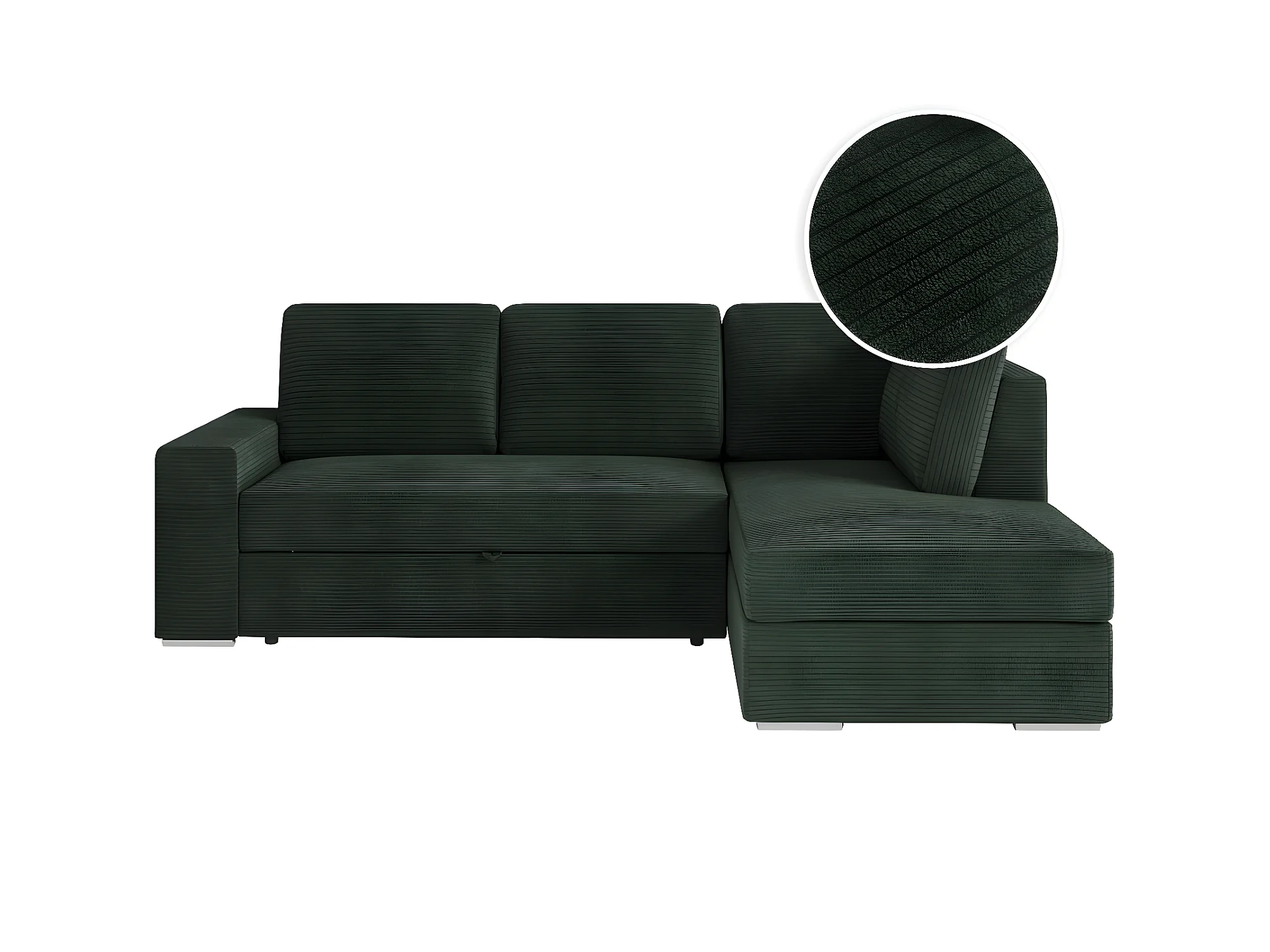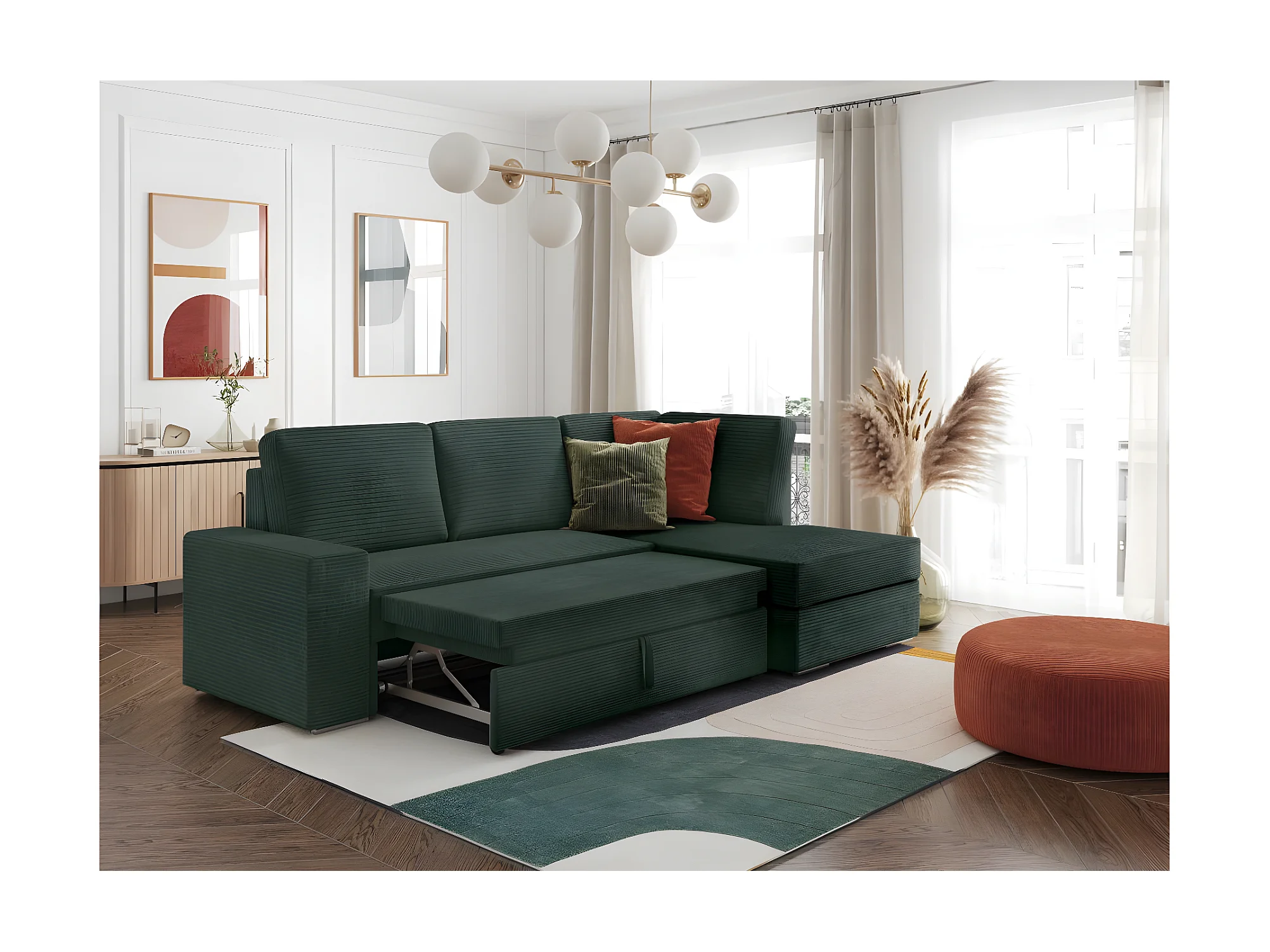 Canapé d'angle droit 3 places convertible Aden avec coffre en velours côtelé - Vert foncé - L246 x P174 x H96cm - Loungitude