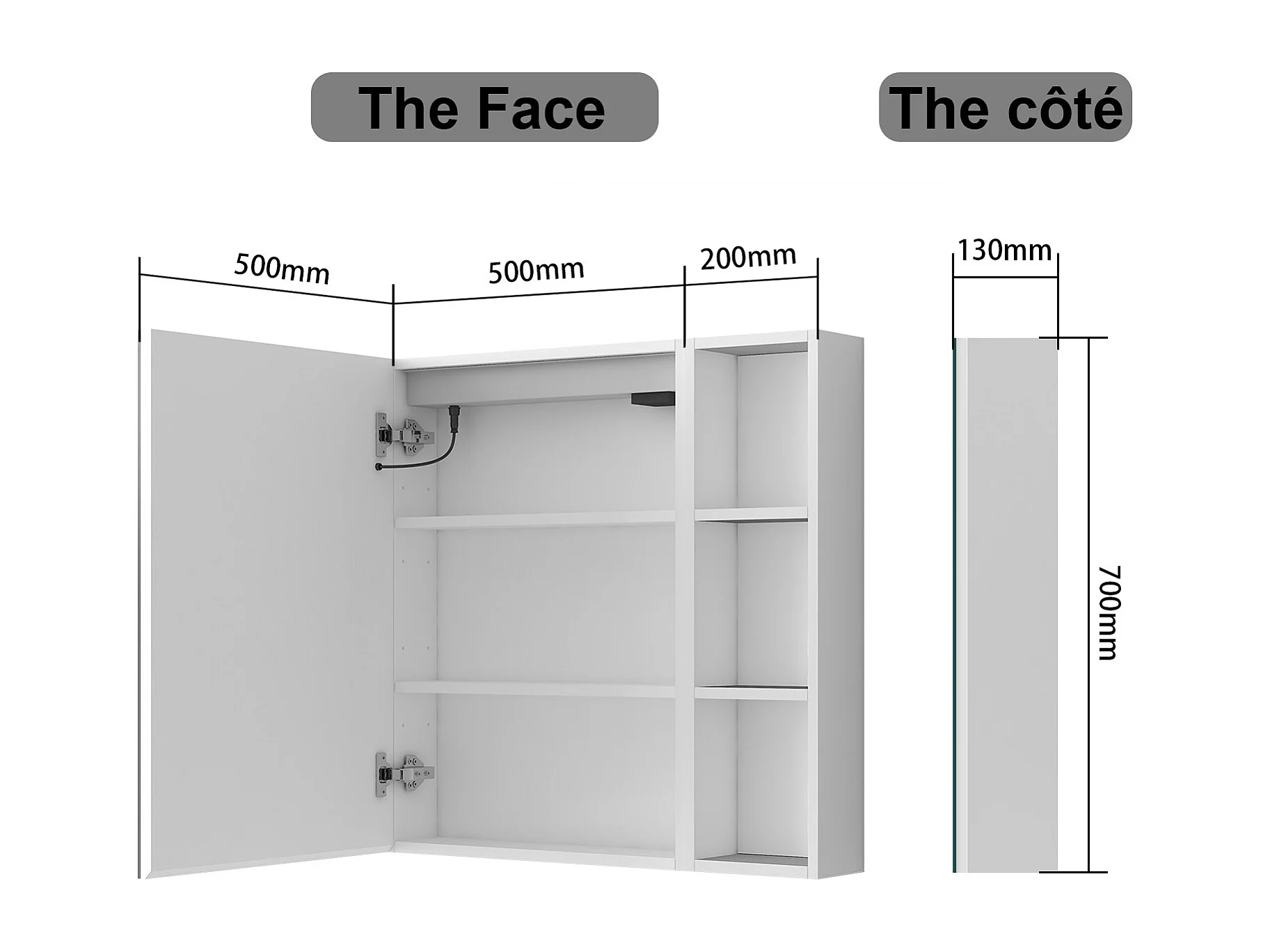 AICA Armoire murale de salle de bain LED, avec Prise Rasoir, 70x50cm, Anti-Buée + Tricolore, avec armoire latérale, Blanc