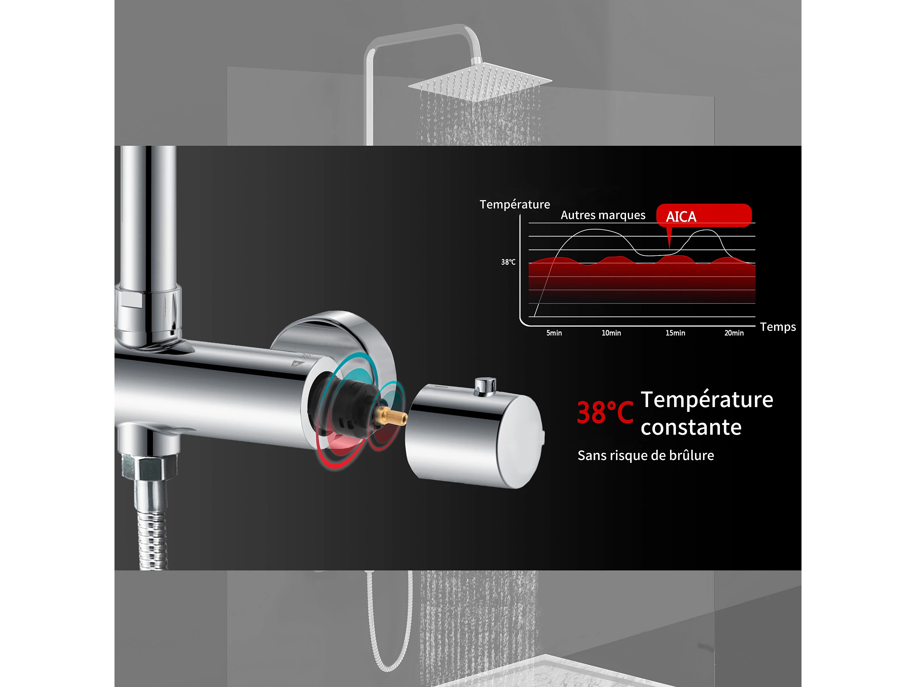 AICA colonne de douche thermostatique en laiton, douche de tête carrée, 3 jets