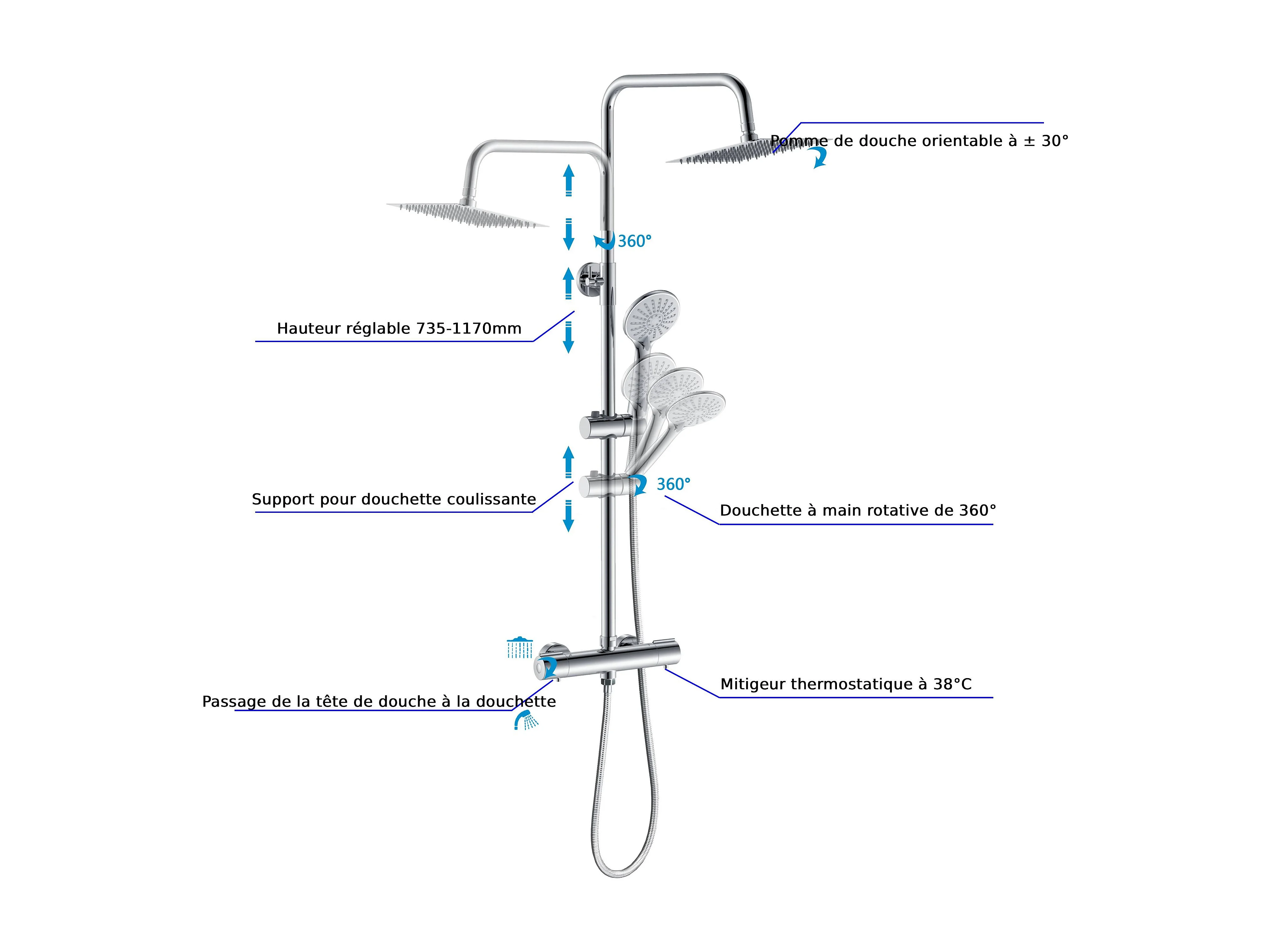 AICA Colonne de douche thermostatique chromé- Ensemble de douche en laiton- Réglable en hauteur