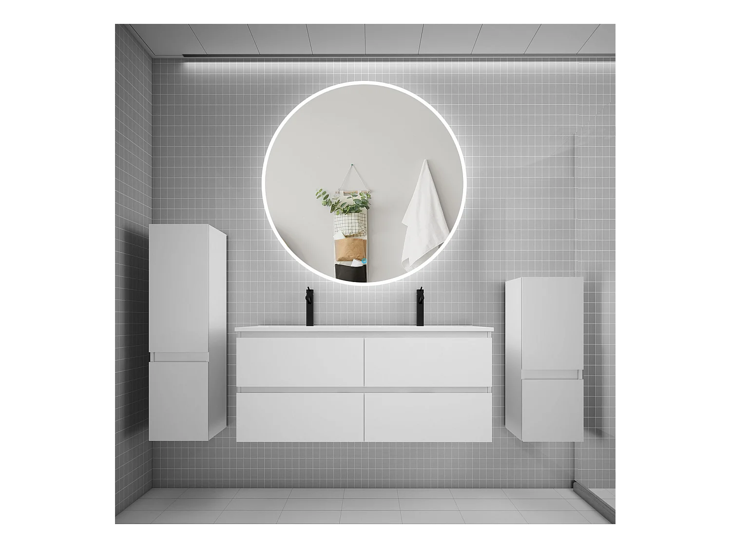 AICA Ensemble meuble de salle de bain double Vasque L.120cm 4 tiroirs + lavabo + LED Miroir Rond 120cm + 2*Colonne,Blanc