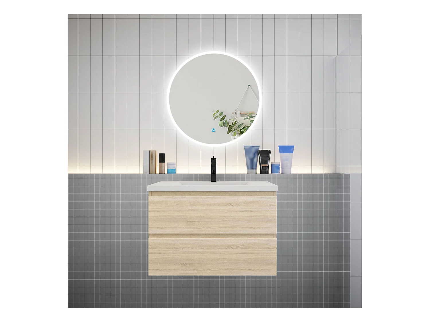 AICA Ensemble meuble de salle de bain Vasque L.79cm 2 tiroirs + lavabo + LED Miroir Rond 70cm, Chêne