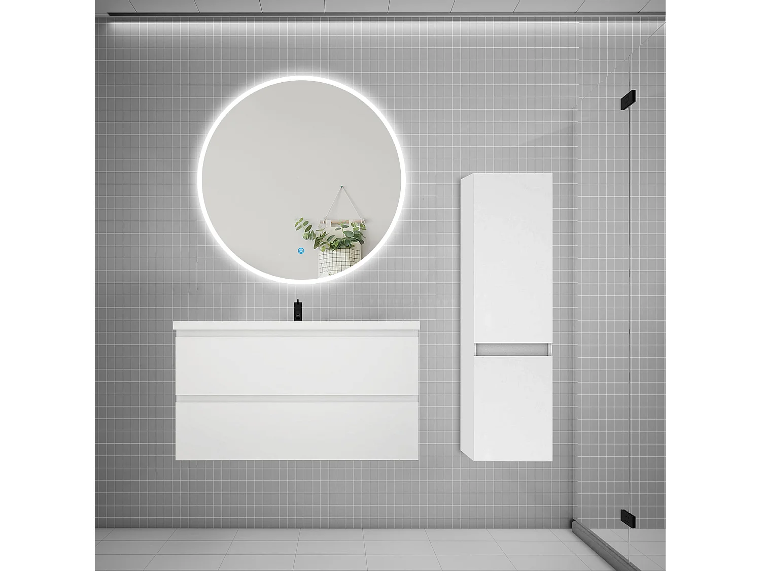 Ensemble meuble vasque L.99cm 2 tiroirs + lavabo + LED miroir rond 100cm + colonne A,blanc