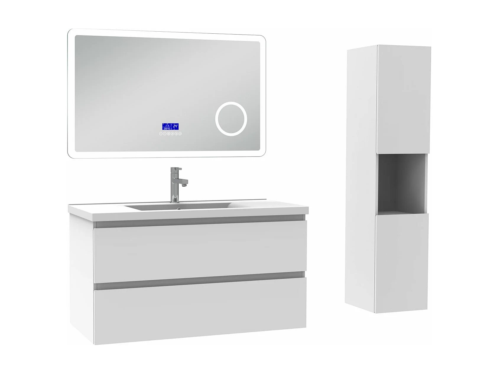 AICA Ensemble meuble Salle de Bain 100cm blanc avec colonne, simple vasque et Led miroir dimmable avec 3 couleurs, Bluetooth et 3X grossissement.