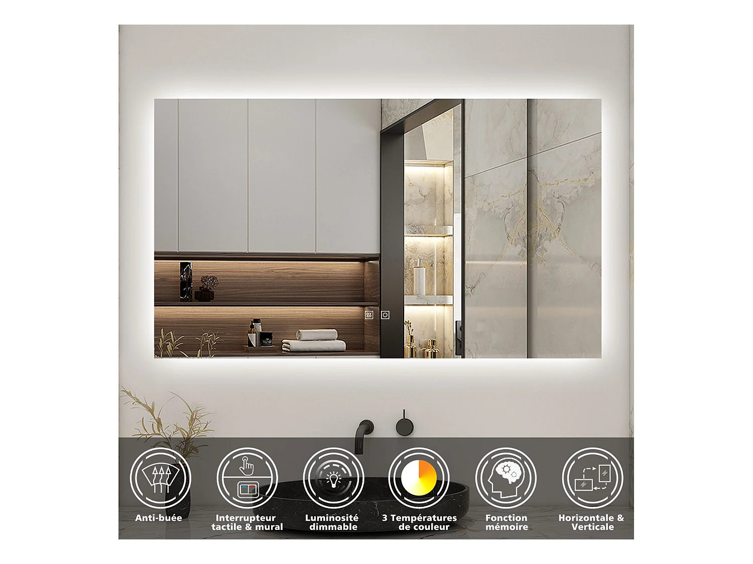 AICA Ensemble meuble Salle de Bain Blanc avec vasque L.100cm + Miroir rétro-éclairage & Tricolore 100x60cm