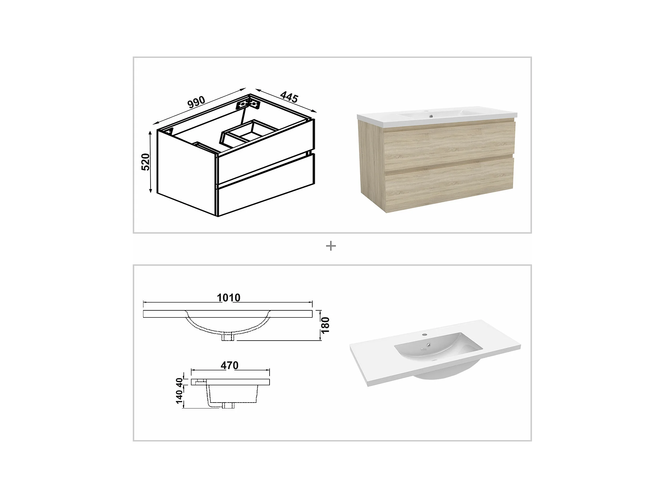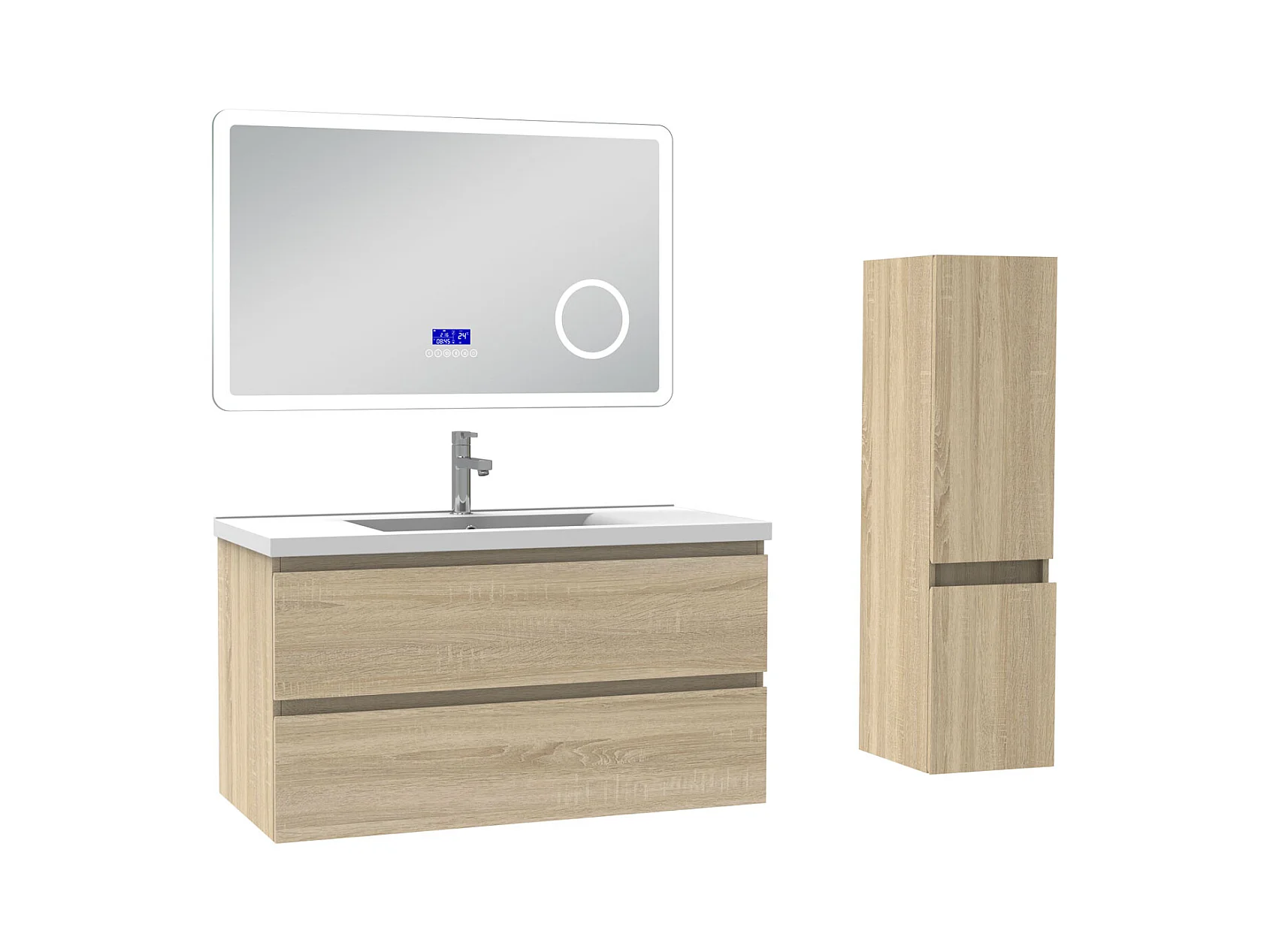 AICA Ensemble meuble Salle de Bain Chêne Wotan 100cm avec colonne, simple vasque et Led miroir dimmable avec 3 couleurs, Bluetooth et 3X grossissement.